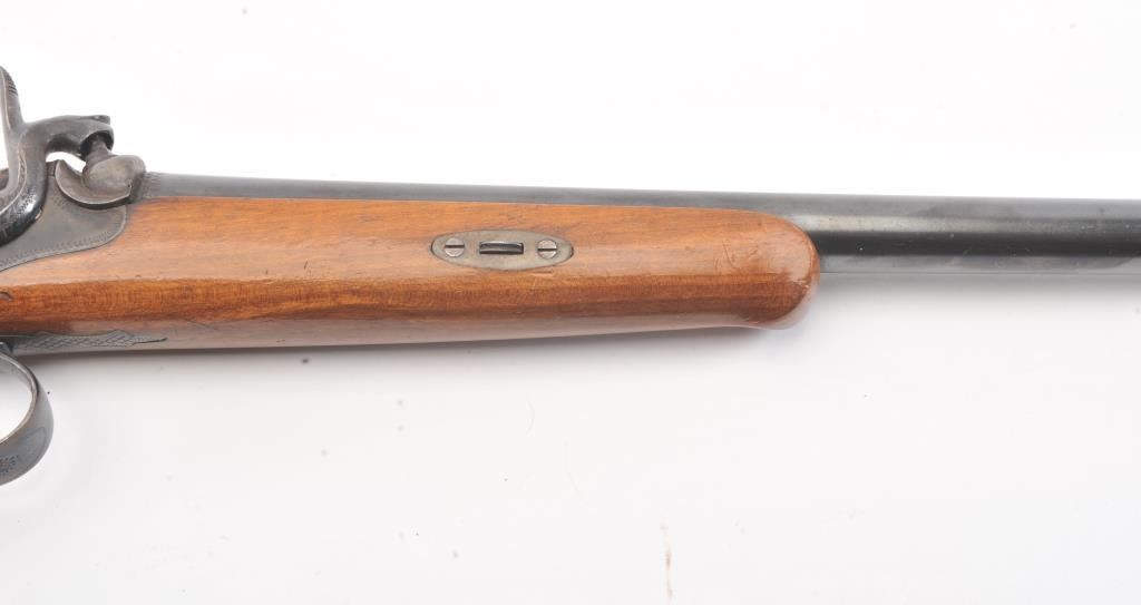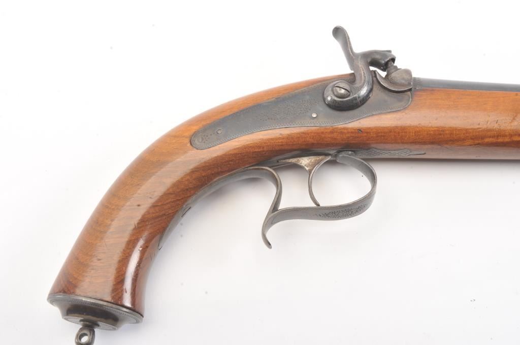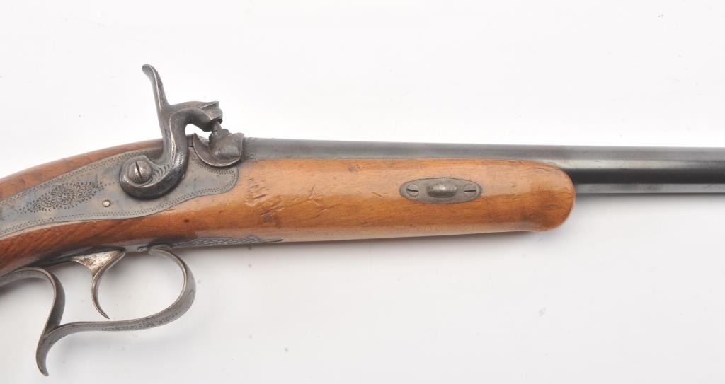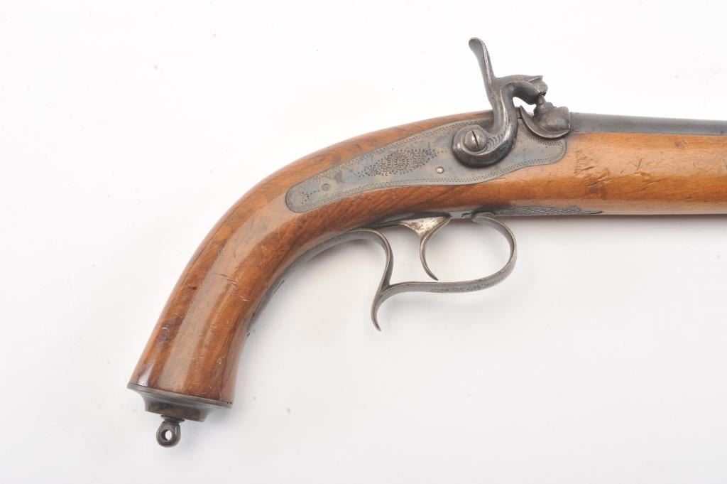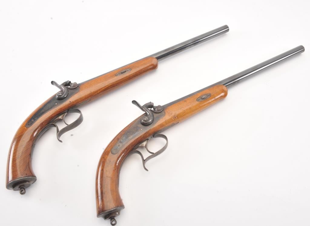 Pair of late percussion dueling pistols circa 1870s-1890s in 11mm rifled bores with 13" barrels and 19 1/4" overall. Blue and case colored finish with sparsely engraved back action locks. A small proof at the breech end of the barrel shows double headed eagle (Austrian or Russian). Light colored plain wood stocks retaining most of original varnish. Fine to excellent condition overall retaining 95%-98% original blue and rainbowcase colors. The lack of sights indicate intended for dueling which was a tradition carried into the 20th century in Argentina and parts of Latin America. (Antique) Est.: $700-$1400