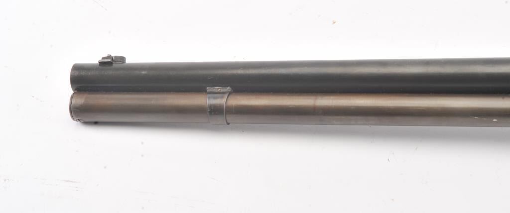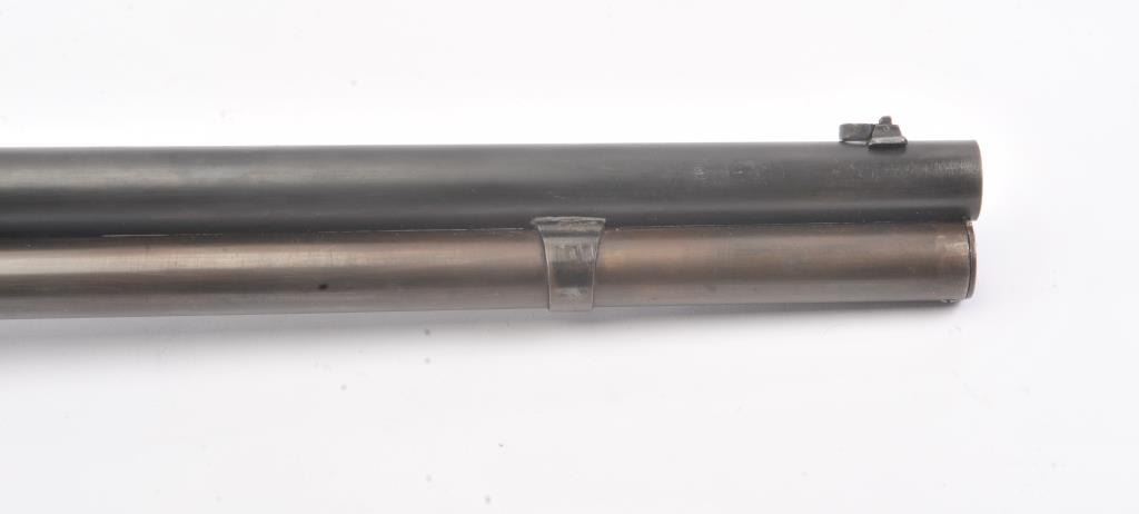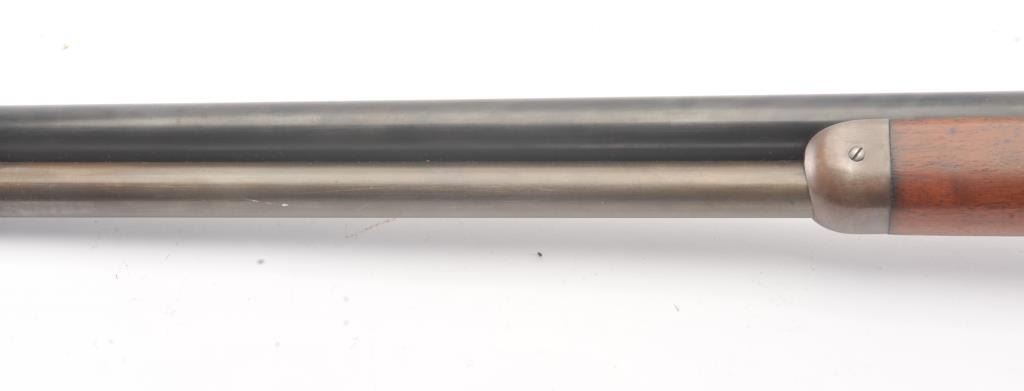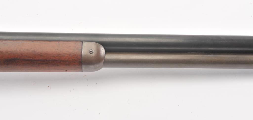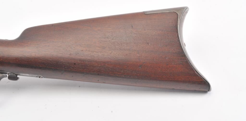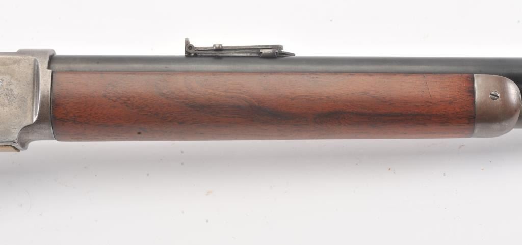 Winchester Model 1876 Special Order Rifle in .45-60 caliber with a 28” round barrel, full mag, rifle butt and set trigger. Received in ware house Feb 7, 1882, shipped April 8, 1882 ro order #32371 with factory letterconfirming set trigger, caliber, but listed as octagon barrel which may be an error in record. The barrel has been re-blued and remarked and the tube and band are restorations. The frame has been cleaned anddust cover replaced. The wood has been cleaned. Express type rear sight and beech type globe folding front sight. The bore is bright with strong rifling. S/N 22000 with screwed down dust cover rail. Est.:$1750-$3500