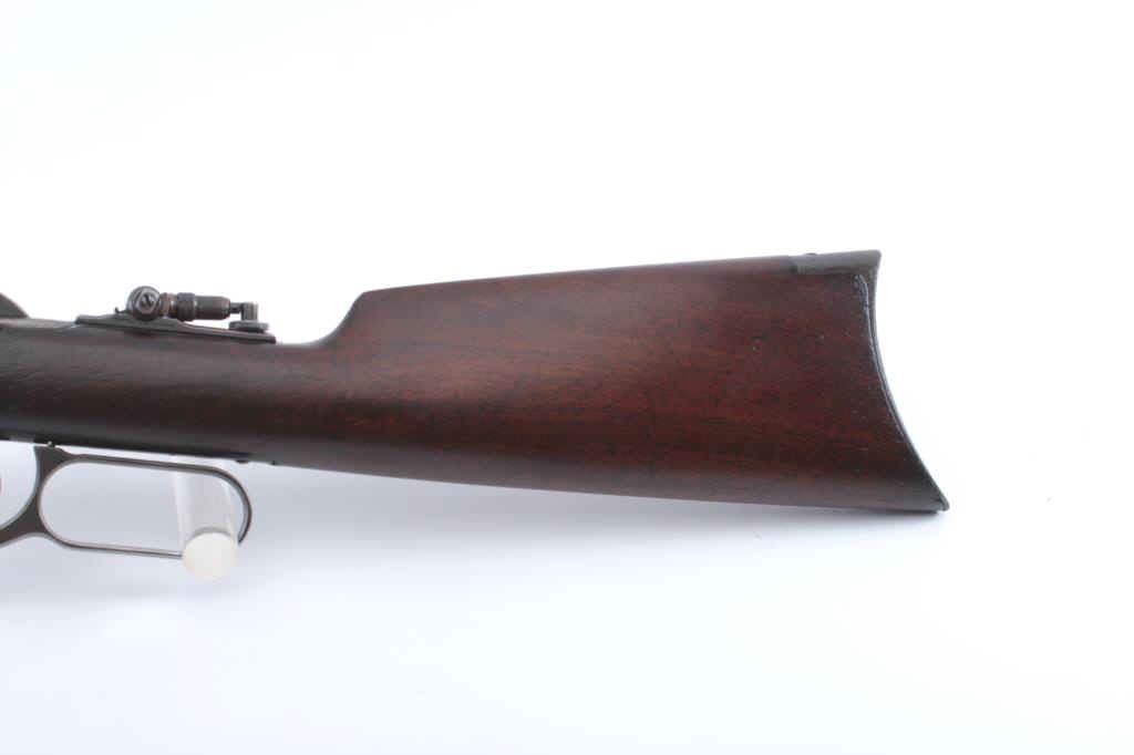 Winchester Model 1894 Special Order Takedown rifle in .25-35 caliber with a 26” round barrel, full mag, and rifle butt, S/N 11410 made in Klondike rifle era 1894 and among the earliest takedowns 20%-30% original bluewith toning to brown and patina showing light to slightly heavy rust and pitting with some cleaning. The barrel address is short and far forward like early special order rifles and slightly light. Plug in rear sight withmarble tang sight. The wood is good with a slight hairline crack at the right wrist and small losses. The action is good and the bore is slight rough with corrosion but pronounced rifling. Early model 94s withspecial features are seldom found. (Antique) Est.: $800-$1600