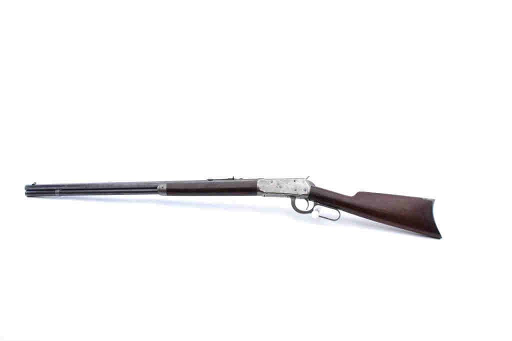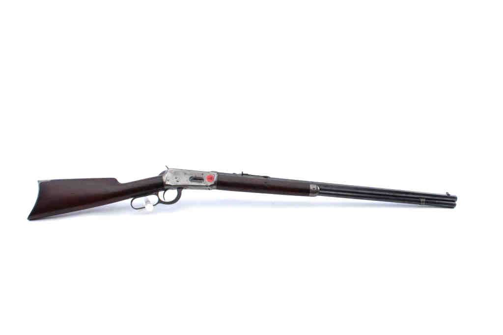 Winchester Model 1894 Lever Action Rifle in .30-30 caliber with a 26” octagon barrel, full mag and rifle butt, S/N 580190 and made in about 1911. This rifle shows 75%-85% blue on the barrel and magazine tube with minorlight rust and erosion. The frame has gone to a gray patina. Good markings. The stocks are good with a couple of deep gouges and minor dings and mark. Good wood to metal fit. The action is good. The bore shows some erosionbut rifling is fairly strong and may scrub up. (C&R) Est.: $700-$1400