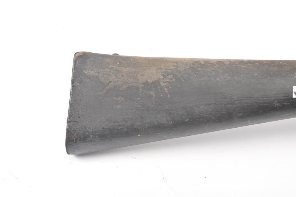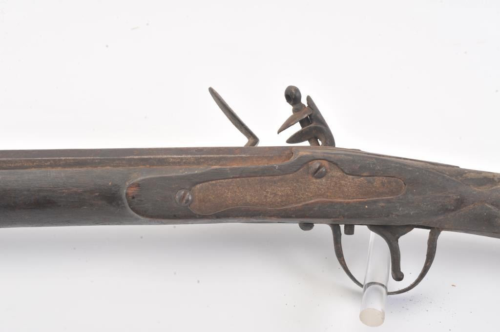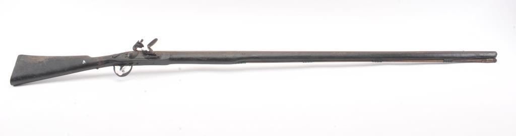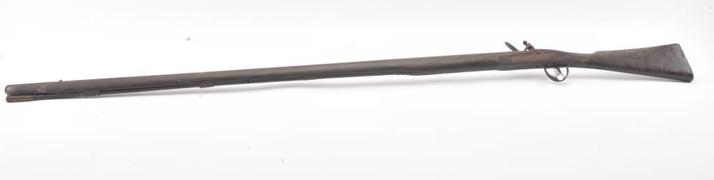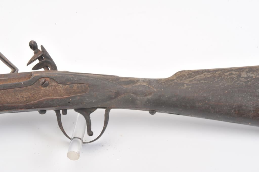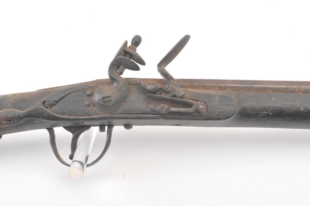 Mid to late 19th century flintlock trade musket showing British proofs and simple iron mounts with screwed in sheet metal butt plate. London in block letters on center of lock. Mark behind lock is illegible. In theblack and uncleaned (Attic find) condition. Measures 66" overall with a 50" barrel in approximately .62 caliber smoothbore (thin barrel). Period ramrod with cart case as tip. Many of this type trade to Northwest andCanada circa 1850 to turn of the century. (Antique) Est.: $600-$1200