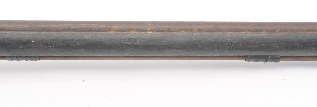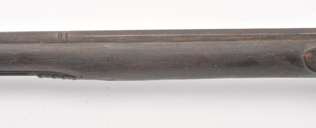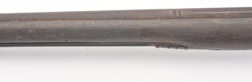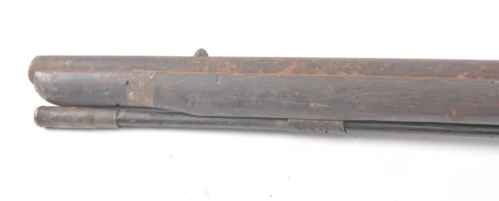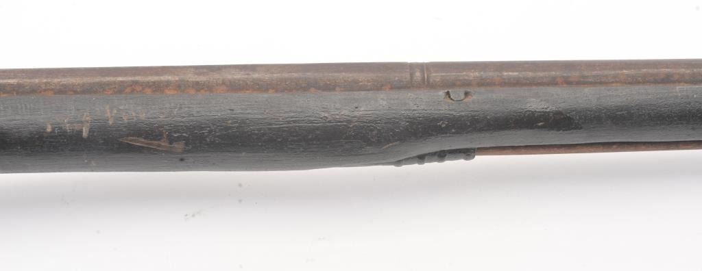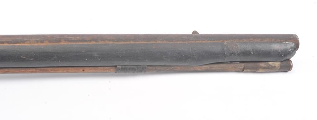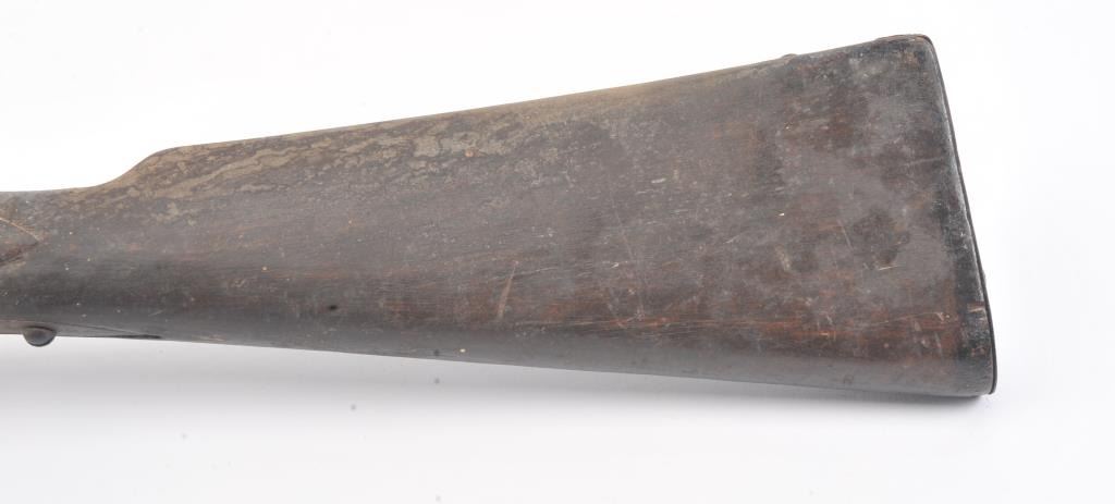 Mid to late 19th century flintlock trade musket showing British proofs and simple iron mounts with screwed in sheet metal butt plate. London in block letters on center of lock. Mark behind lock is illegible. In theblack and uncleaned (Attic find) condition. Measures 66" overall with a 50" barrel in approximately .62 caliber smoothbore (thin barrel). Period ramrod with cart case as tip. Many of this type trade to Northwest andCanada circa 1850 to turn of the century. (Antique) Est.: $600-$1200