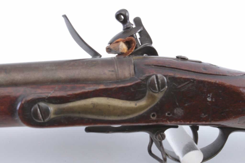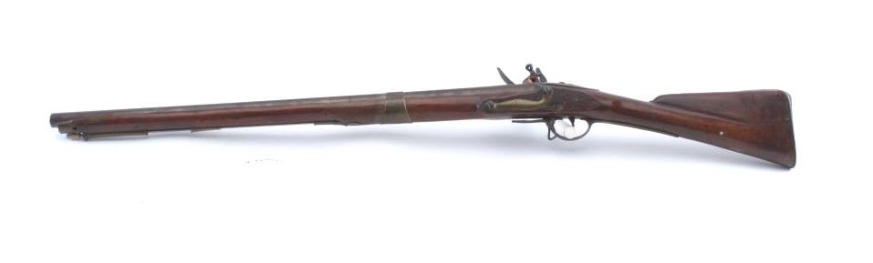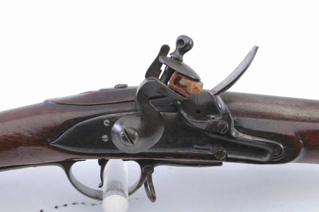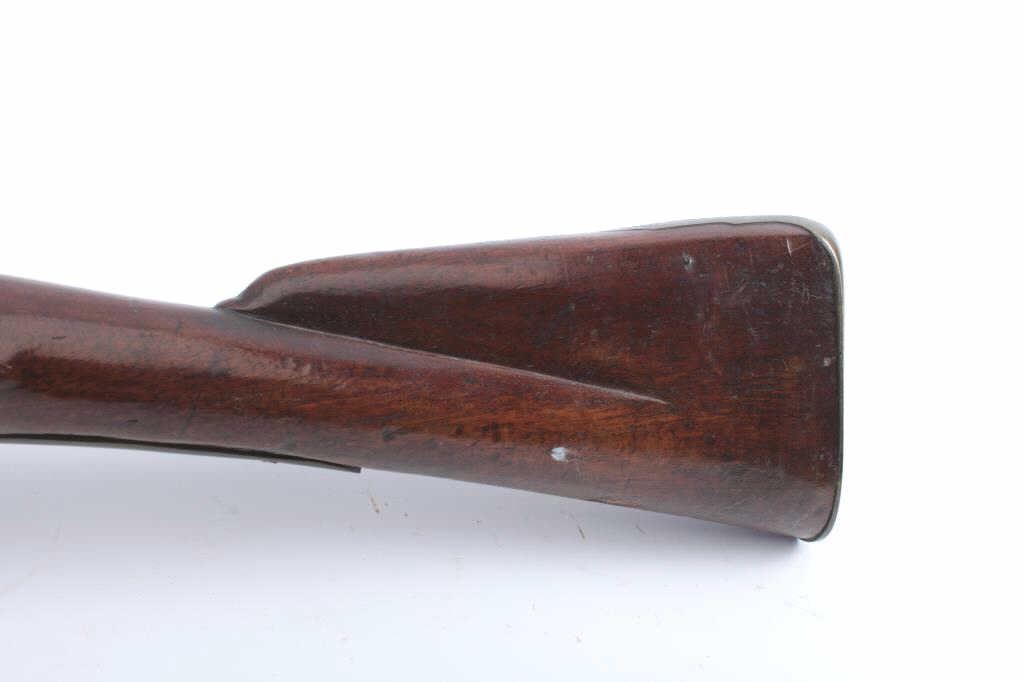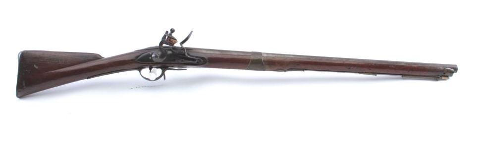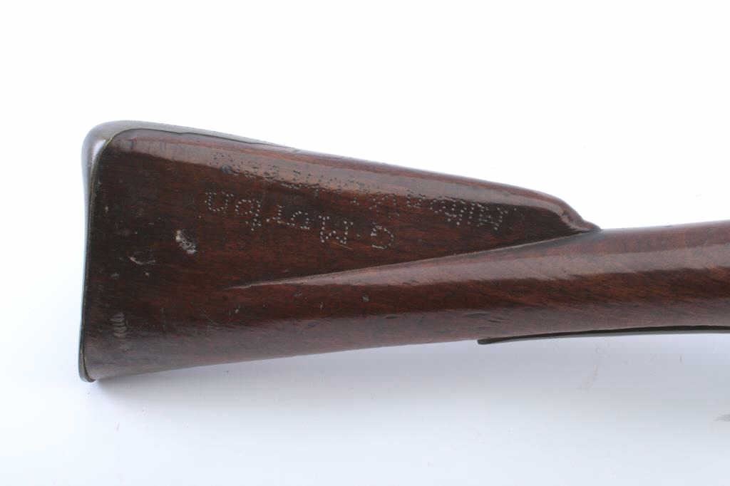 Interesting British Musket with lock marked "Pritchert" showing British proofs in .69 caliber with S shaped side plate circa 1770s-90s in style of and patterned after brown bess. Measures 46 1/2" overall with a30" barrel. Shortened during period of use with engraved band added. The stock marked "G. Murton, Millon Volunteer" on buttstock and "Somerset 2112" engraved on butt plate. "K.V. 11" carved behind the tang. Minordings, mars and losses to the stock. Good overall. (Antique) Est.: $600-$1200