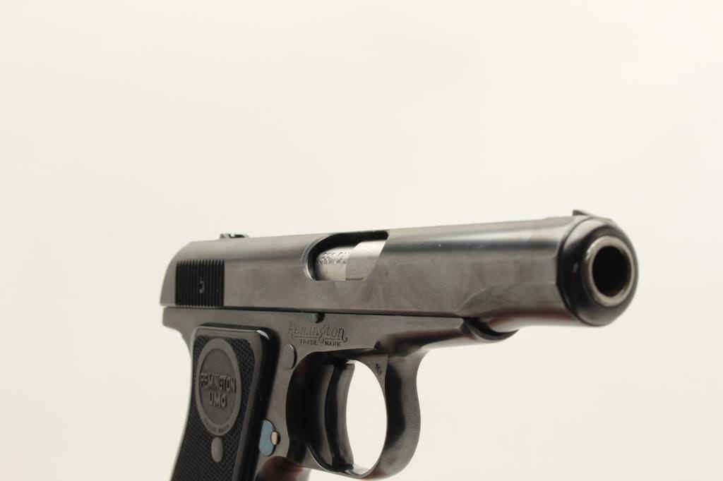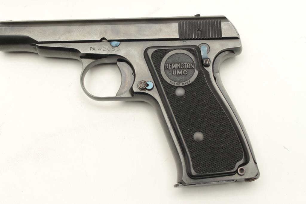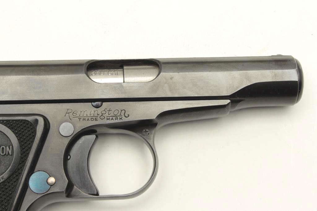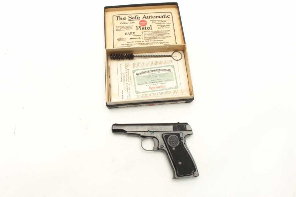 Remington Model 51 semi-automatic pistol, .380 caliber, 3.25” barrel, blued finish, checkered black grips, S/N PA42055, in overall excellent condition showing minimal use or handling, fine bore, crisp action fine grips; accompanied by factory cardboard box displaying minor repair and with instructions sheet, cleaning brush and Gun Ownership Certificate issued to farmers Merchants Bank, Marinette, Wisc. (C&R). Est.:$2000-4000