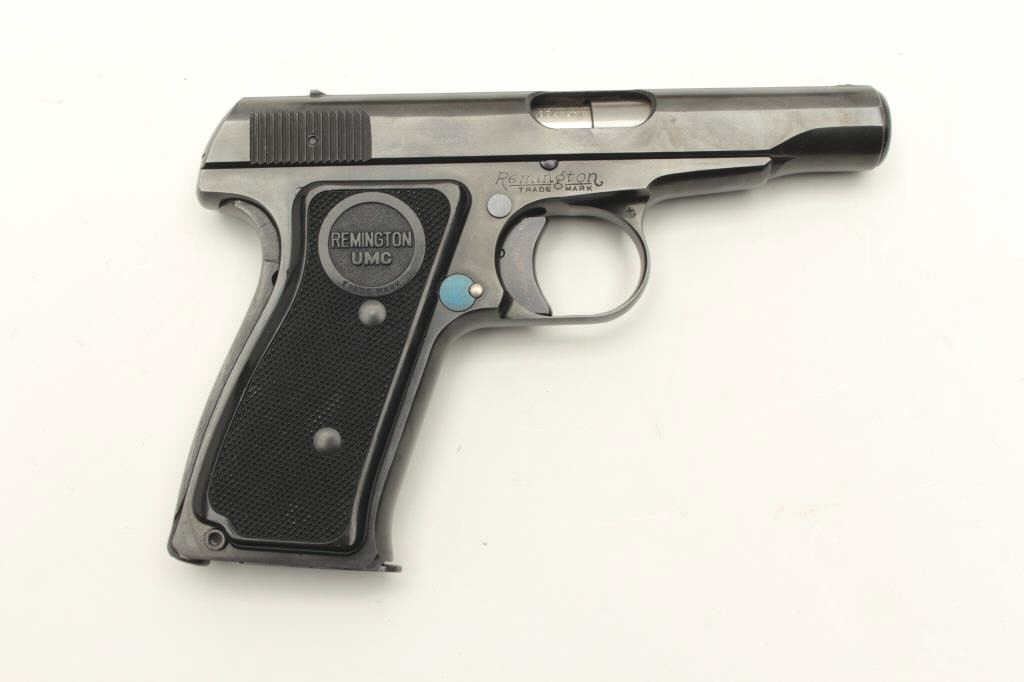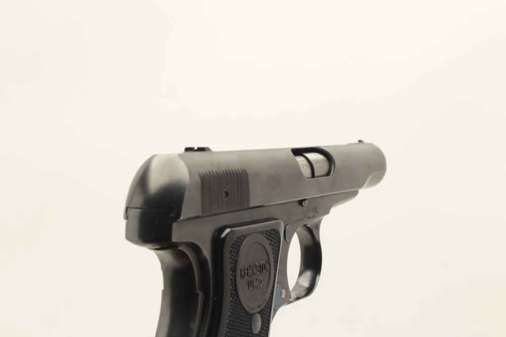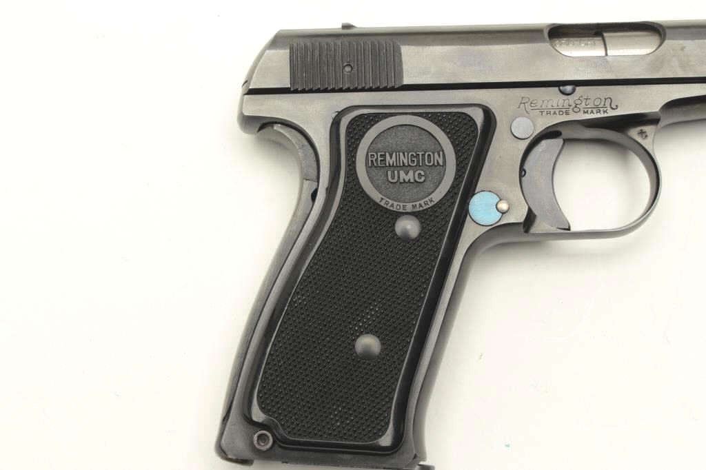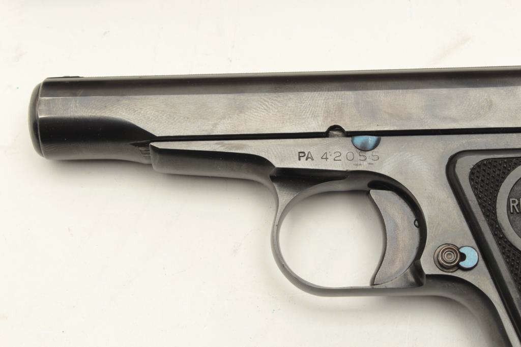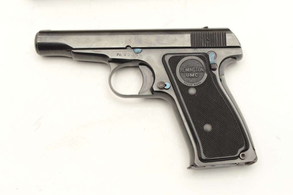 Remington Model 51 semi-automatic pistol, .380 caliber, 3.25” barrel, blued finish, checkered black grips, S/N PA42055, in overall excellent condition showing minimal use or handling, fine bore, crisp action fine grips; accompanied by factory cardboard box displaying minor repair and with instructions sheet, cleaning brush and Gun Ownership Certificate issued to farmers Merchants Bank, Marinette, Wisc. (C&R). Est.:$2000-4000