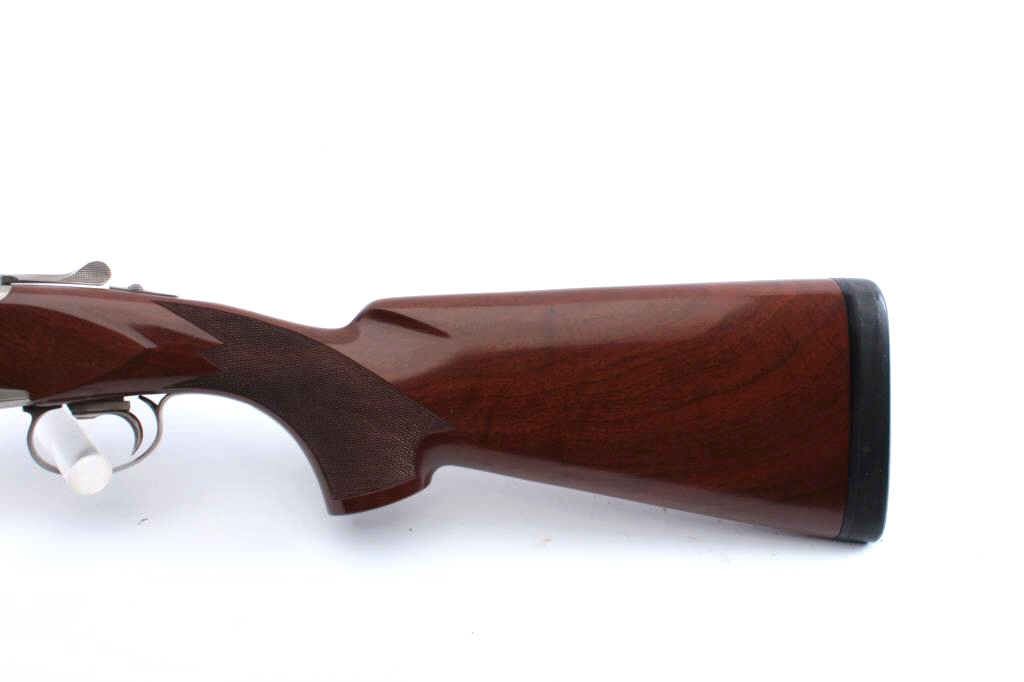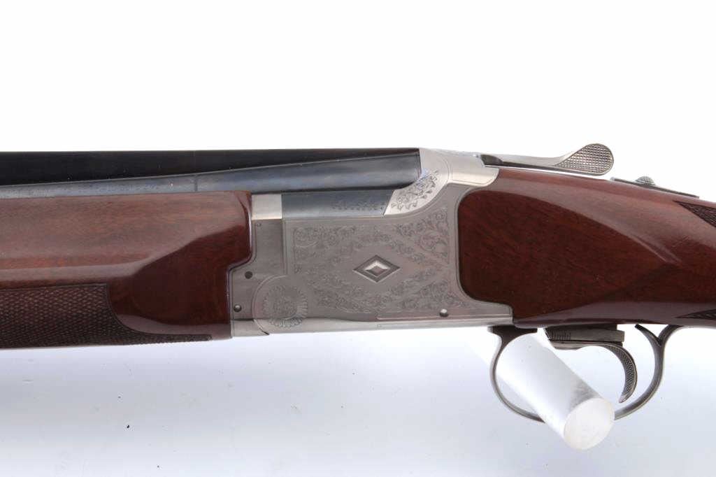 Winchester Model Diamond Grade Skeet O/U shotgun, DG284173E, .410 gauge, 2-1/2” chambers, 27-1/2” ventilated rib barrels, blue finish with engraved bright receiver, deluxe checkered wood stocks, hard rubberbutt pad, length of pull 14 3/8” with adjustable single trigger. This gun is in overall excellent condition showing approx. 99% original finish, minty bore, crisp action, sharp markings, fine wood stocks with black diamond inlaid at the top of the wrist. A beautiful gun and case. With factory luggage style lined compartment deluxe carry case. (Modern/PPT) Est.: $1,000-$2,000.