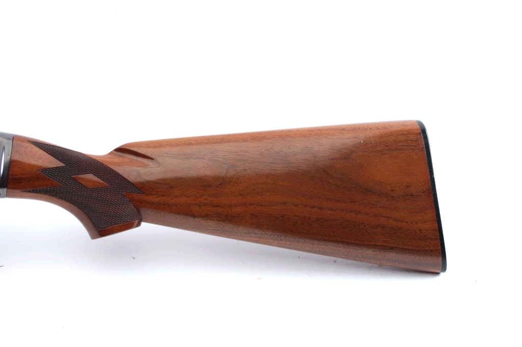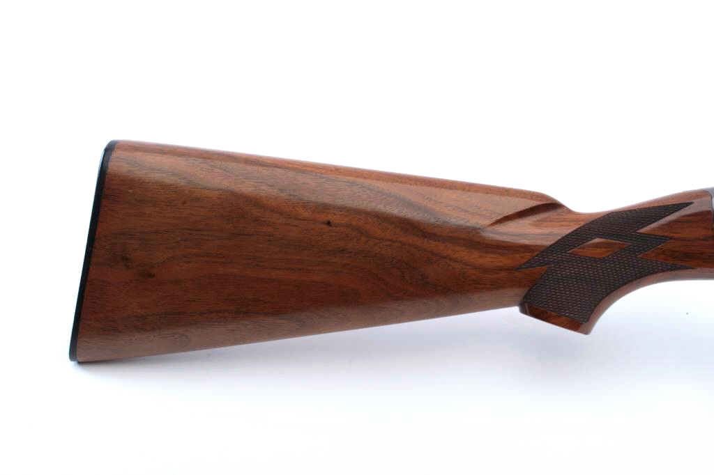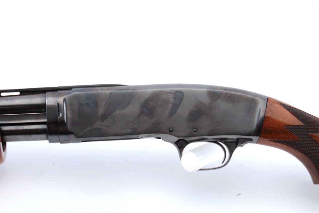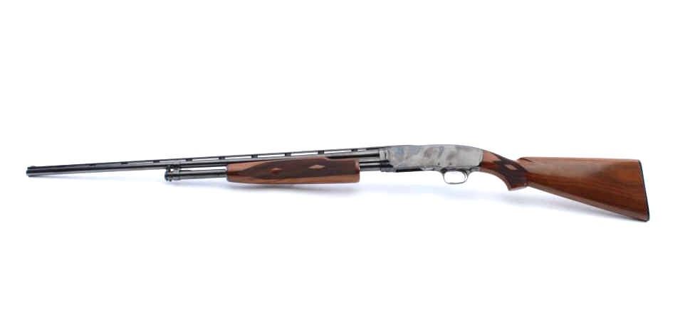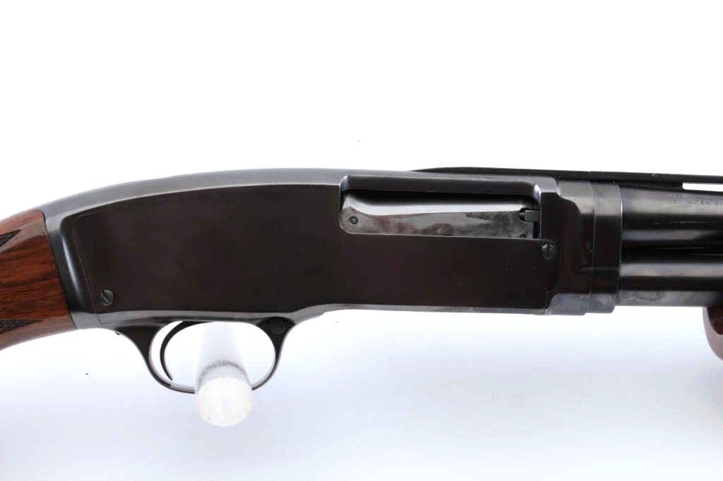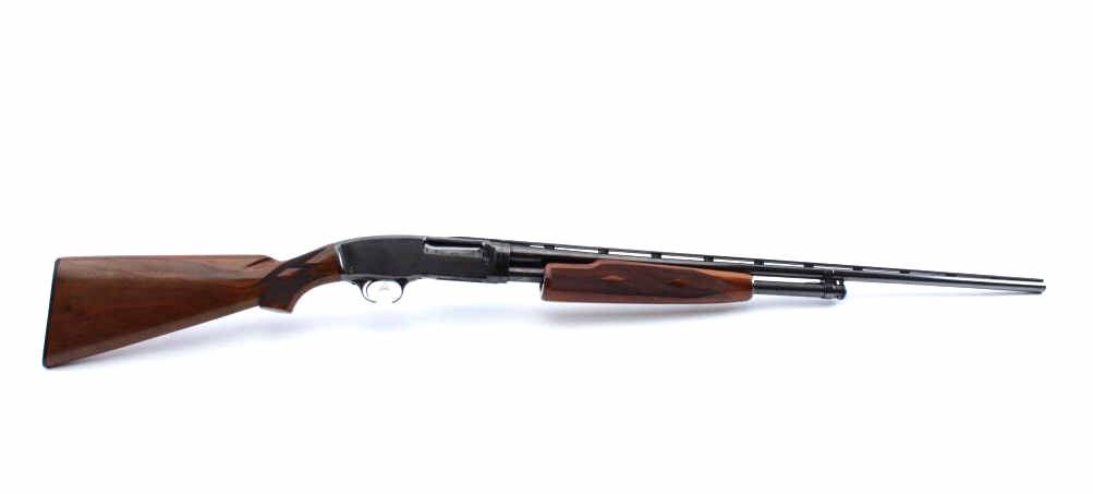 Winchester Model 42 pump shotgun, .410 gauge, Serial #91752. The shotgun is in fine overall condition with a 28” barrel with a full-length ventilated rib marked, “SIMMONS GUN SPECIALTIES” with a Modified choke.The metal surfaces retain nearly all of an old quality re-blue which was likely done by Simmons at the time the rib was applied. Additionally, the finely checkered skeet grade stocks were also done by Simmons. Thequality of the upgraded wood, the fit and the finish are outstanding, showing little use. The butt stock ends with a checkered plastic Winchester marked butt plate providing a 13 ¾” LOP. The bore is good, the action iscrisp and the markings are sharp on this desirable Model 42. Est.: $1,200-$2,400. (C+R).