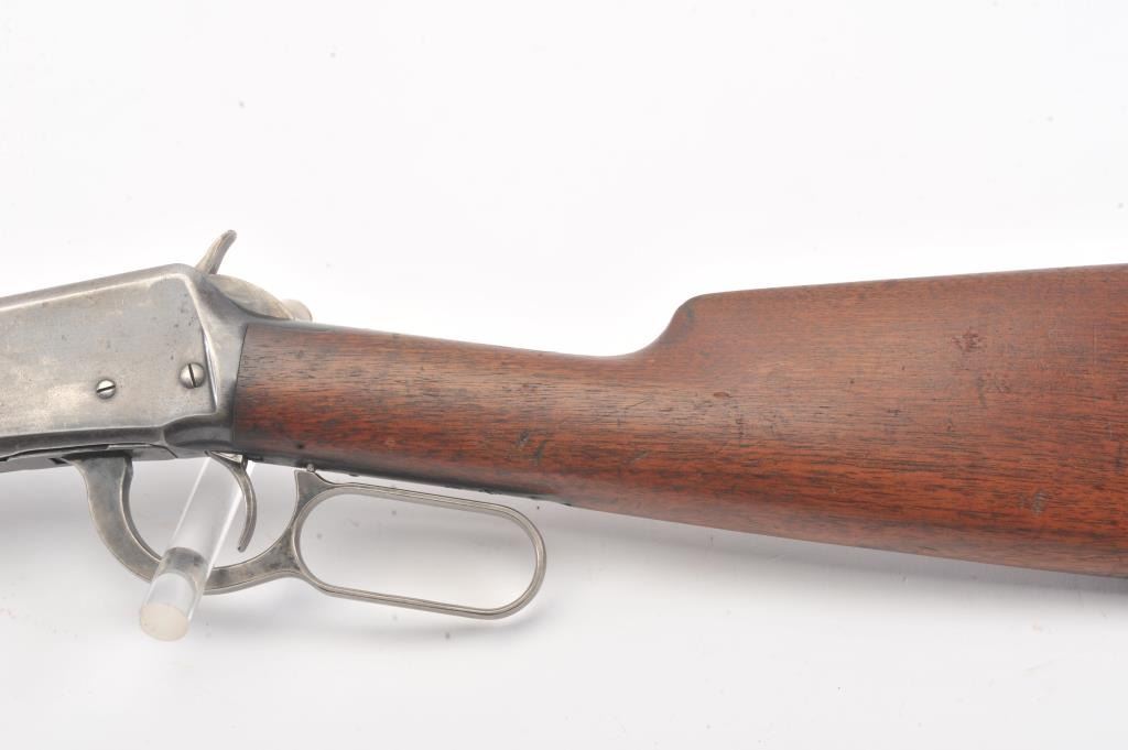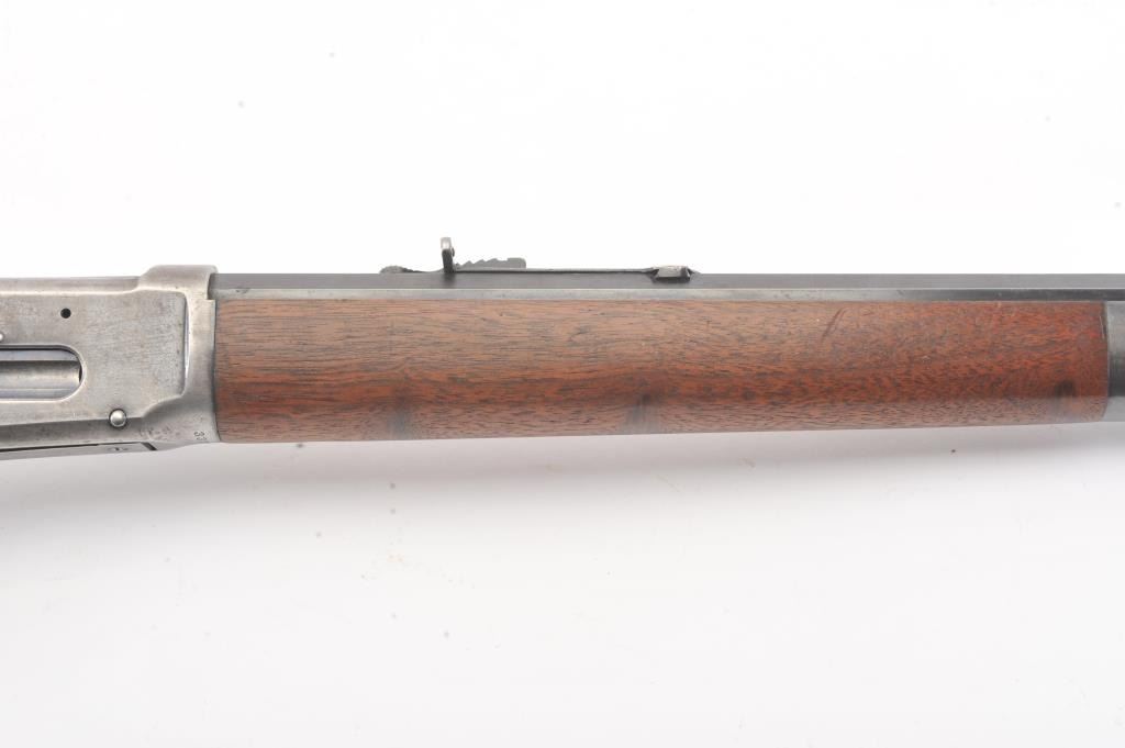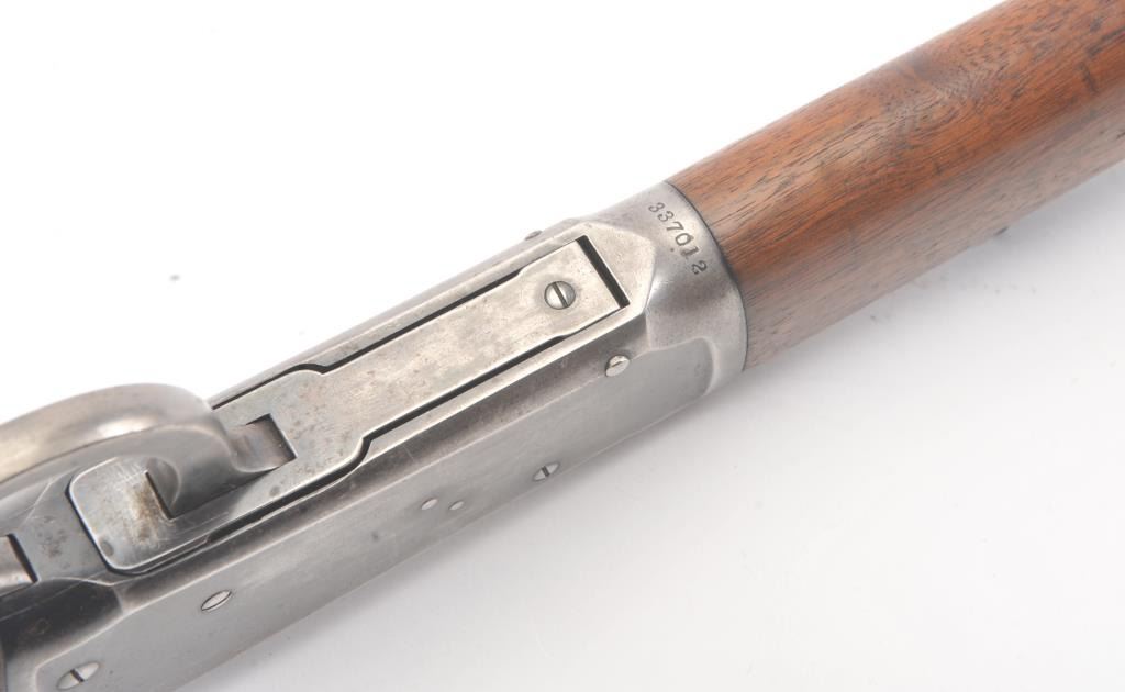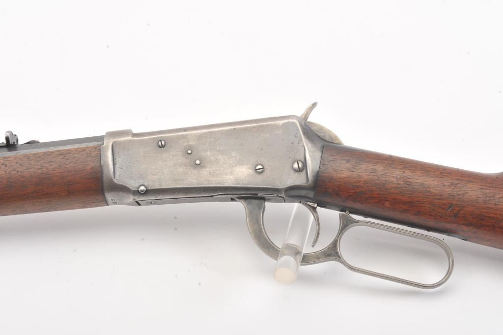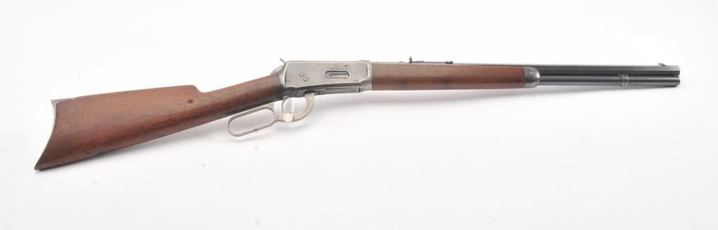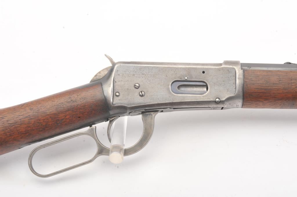 Winchester Model 1894 short rifle, #337012, .25-35 WCF cal., 20" octagon barrel, buckhorn sights, with crescent butt. Rifle is in very good plus condition overall, retaining approximately 80% original finish. The woodis very good, the stock had two holes drilled for sling swivels which have been filled. The bore is good, with good rifling, some minor corrosion. The action is good. Manufatured in 1906. (Modern) Est.$1250-2500