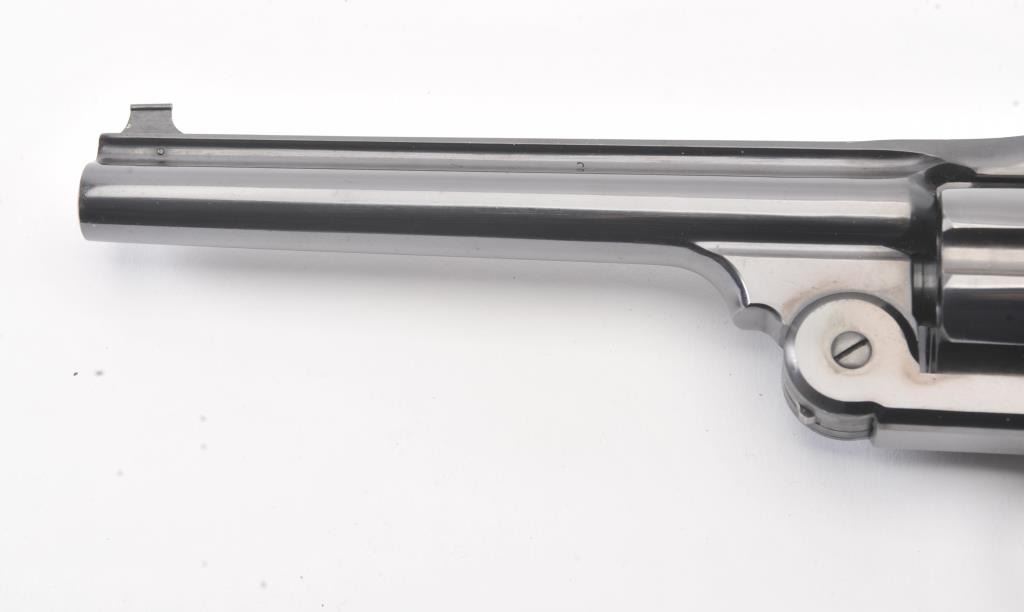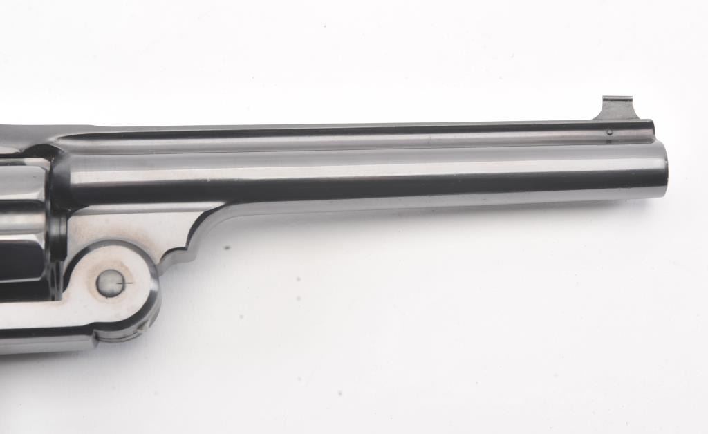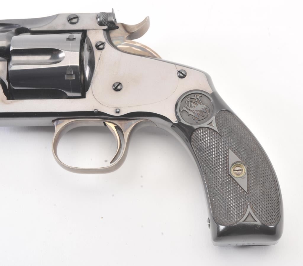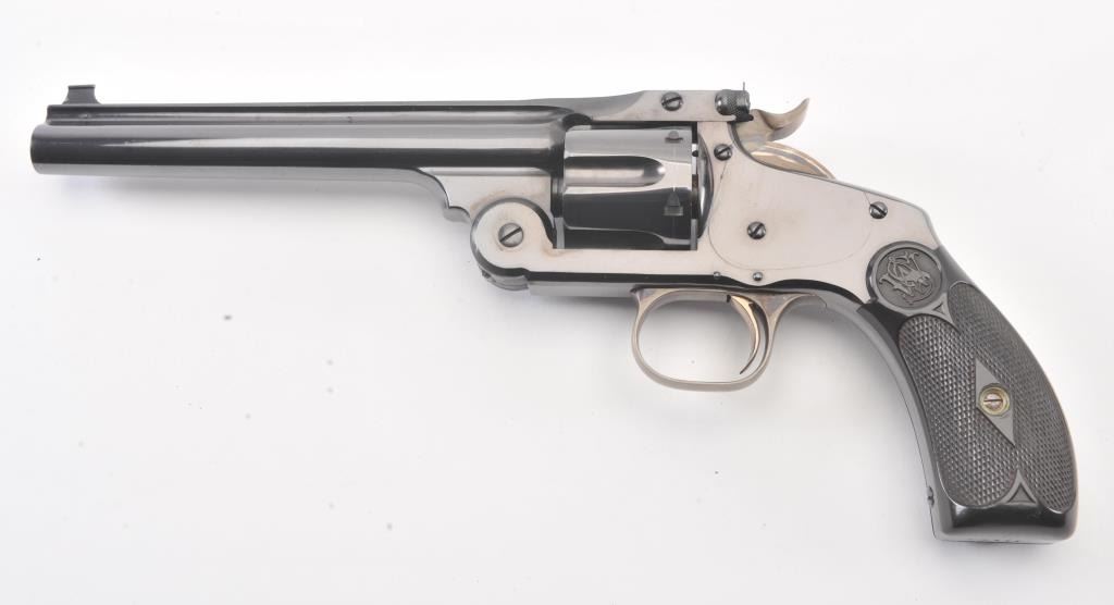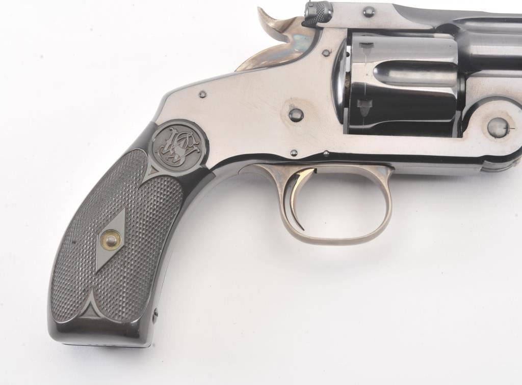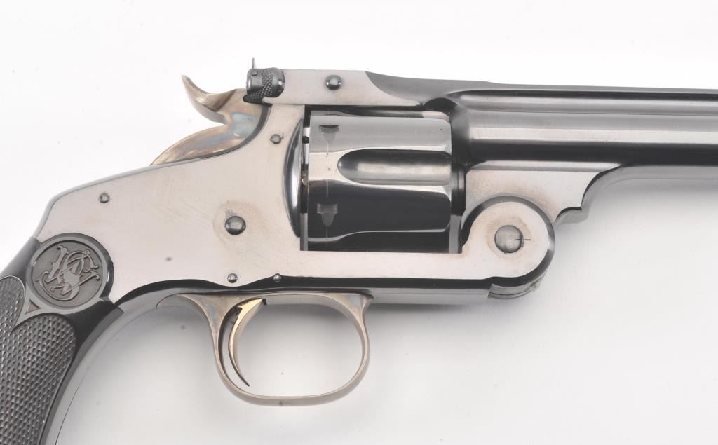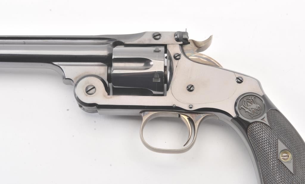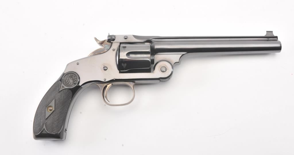Smith and Wesson #3 Target Model revolver, cal. .38/44, Serial #1184. The gun is in excellent overall condition as factory re-finished. The pistol retains approximately 97% of an older factory re-finish withsignificant case colors present on both the trigger guard and hammer. The bore is very good, action crisp and markings sharp. The checkered hard rubber grips are in overall very good condition as well. (Antique). Factory letter found for this gun. Est.: $1250-2500