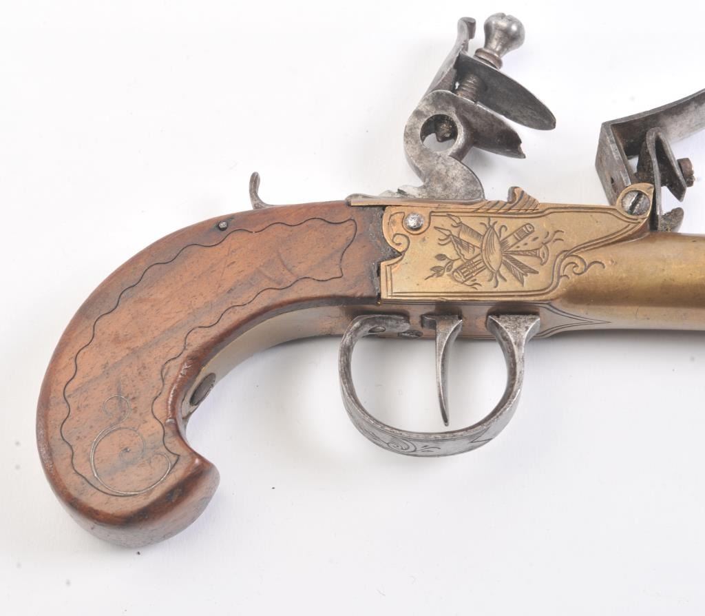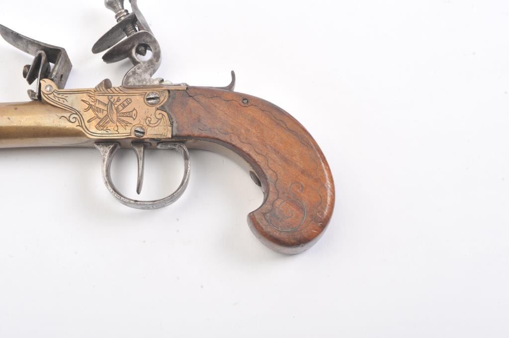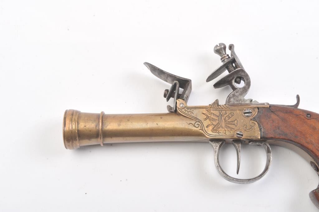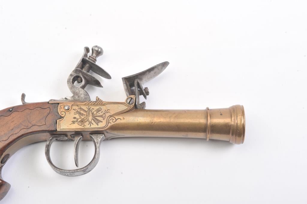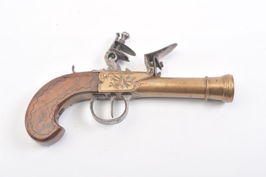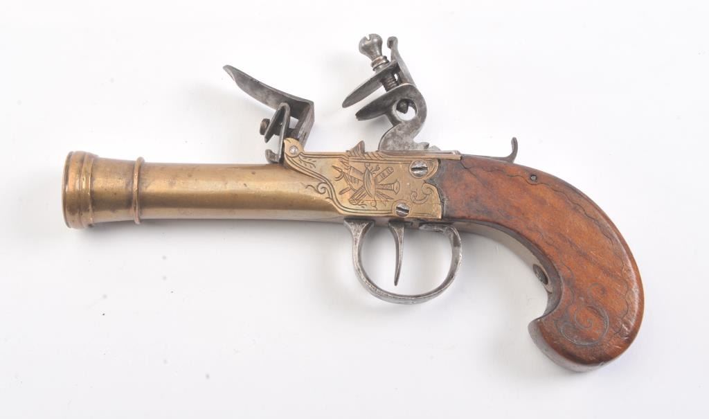 Center hammer all brass continental blunderbuss pistol circa late 18th to early 19th century. No proofs or markings but French style. The barrel measures 2 3/4" with flared blunderbuss barrel of approximately.80 caliber with cannon style ringed muzzle. Silver wire inlaid into the stock. Works well. Very good plus overall. (Antique) Est.: $500-$1000