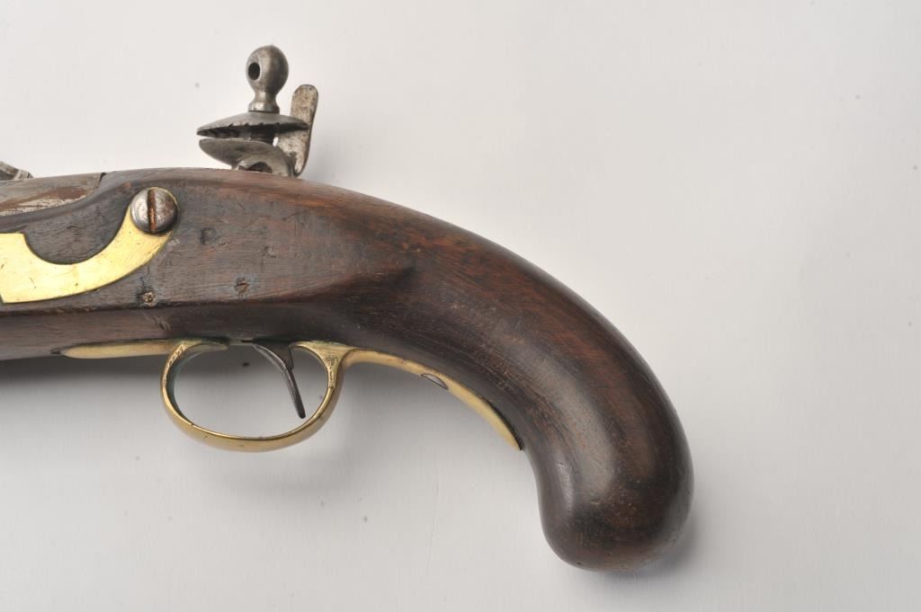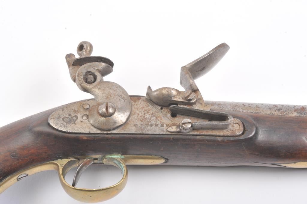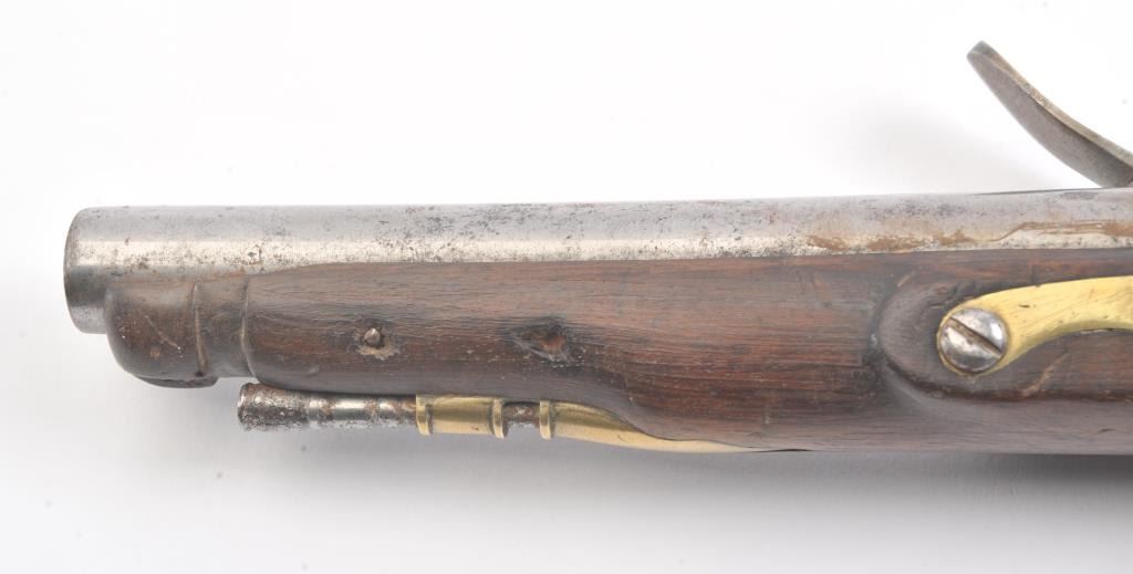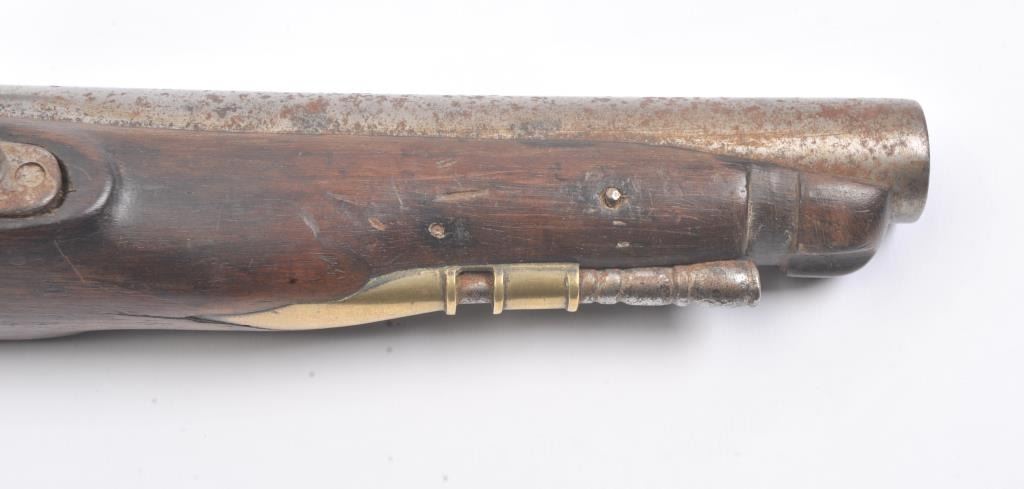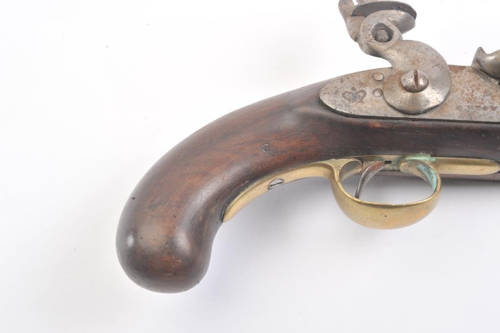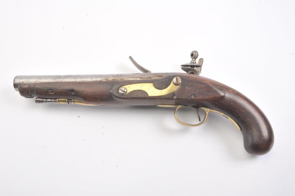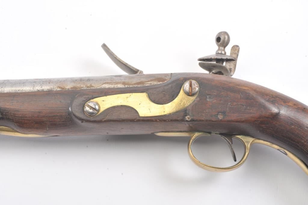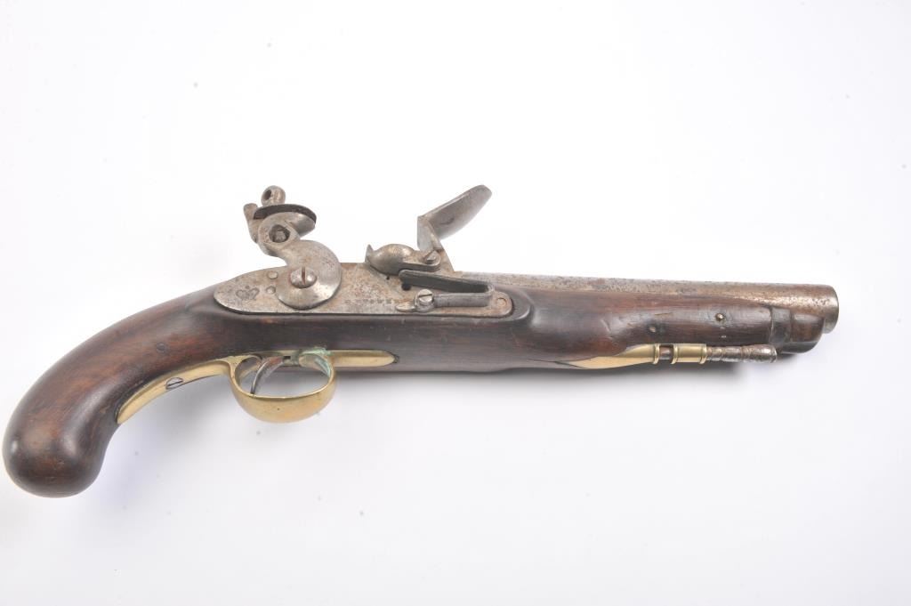 Late 18th century British military style flintlock pistol marked "Tower" with crown at the rear of the lock. British proofed barrel. Brass mounts with 1770s-90s "S" shaped side plate. Approximately .75 caliberwith 9" barrel and 15" overall. The lock is not working. Metal lightly cleaned to gray. The stock is missing brass front band and sliver of wood at the front right end approximately 1/4" by 2" tapering along withother repairs and cleaning to the wood. Fair only overall. Would improve with minor restorations. (Antique) Est.: $250-$500 Room: .