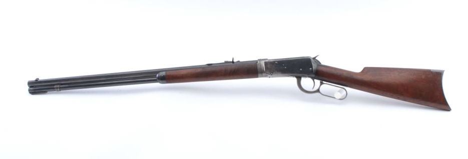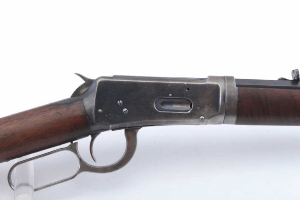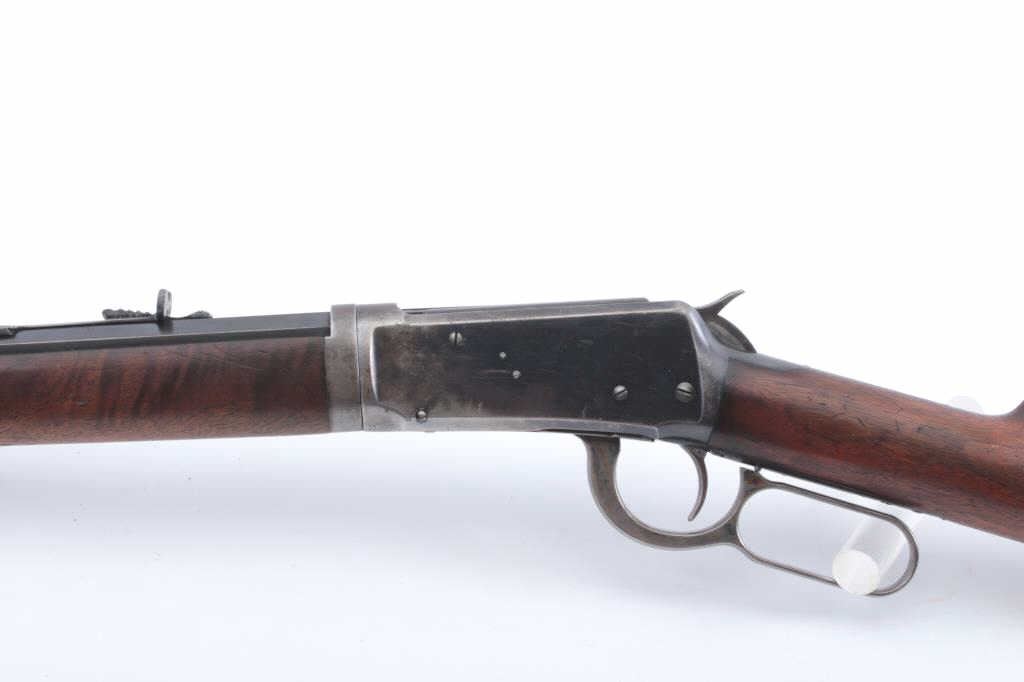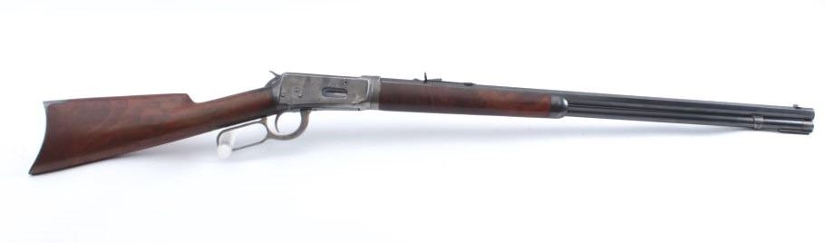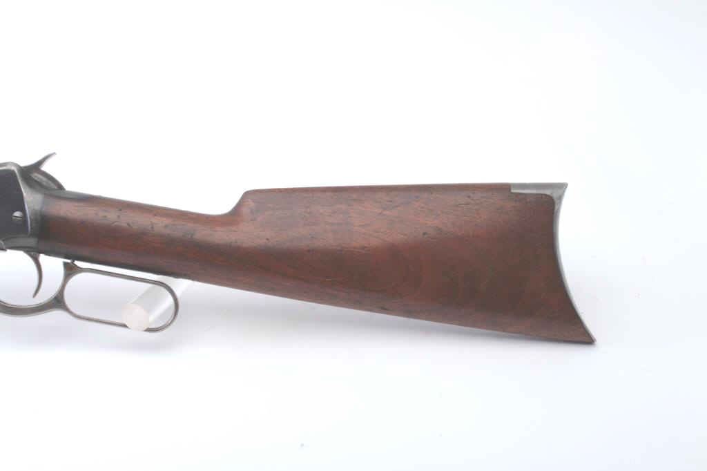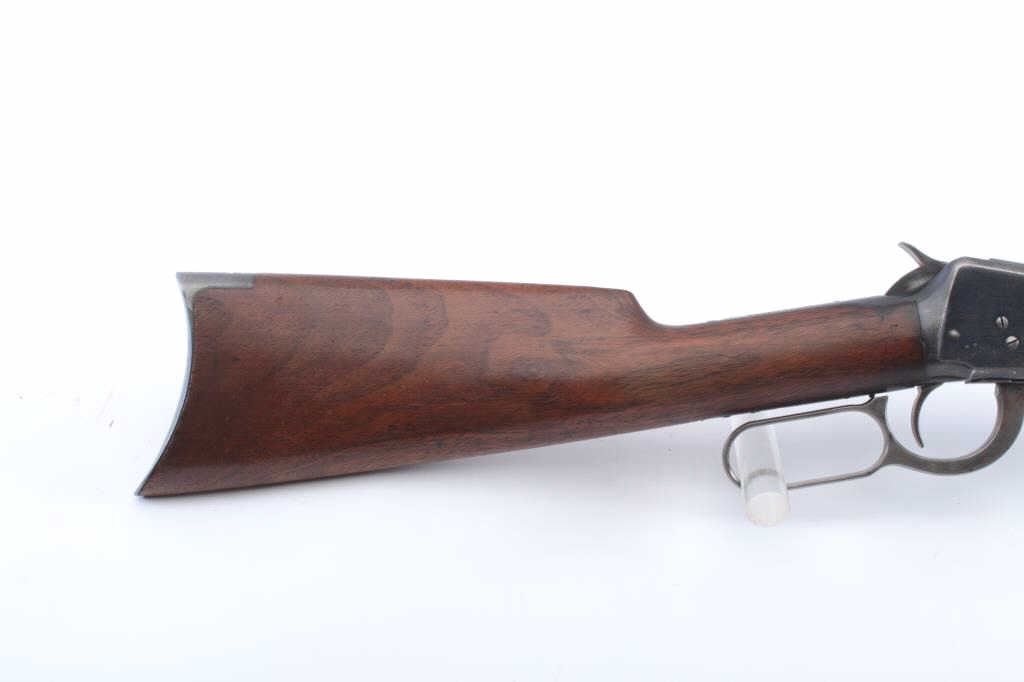 Winchester Model 1894 Special Order Deluxe lever action rifle, .30 WCF caliber, 26” half round/half octagon barrel, takedown frame, half magazine, deluxe checkered pistol grip stock, hard rubber shotgun butt plate, Lymantang sight, three-leaf folding rear sight in correct dove tail with standard front sight, Serial #157885. The rifle retains approximately 60%-80% original blue finish, thinning on the edges and high points,drifting on the takedown collar and fore end cap. The wood is good to very good with some excellent refreshing to the checkering, cleaning and absolutely no sanding with great wood to metal fit. The markings are sharp,the edges are crisp, the action is good and the bore is bright. All features confirmed by factory letter, available upon request. A nice early deluxe rifle circa 1902. Additionally, the lot includes a Winchester factory letter confirming all features indicating the rifle was received in the warehouse on November 7, 1902. The rifle shipped on December 4, 1902, order number 165422 Est.: $2,000-$4,000. (C+R).