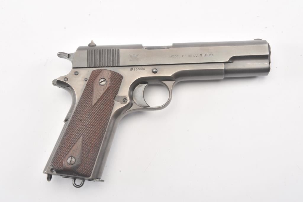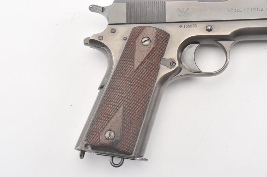 Springfield Armory United States Property Model 1911 semi-automatic pistol (ca. 1914), #105006, .45 caliber, 5” barrel, blued finish, checkered wood grips, two tone magazine with lanyard ring. Pistol is inoverall fine condition showing the majority of its restored finish with some minor high point wear, bright bore, crisp action, sharp markings and fine grips. Per Flayderman’s Guide (5B-249), a total of only 25,767 ofthis variation were produced. Very desirable and sought after by 1911 collectors. Includes one correct two tone, crimped, lanyard ring magazine. (C&R/PPT). Est.: $3,000-6,000