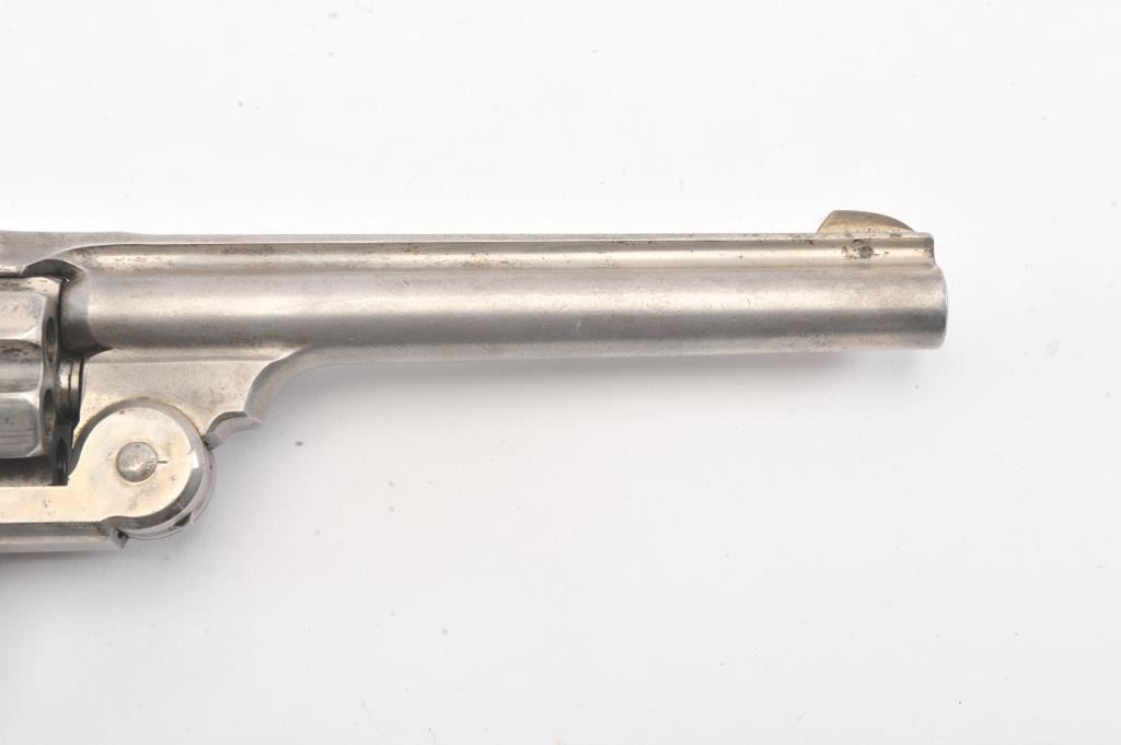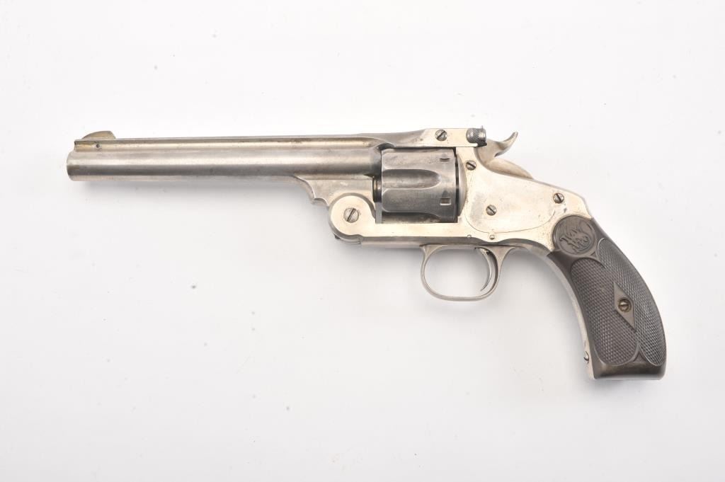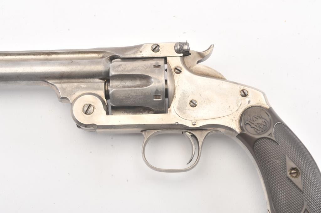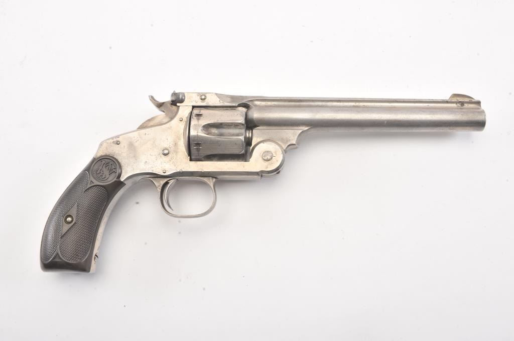 Early Smith & Wesson #3 Model double action revolver, .32-44 caliber, Serial #642. The pistol is in very good overall condition with a 6 ½” barrel, solid rib, blade front sight and adjustable rear sight. The pistolretains a significant amount of the nickel finish with the remainder going to silver patina. The trigger and hammer show silvered case hardening. The checkered hard rubber grips are in good condition with small mars. The bore is fair, the action is crisp and the markings are sharp. Est.: $1,250-$2,500. (Antique).