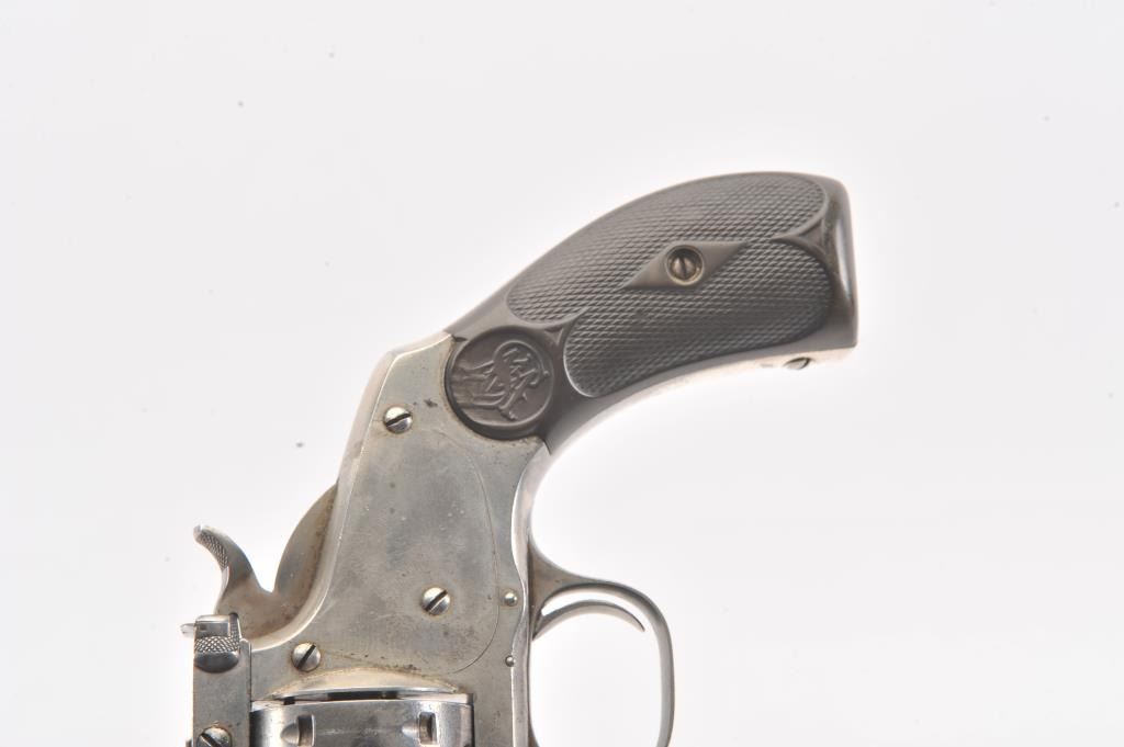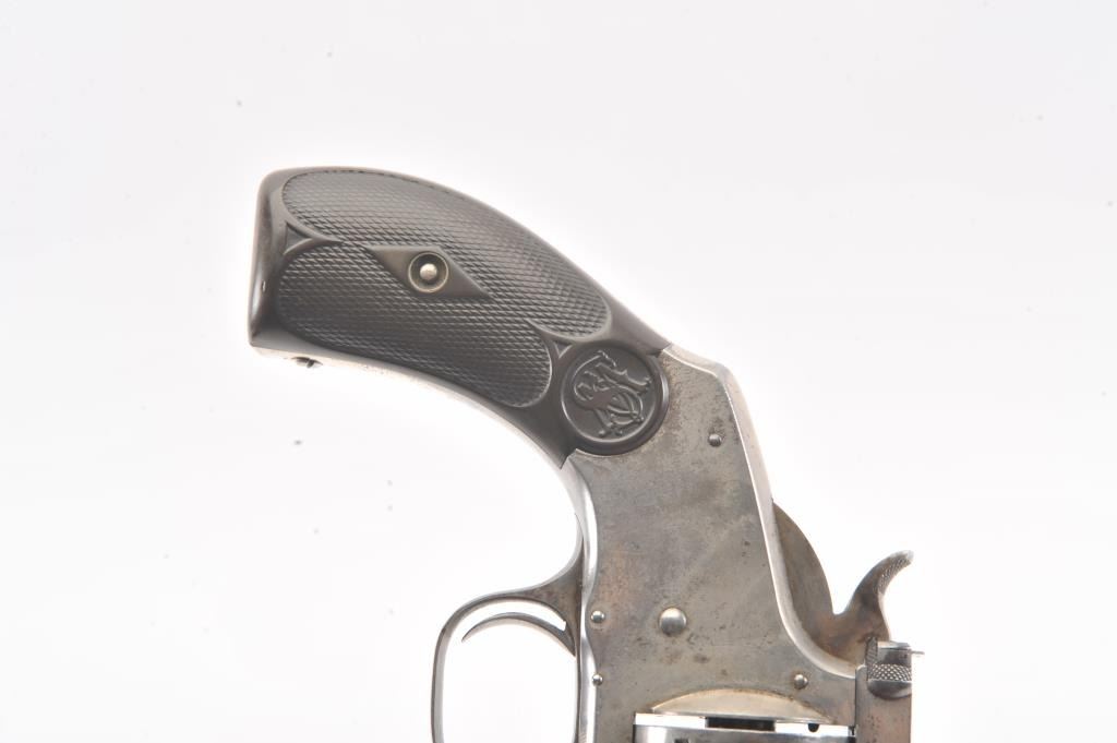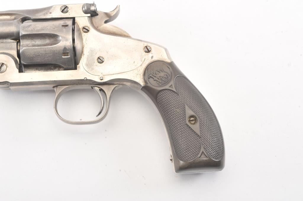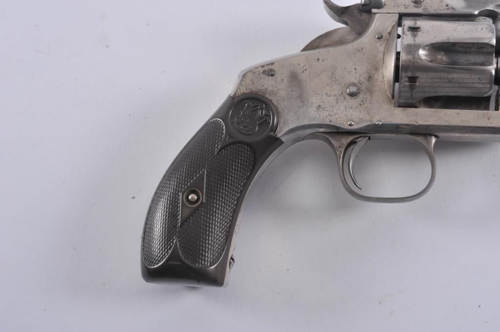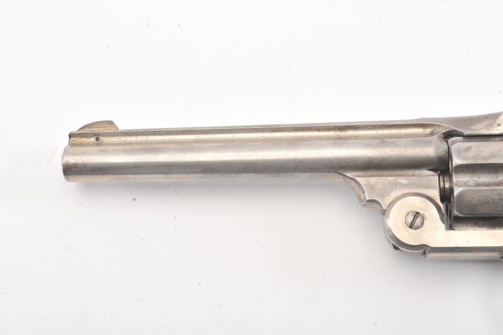 Early Smith & Wesson #3 Model double action revolver, .32-44 caliber, Serial #642. The pistol is in very good overall condition with a 6 ½” barrel, solid rib, blade front sight and adjustable rear sight. The pistolretains a significant amount of the nickel finish with the remainder going to silver patina. The trigger and hammer show silvered case hardening. The checkered hard rubber grips are in good condition with small mars. The bore is fair, the action is crisp and the markings are sharp. Est.: $1,250-$2,500. (Antique).