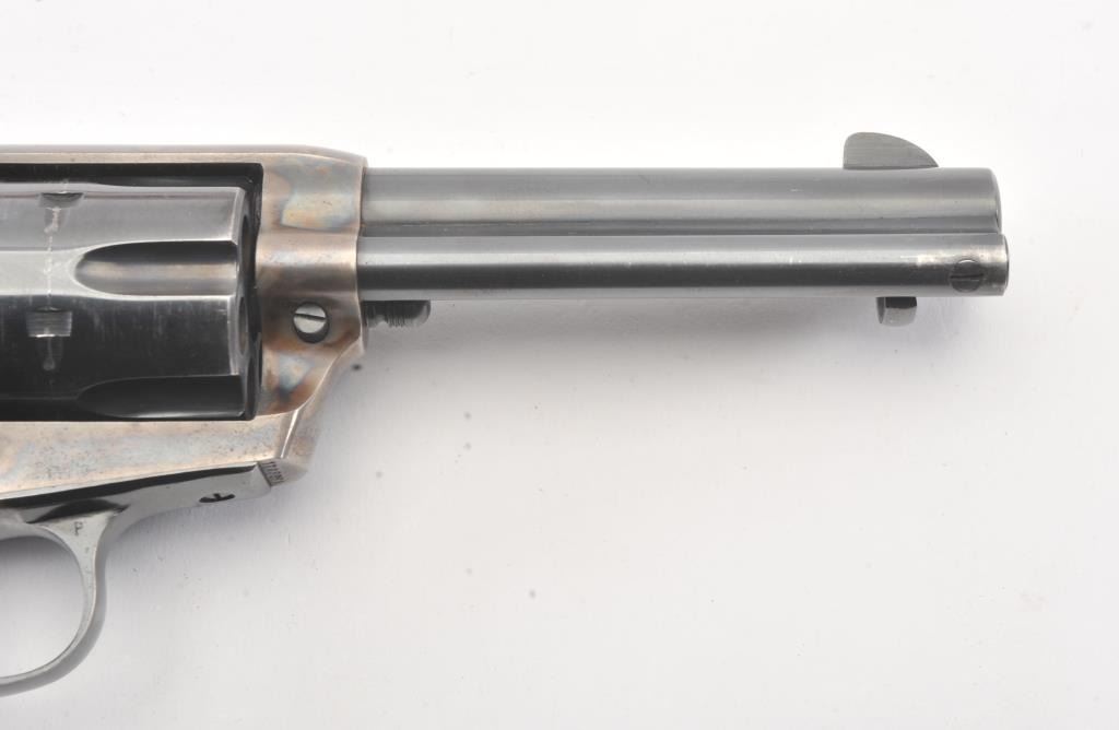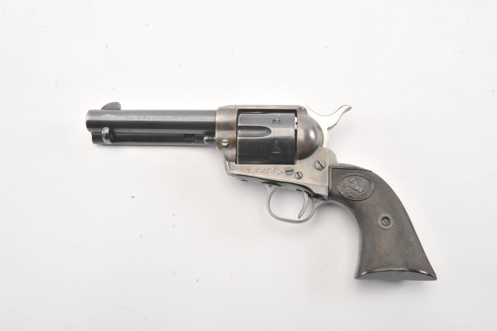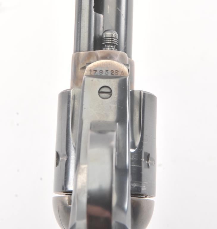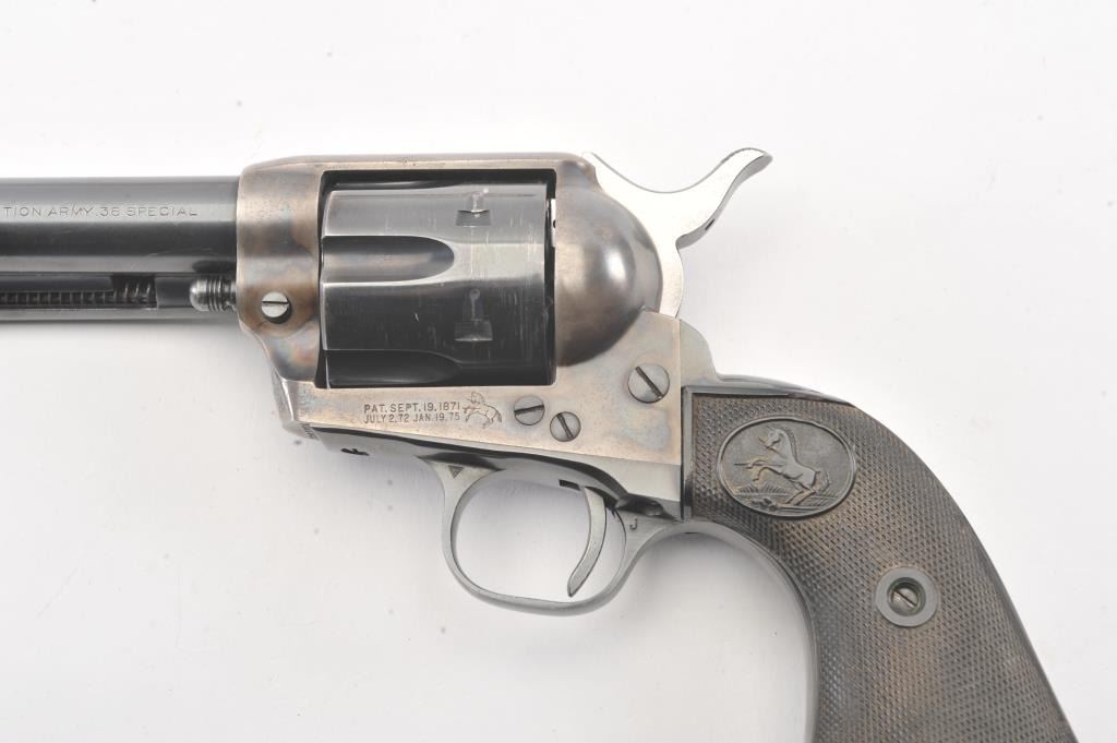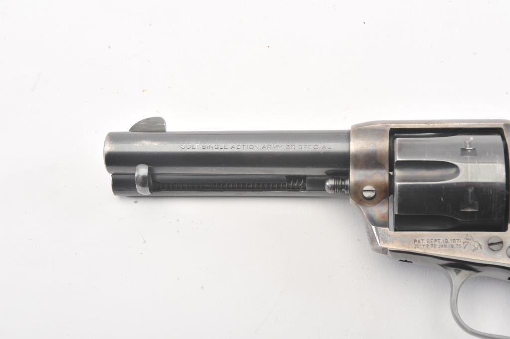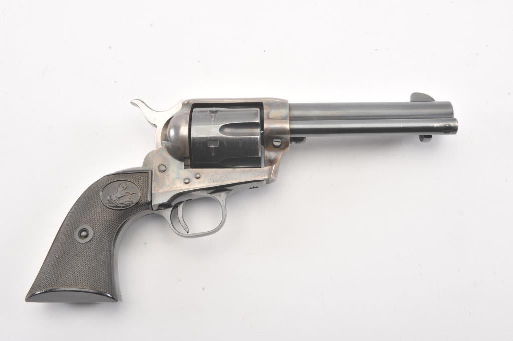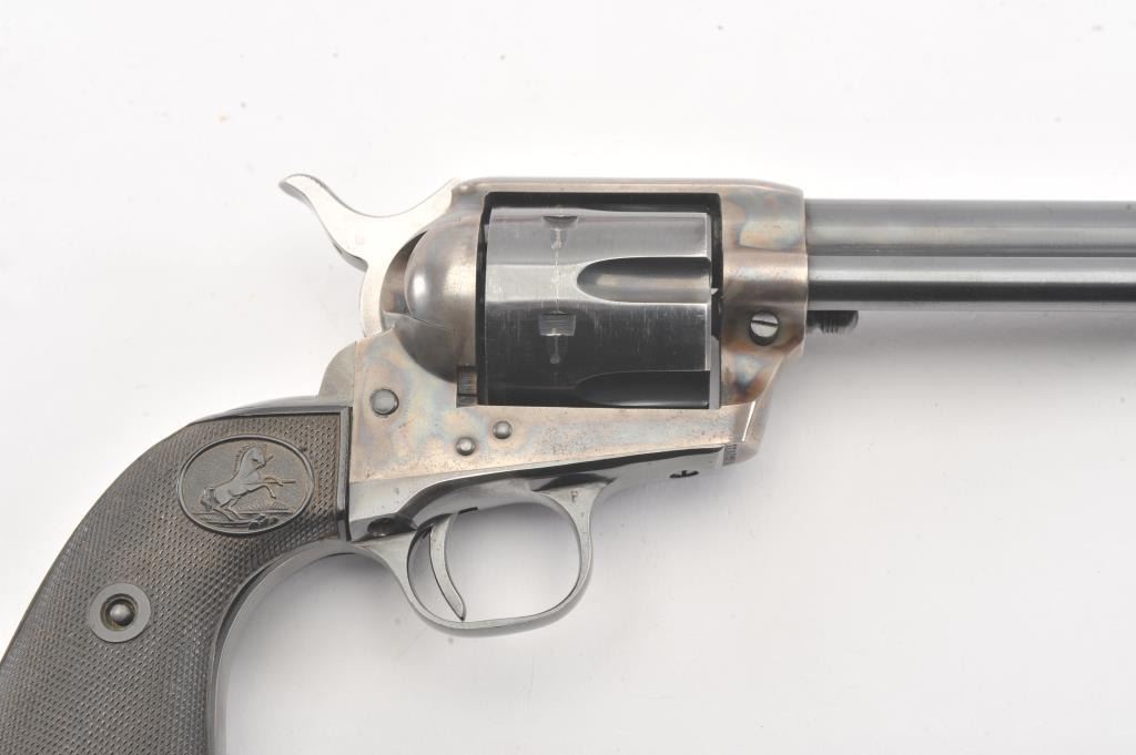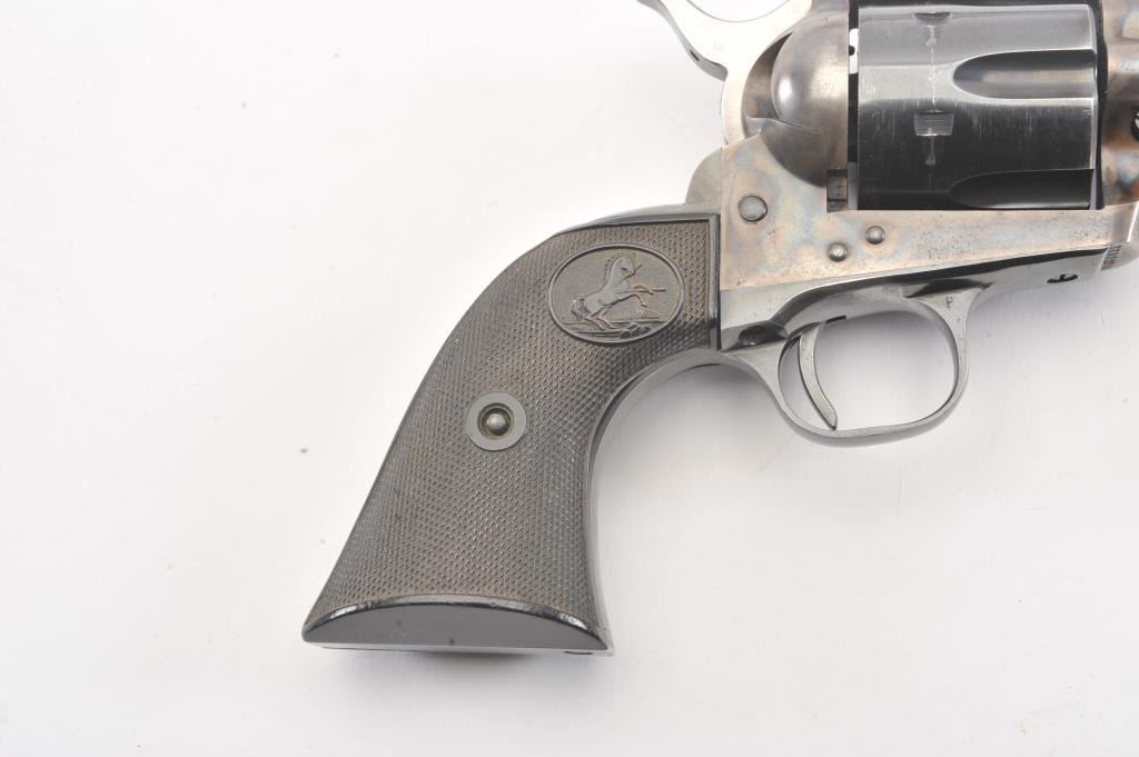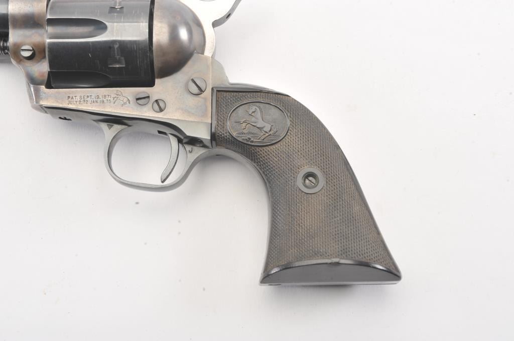Colt SAA 2nd Generation revolver, .38 Special caliber, Serial #17652SA. The pistol is in fine overall condition with a 4 ¾” barrel. The pistol retains nearly all of the original blue finish with holster wear at the muzzleand an index line on the cylinder. The frame retains approximately 80%-90% of the vivid case coloring. The checkered plastic grips are in very good condition with small mars and dirt. The bore is good, the action iscrisp and the markings are sharp on this nice 2nd Gen. Est.: $1,250-$2,500. (Modern).
