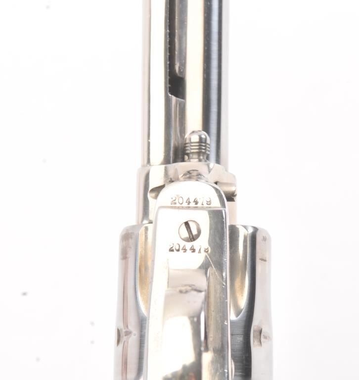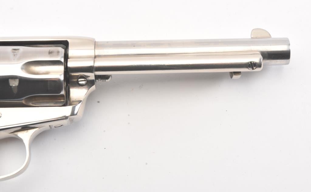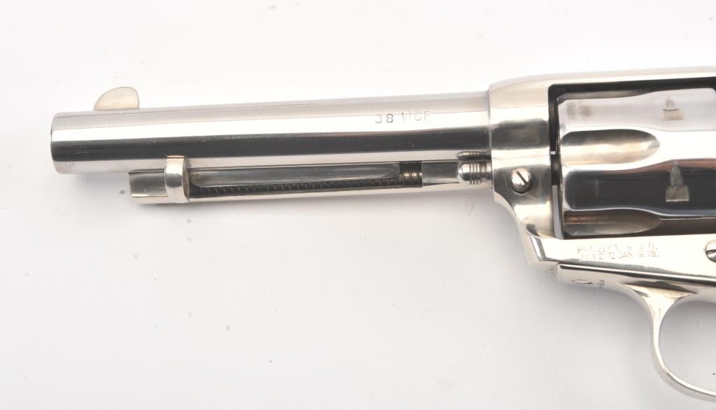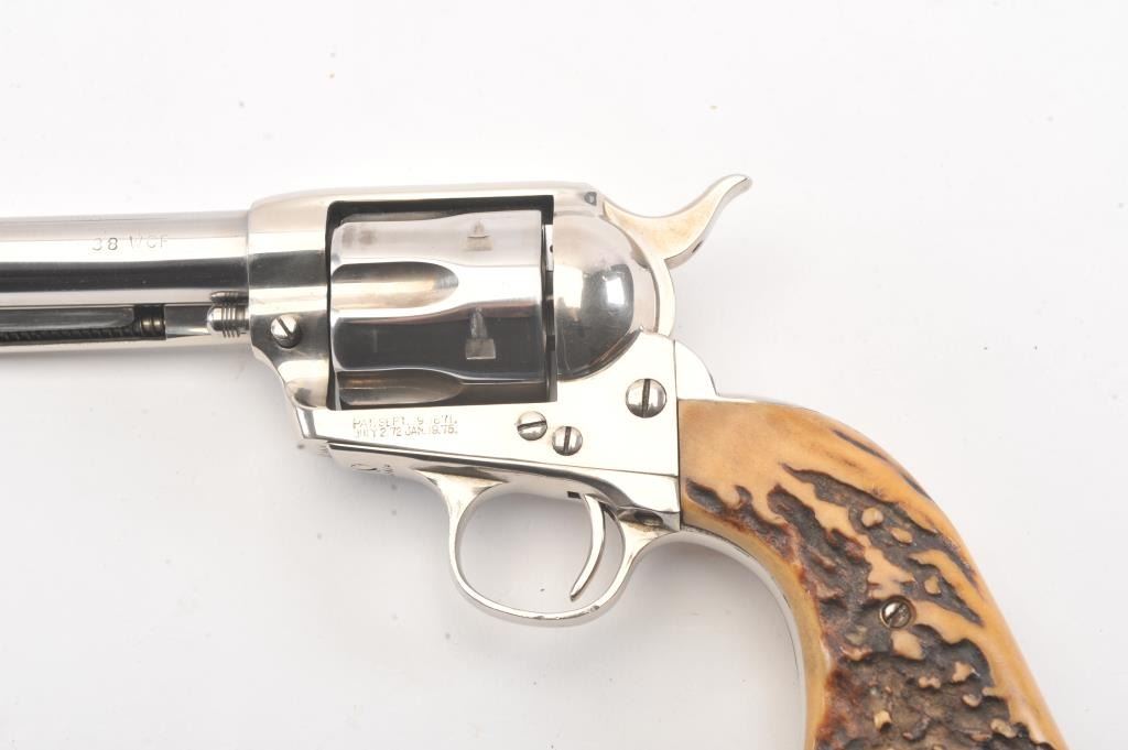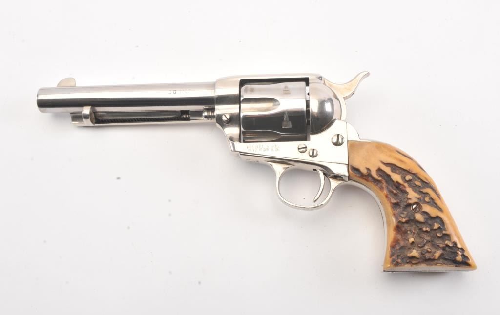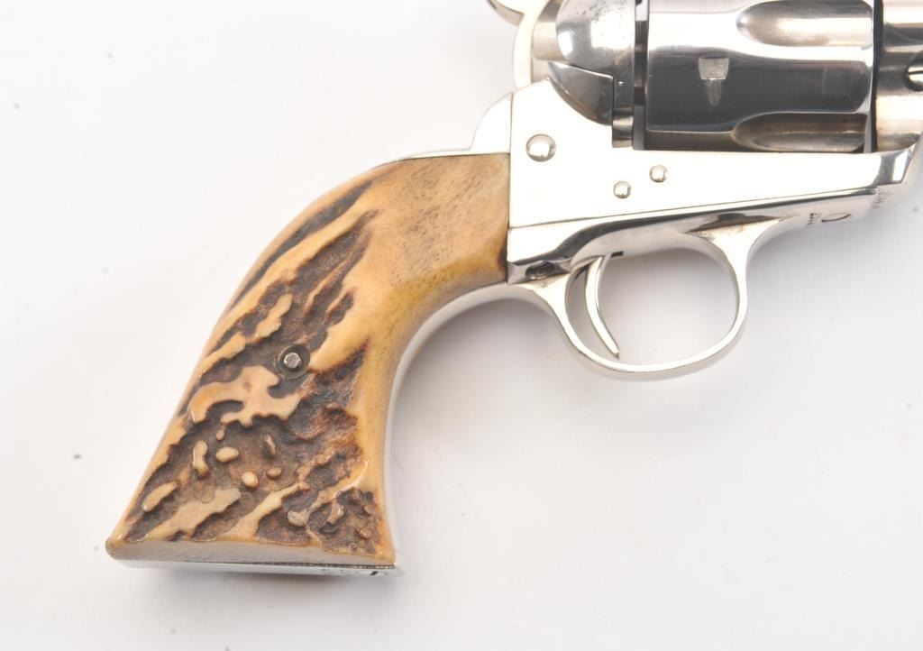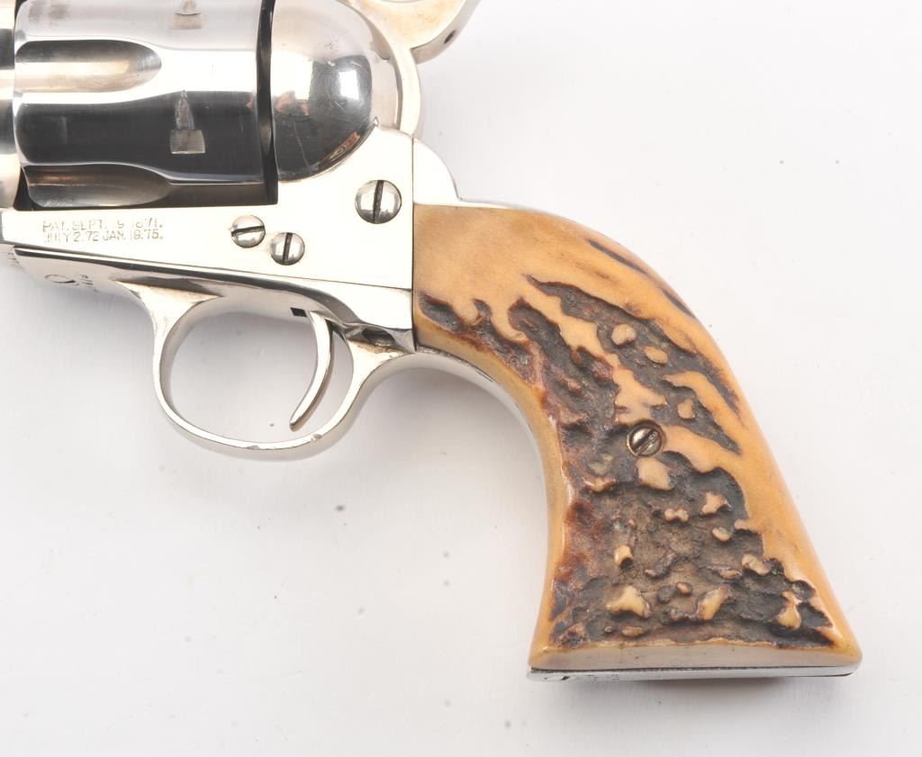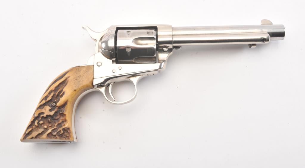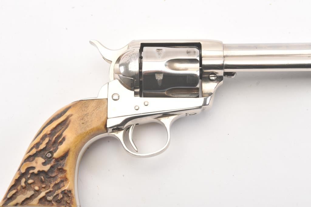 Colt SAA 1st Generation revolver, .38-40 caliber, Serial #204479. The pistol is in fine overall condition as professionally refinished with a 5 ½” barrel. The pistol retains nearly all of the re-nickeled finish. The action and timing are both good. The stag grips are fit well and have taken on a pleasing taffy color. The bore is good, markings are legible and the action is crisp on this refinished 1st Gen SAA, circa 1901.Est.: $1,200-$2,400. (C+R).