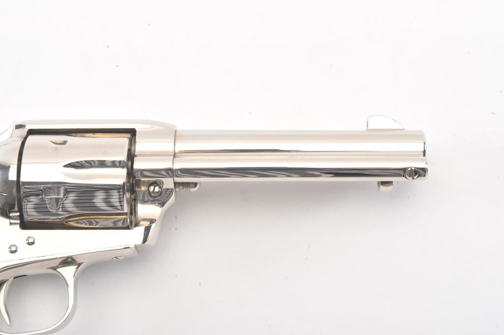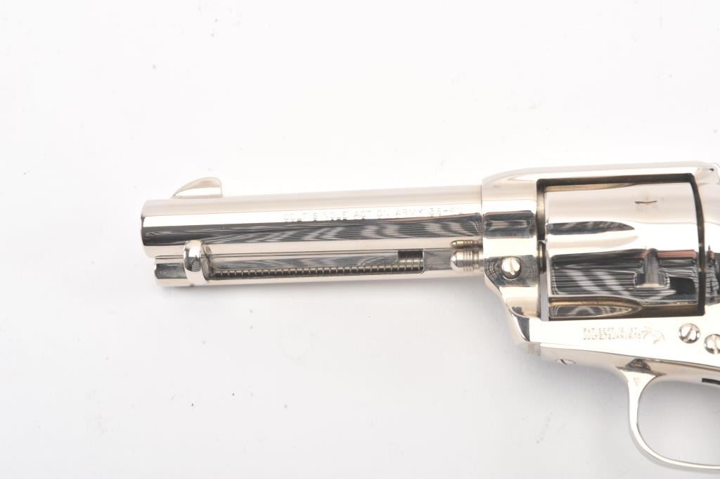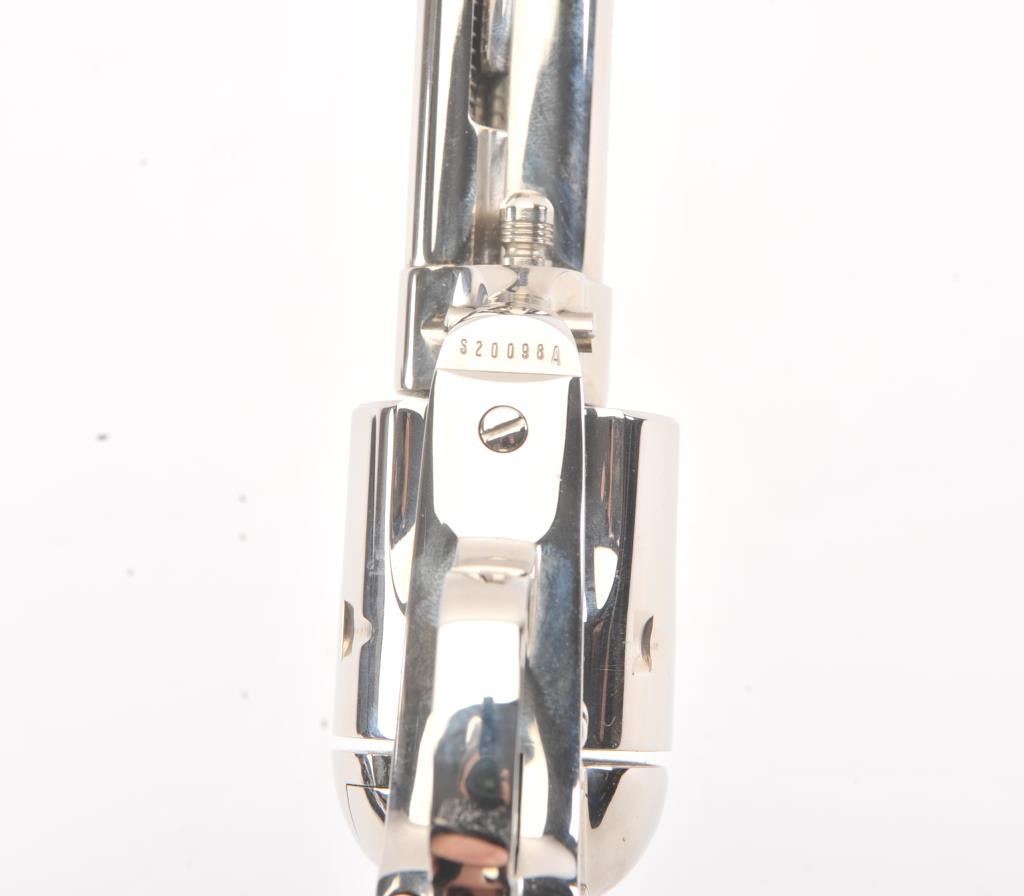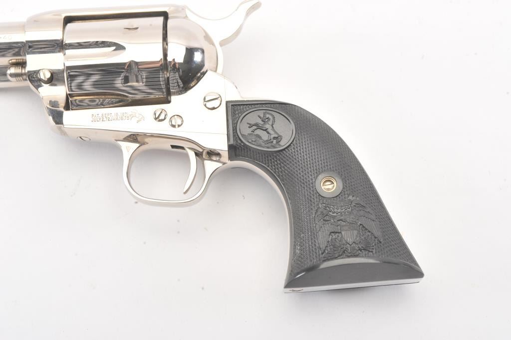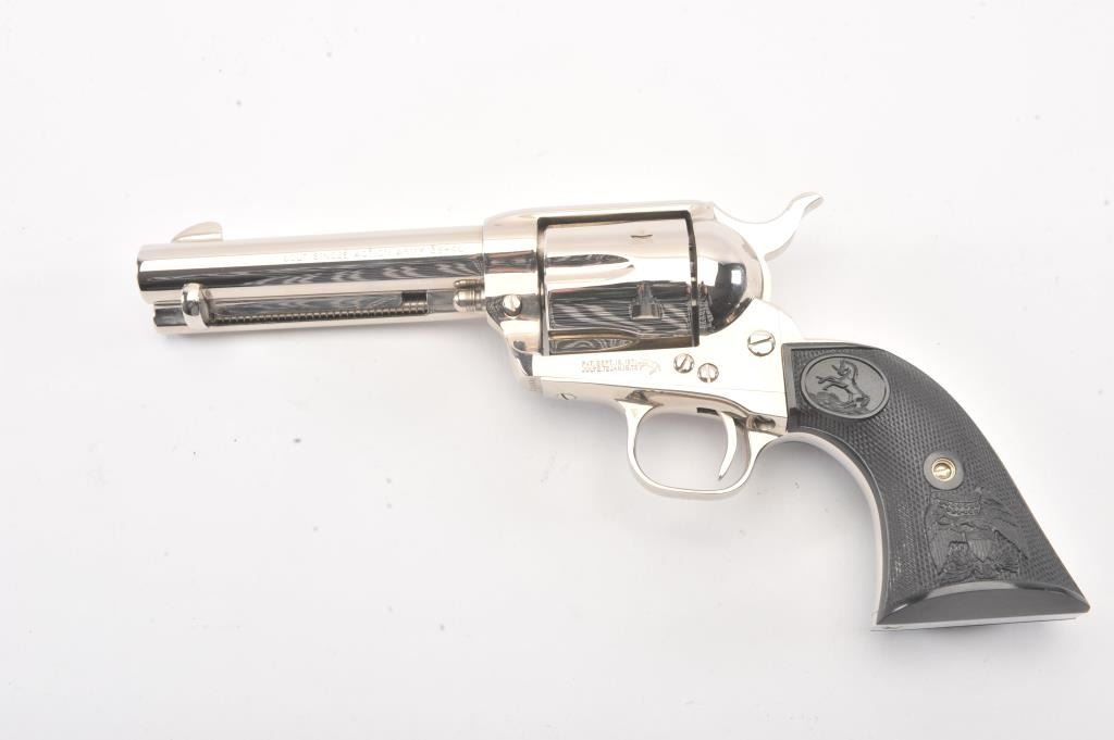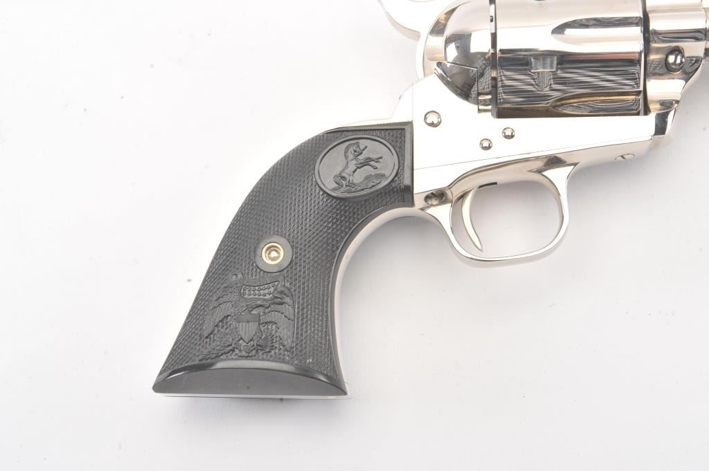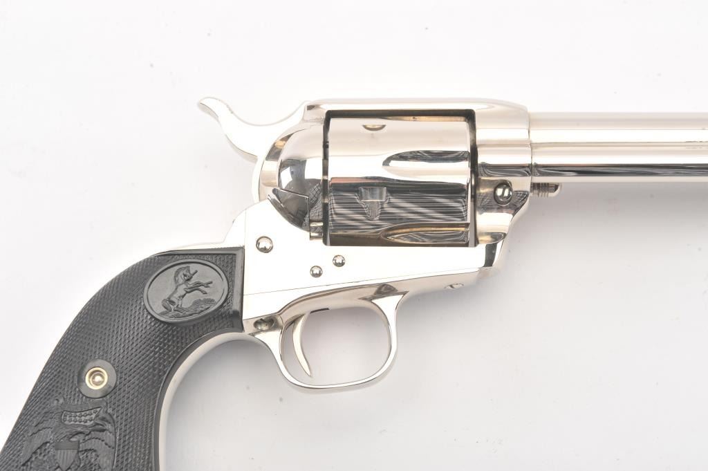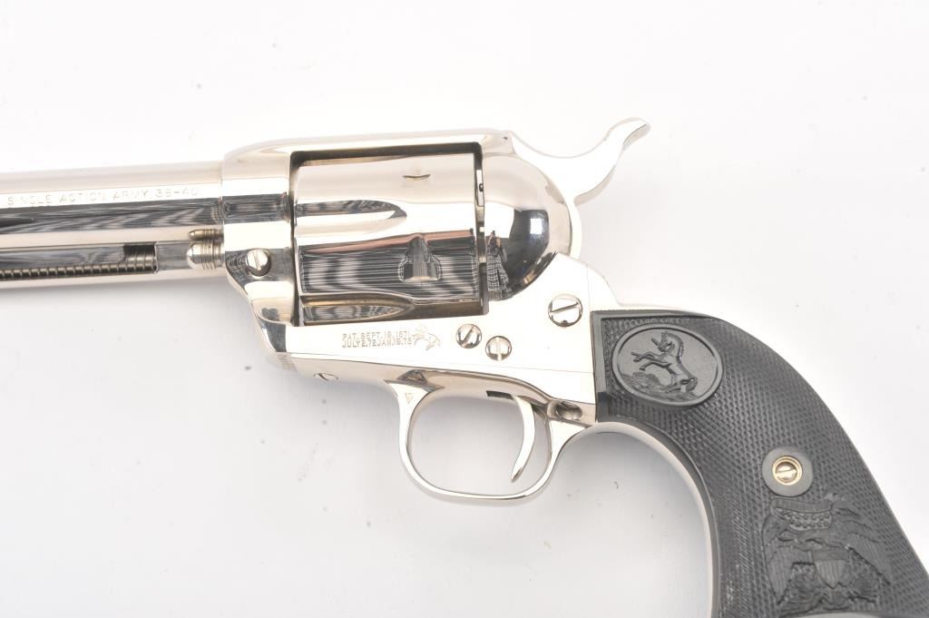 Colt Third Generation SAA revolver in scarce .38-40 caliber, 4 3/4” barrel, #S20098A, nickel finish, checkered black hard rubber eagle grips. This Colt is in like new condition displaying little handling;beautiful bright nickel finish. Bore is mint, action is excellent. (Modern/PPT) Est.: $1,500-$3,000.