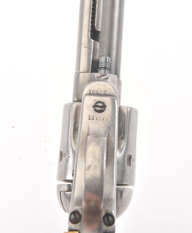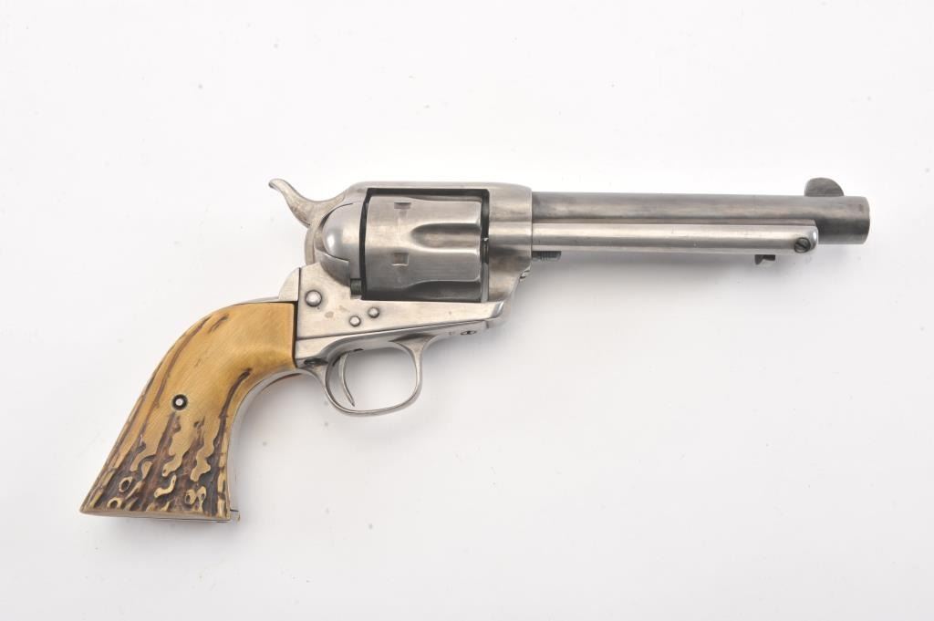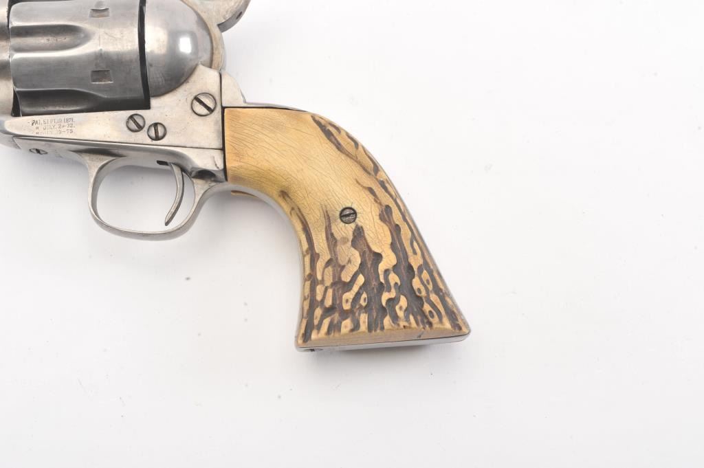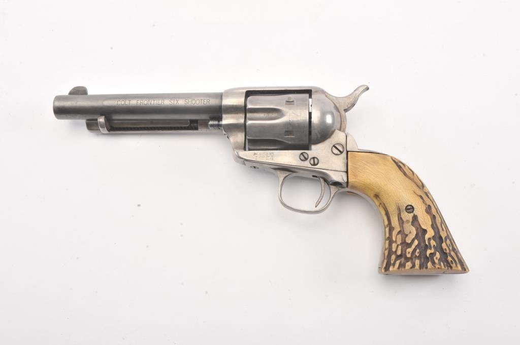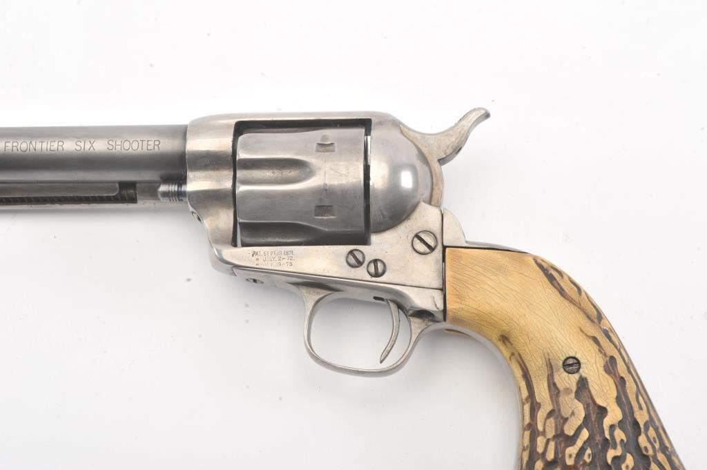 Colt First Generation Single Action Frontier Six Shooter, #124676, .44-40 cal., 5 1/2" barrel marked Frontier Six Shooter, black powder frame, with stag grips. The revolver is in good condition overall, some finishremains in the protected areas, the bore is good, the action is good. The grips are good, fitting well, and of the period. Refreshed barrel markings. This all matching revolver has seen plenty of action on thefrontier. (Antique) Est. $1200-2400