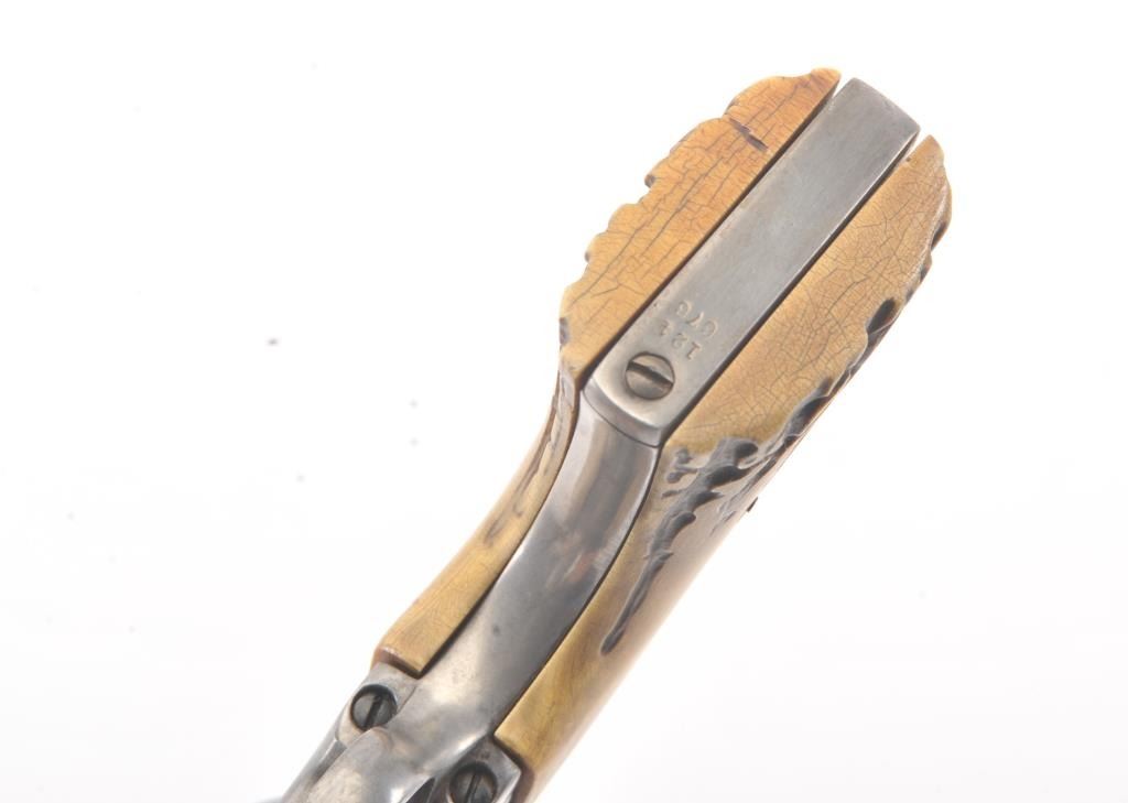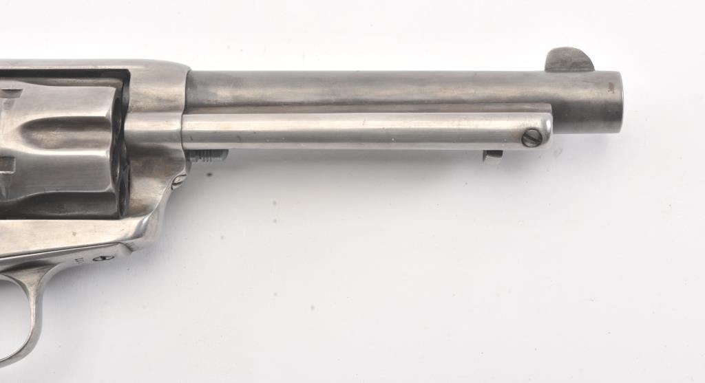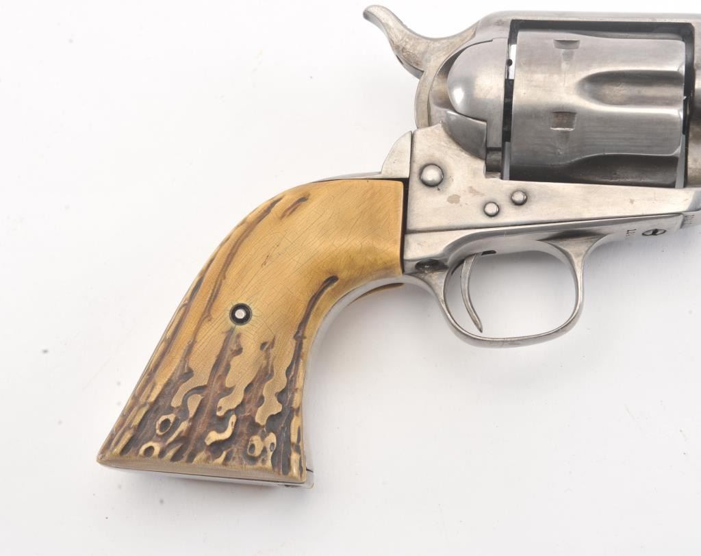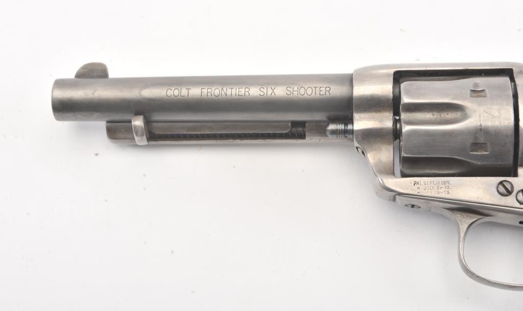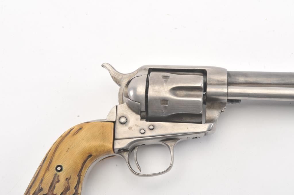 Colt First Generation Single Action Frontier Six Shooter, #124676, .44-40 cal., 5 1/2" barrel marked Frontier Six Shooter, black powder frame, with stag grips. The revolver is in good condition overall, some finishremains in the protected areas, the bore is good, the action is good. The grips are good, fitting well, and of the period. Refreshed barrel markings. This all matching revolver has seen plenty of action on thefrontier. (Antique) Est. $1200-2400