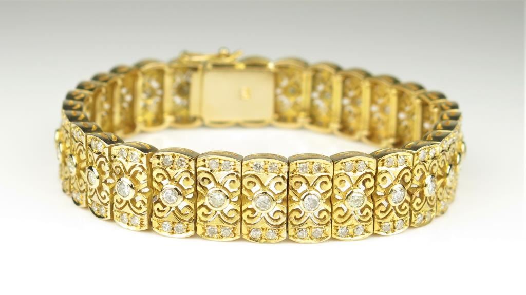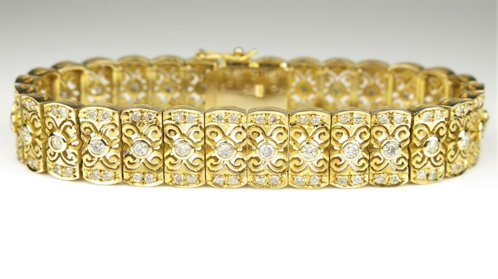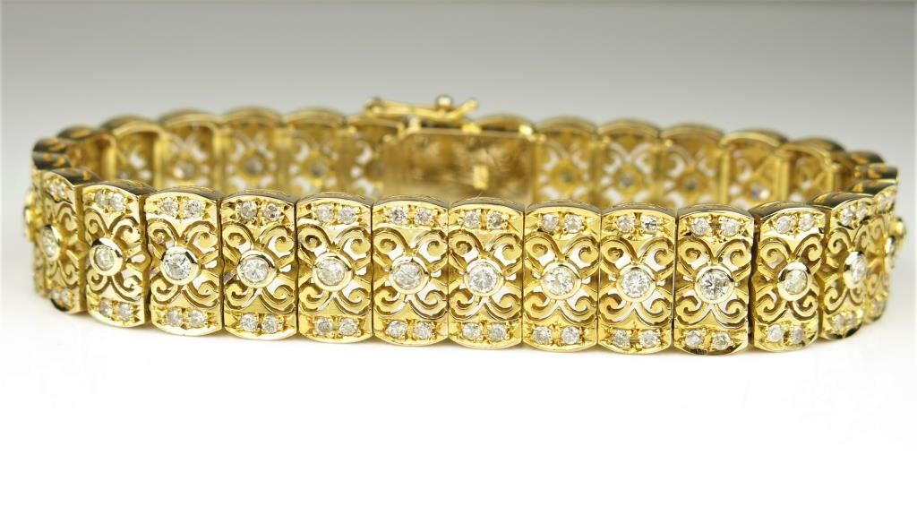 Art Deco Style Diamond Bracelet fine set with over 150 round Diamonds weighing approx. 3.00 carats with F-G colors and SI clarity set in a beautifully crafted heavy 14 karat yellow gold link style bracelet withintricate detailing. Retail $7,000-$9,000 Estimates $4,000-$6,000