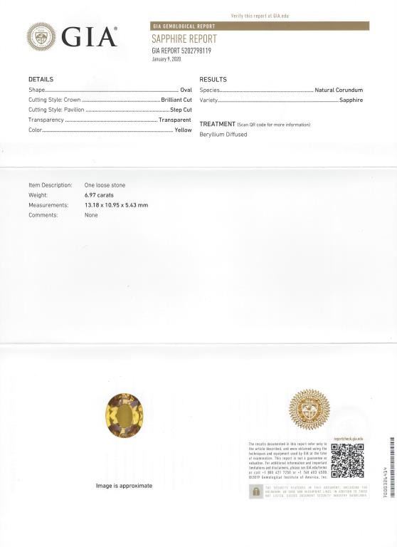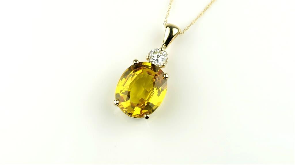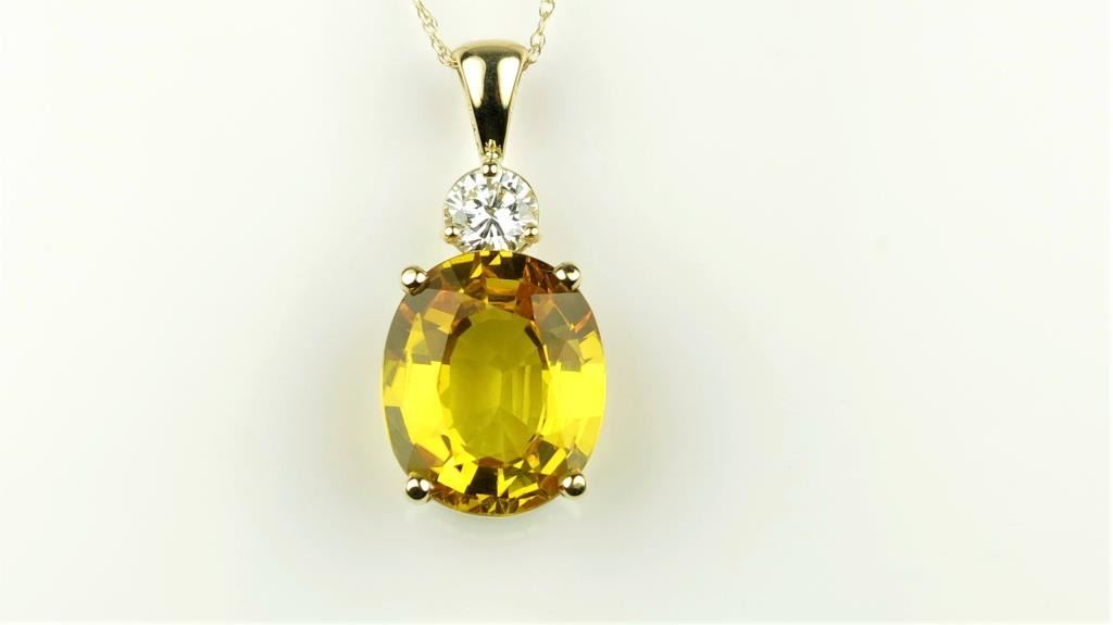 Amazing Yellow Sapphire and Diamond Pendant featuring a GIA Certified oval treated Sapphire weighing 6.97 carats accented with a round Diamond weighing 0.40 carats with G-H color and VS-SI clarity set in 14 karat white gold setting. Retail $6,000-$9,000 Estimates $3,000-$4,000