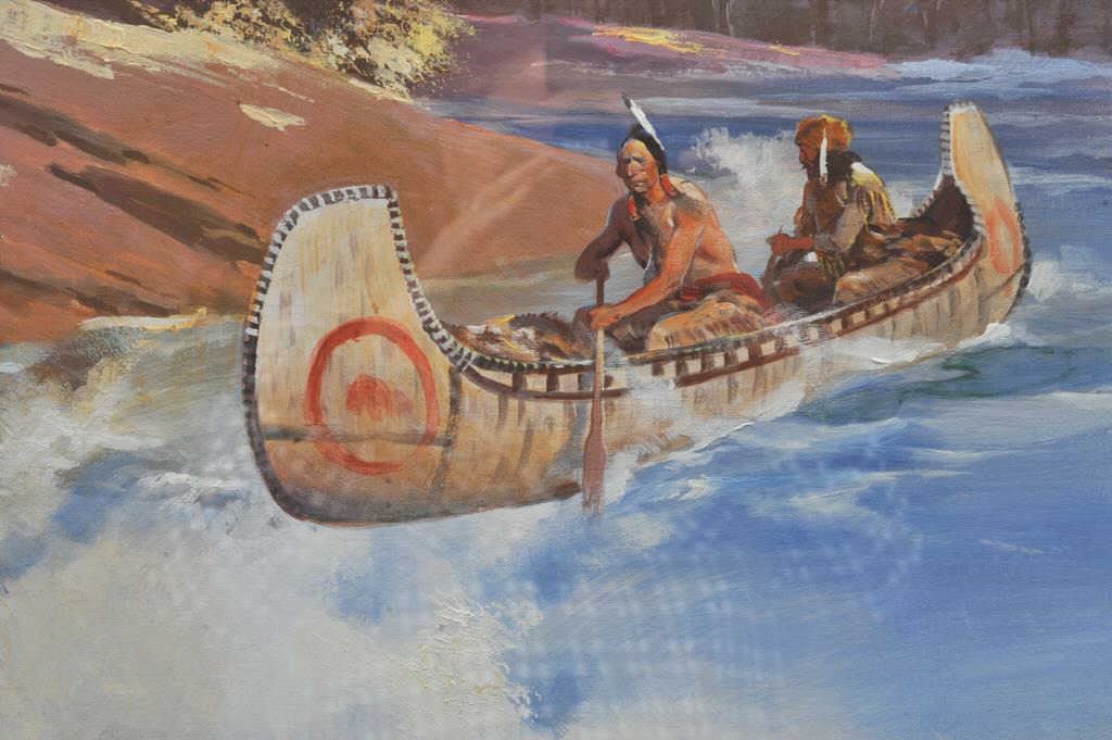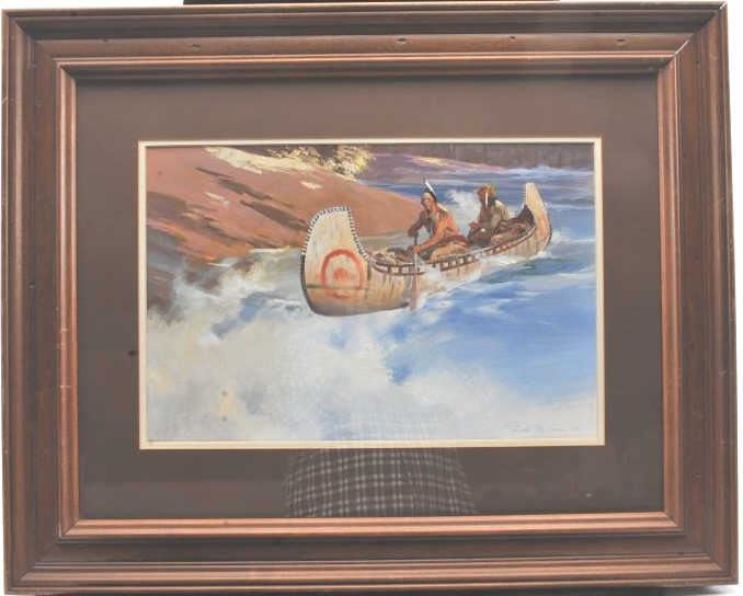 Acrylic on artist board signed lower right "Gerald McCann 84". Measures 12" x 20" image only. Framed and matted under glass. No condition issues. Excellent scene of trapper and Indian in canoe on rapids. Gallery priced $4200. Est.: $2000-$4000