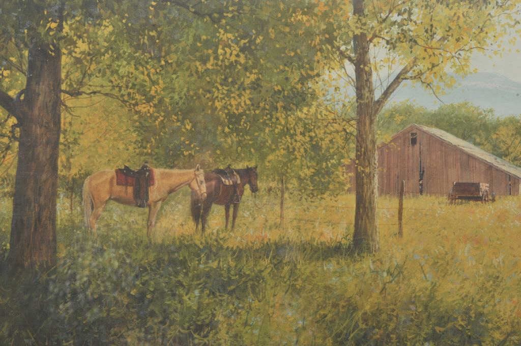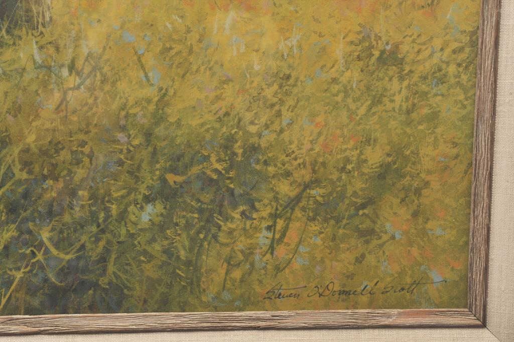 Gouache and watercolor signed lower right "Steven Scott" entitled "Afternoon in Springerville". Measures 18" x 24" image only. Nicely framed and matted. Excellent condition. Trailside galleries sticker on the reverse who handle "The Best" contemporary Western Artists Gallery priced $3500. Est.: $1750-$3500