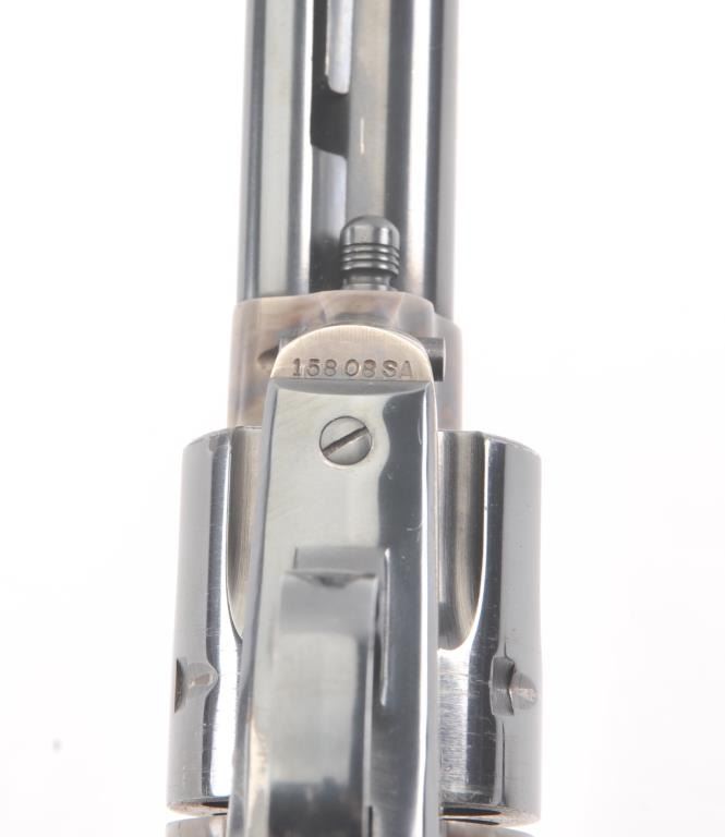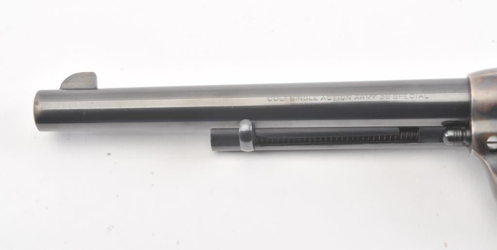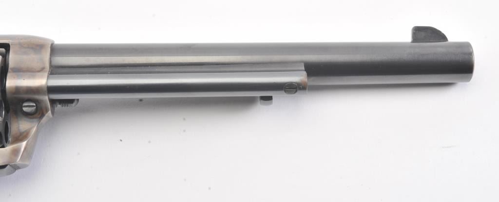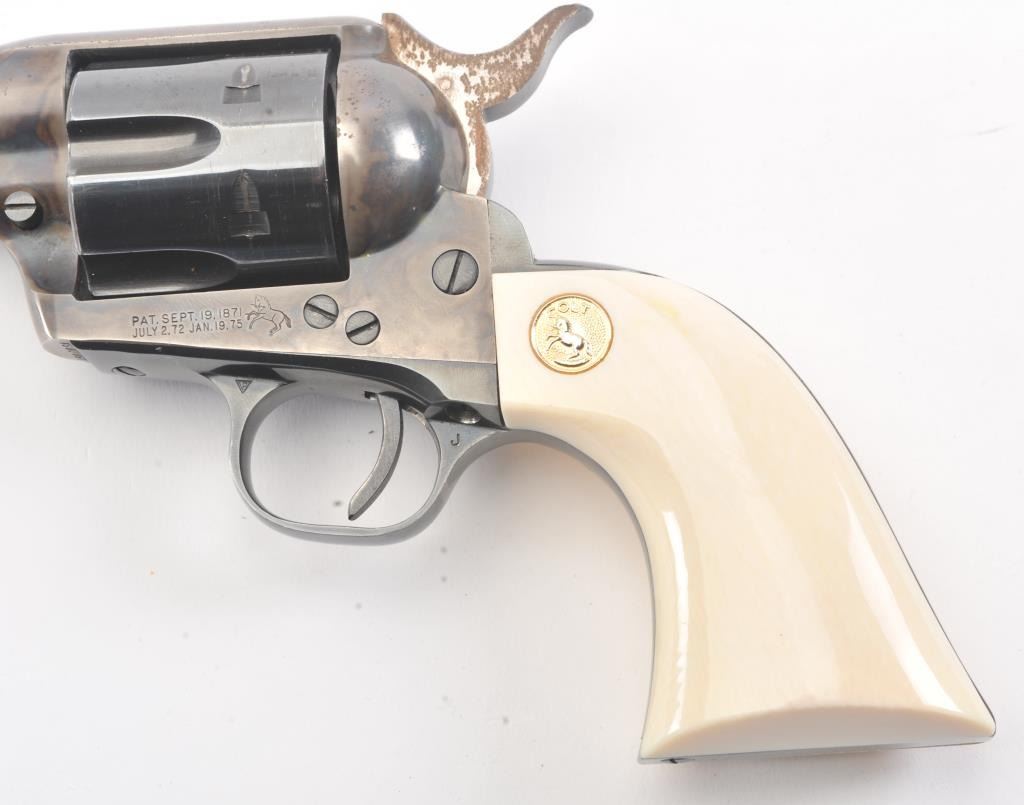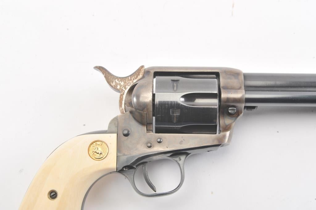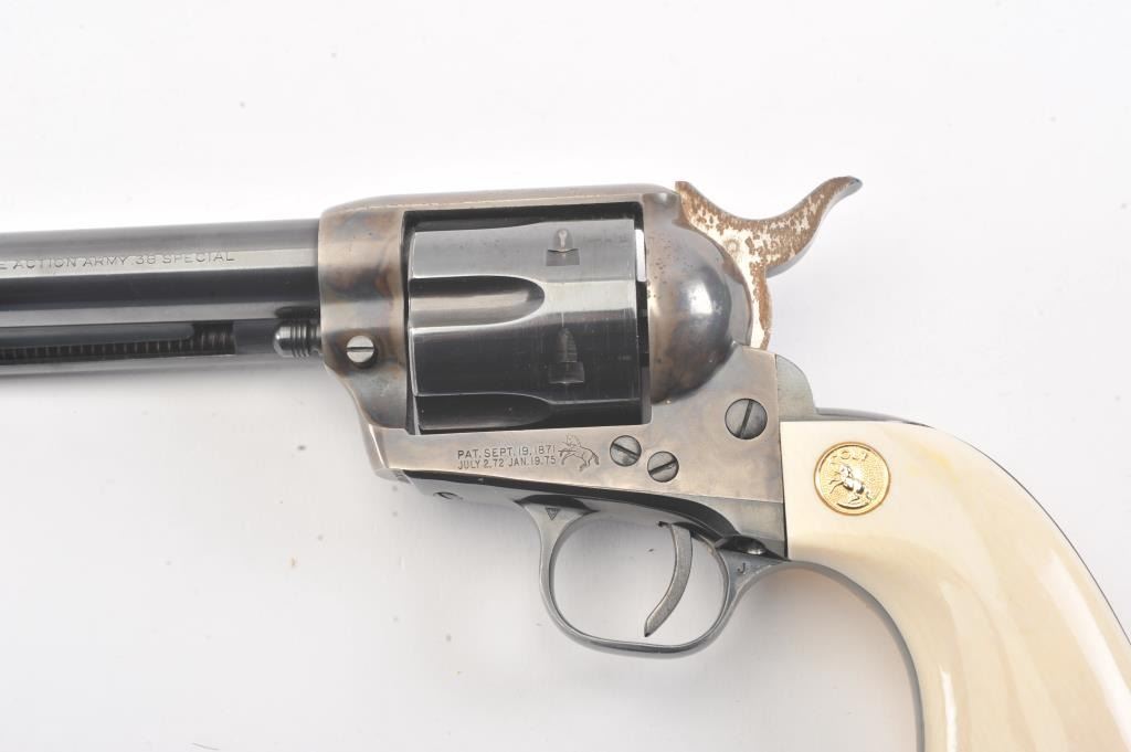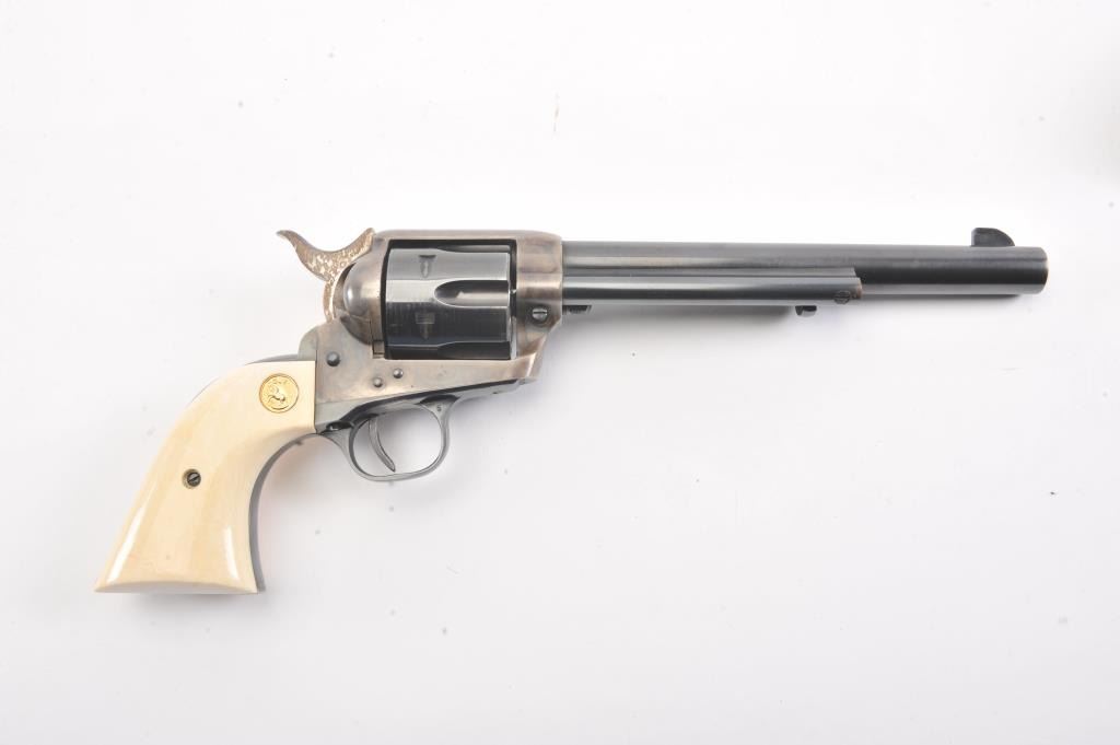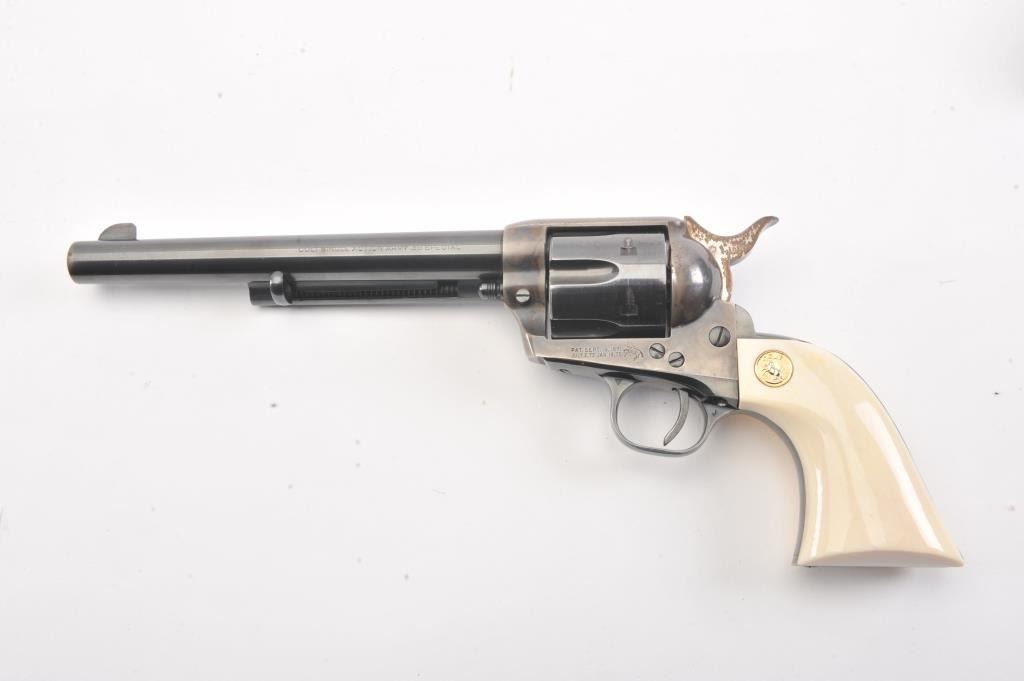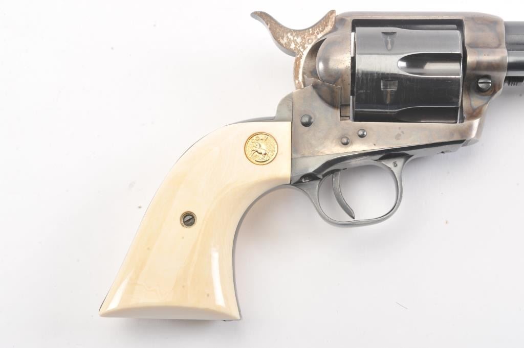 Colt 2nd Generation SAA revolver, #15808SA, .38 Special cal., 7-1/2” barrel, blue and case hardened finish, ivory medallion grips. Revolver is in overall fine condition showing the majority of its original blue and case colors, some muzzle wear and loss of finish on backstrap, surface rust on sides of hammer; fine bore, tuned action, sharp markings and fine grips. (C&R/PPT). Est.: $1,400-$2,800.