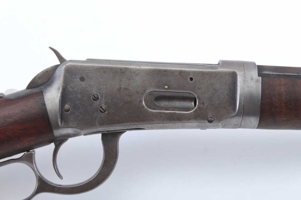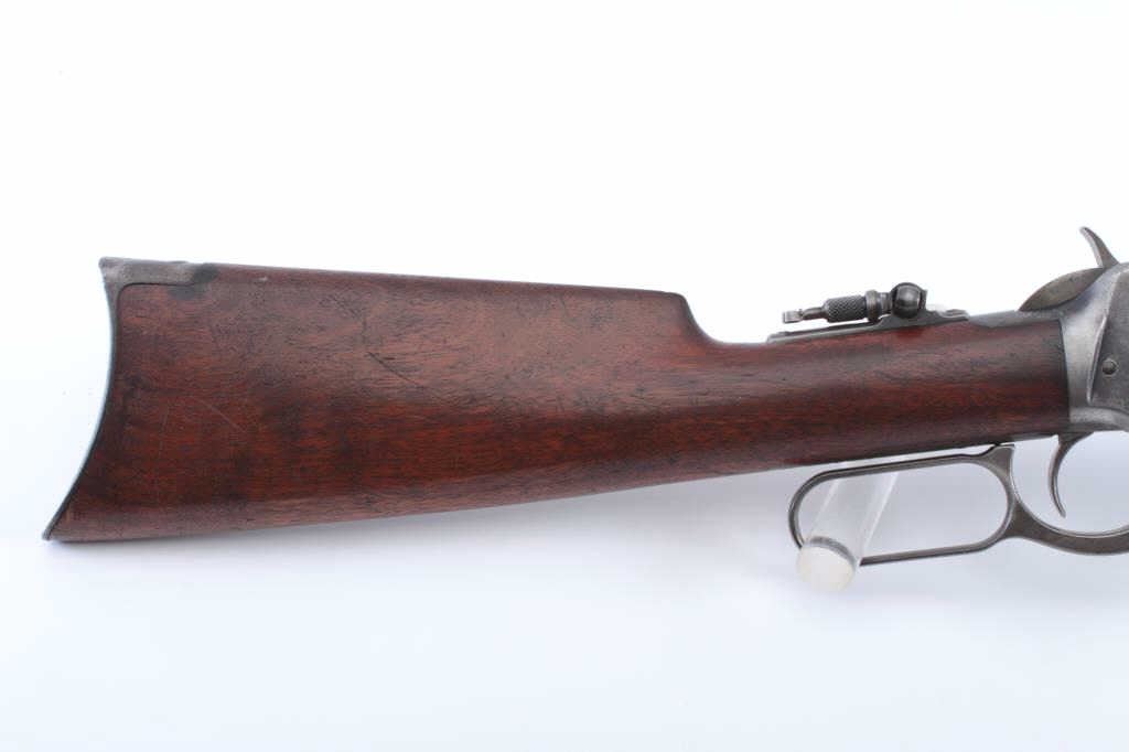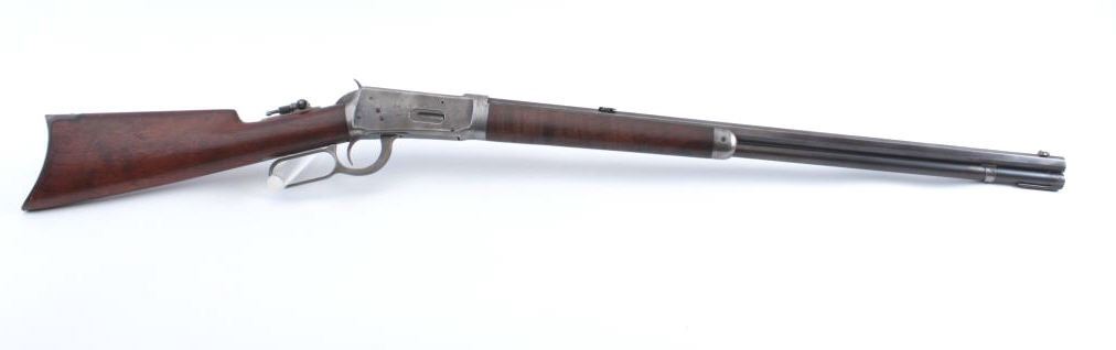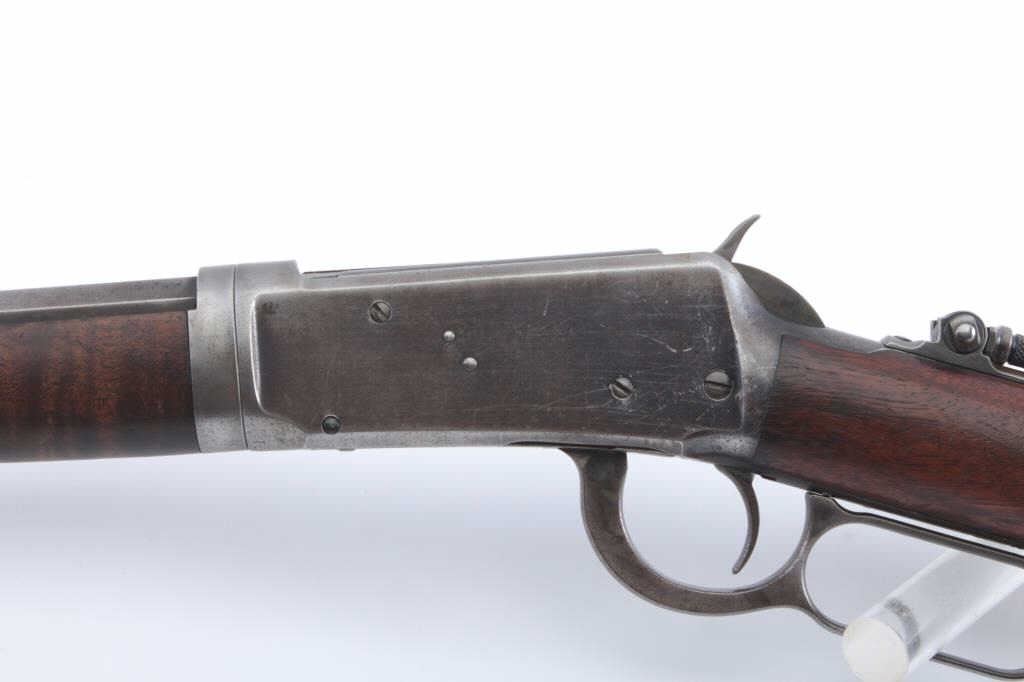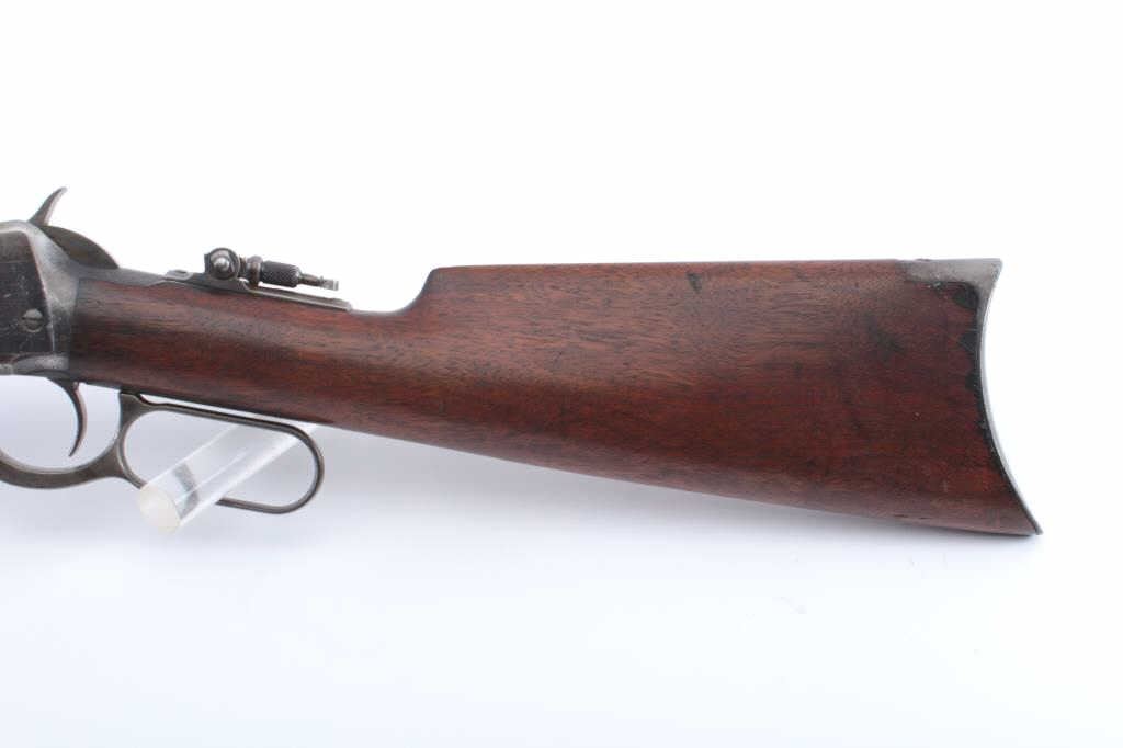 Winchester Model 1894 Takedown lever action rifle, .38-55 WCF caliber, Serial #133571. The rifle is in very good overall condition with a 26” octagon barrel with a folding Beeches front and a Lyman two-leaf foldingrear sights, take down frame and a full-length magazine. The barrel has drifted to plum patina with sharp edges, while the magazine retains a significant amount of muted blue finish. The receiver is a mixture of flaking original blue and brown patina with light surface erosion noted. The hammer, trigger and lever show significant muted case hardening and a period tang sight has been added during the period of use. The smooth wood stocks are in very good condition with light compressions and mars. The fore end wood has great figure and the butt ends with a smooth steel crescent butt plate. The bore is bright, the action iscrisp and the markings are sharp on this Model 1894 manufactured in 1898. Est.: $1,400-$2,800. (Antique).