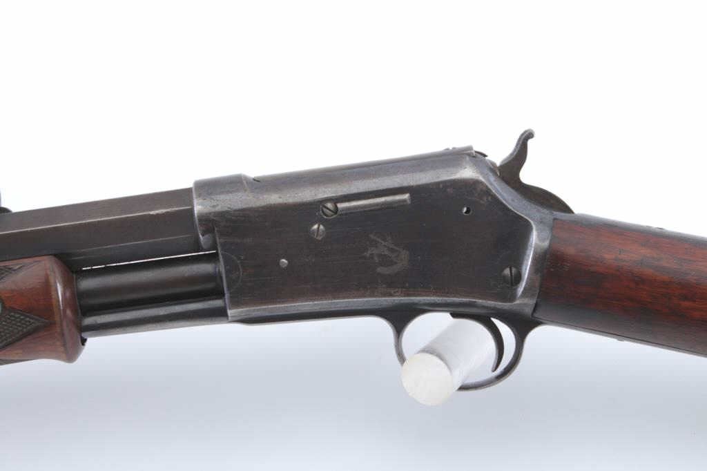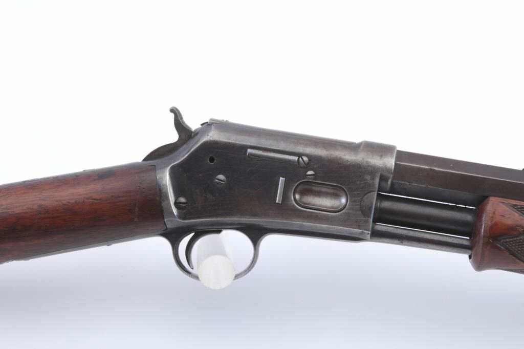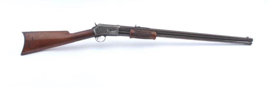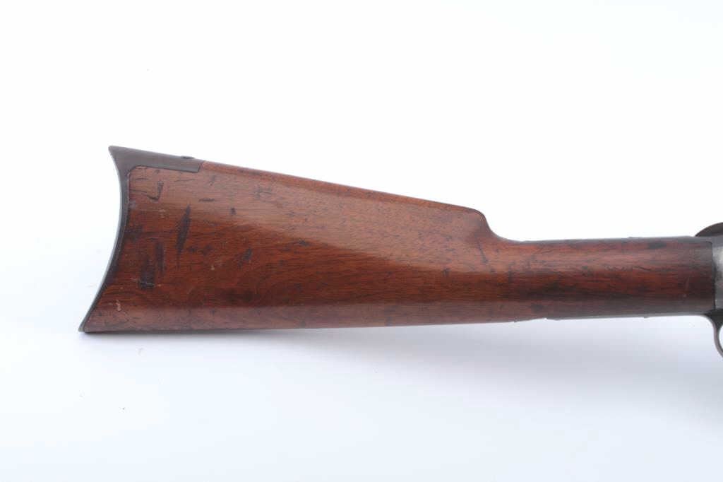 Colt Lightning pump rifle, .32-20 caliber, Serial #30967. The medium frame rifle is in very good overall condition with a 26” octagon barrel with dealer added Beeches front and buckhorn rear sights in theoriginal dove tails. The barrel and full-length magazine have drifted to grey/brown patina with muted original blue in the protected areas and sharp edges. The receiver retains a significant amount offlaking original blue finish with a crisp Rampant Colt emblem on the left side. The tang is slightly knackered and a screw is missing. The checkered wood fore end is in very good condition with some flattening ofthe checkering. The butt stock is good also with a smooth steel crescent butt plate. The bore is fair, the action is crisp and the markings are sharp on this desirable Lightning circa 1888. Est.: $1,200-$2,400. (Antique).