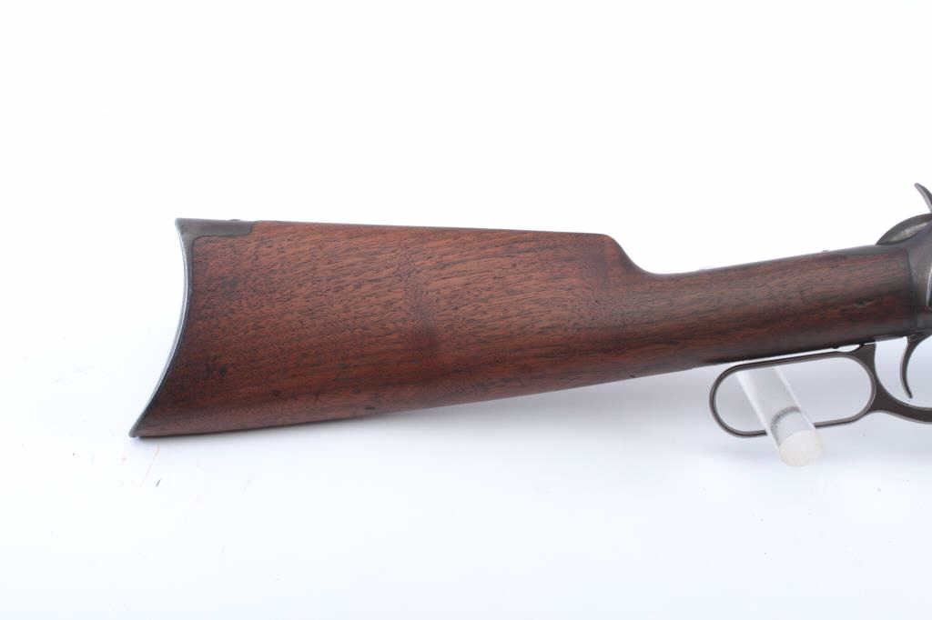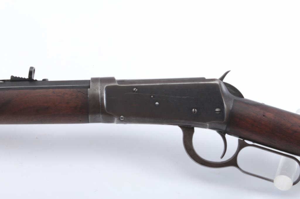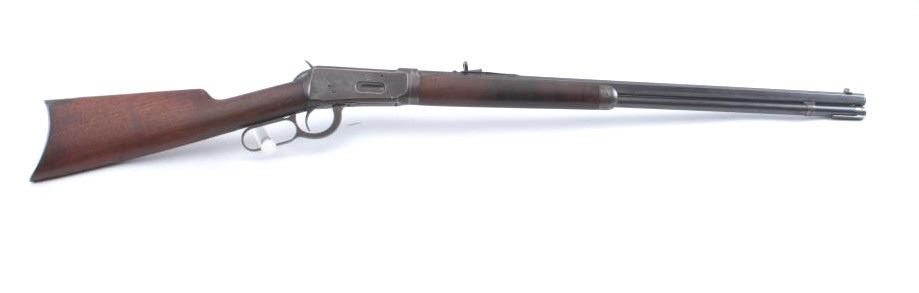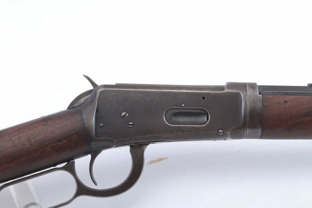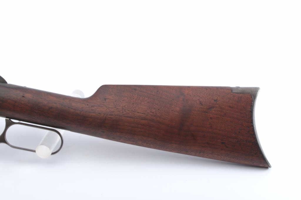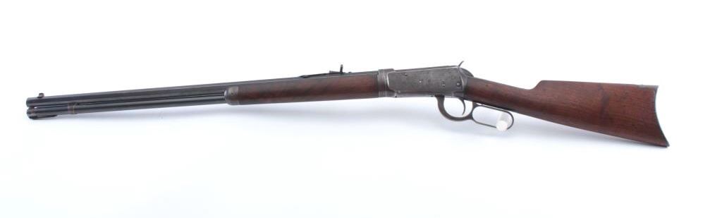 Winchester Model 1894 Takedown lever action rifle, .30 WCF caliber, Serial #417526. The rifle is in fine overall condition with a 26” Nickel steel octagon barrel with a Marbles No.3 front and buckhorn rear sights, takedown frame and a full-length magazine. The barrel and magazine retain a significant amount of toning blue finish with sharp edges. The receiver is a mixture of toning blue finish and plum patina with dull blue on the loading gate. The hammer, trigger and lever show muted case hardening. The smooth wood stocks are in very good condition with light compressions and mars. The fore end wood shows beautiful figure and the buttstock ends with a smooth steel crescent butt plate. The bore is bright, the action is crisp and the markings are sharp. Est.: $1,200-$2,400. (C+R).