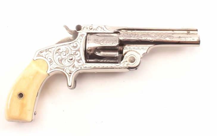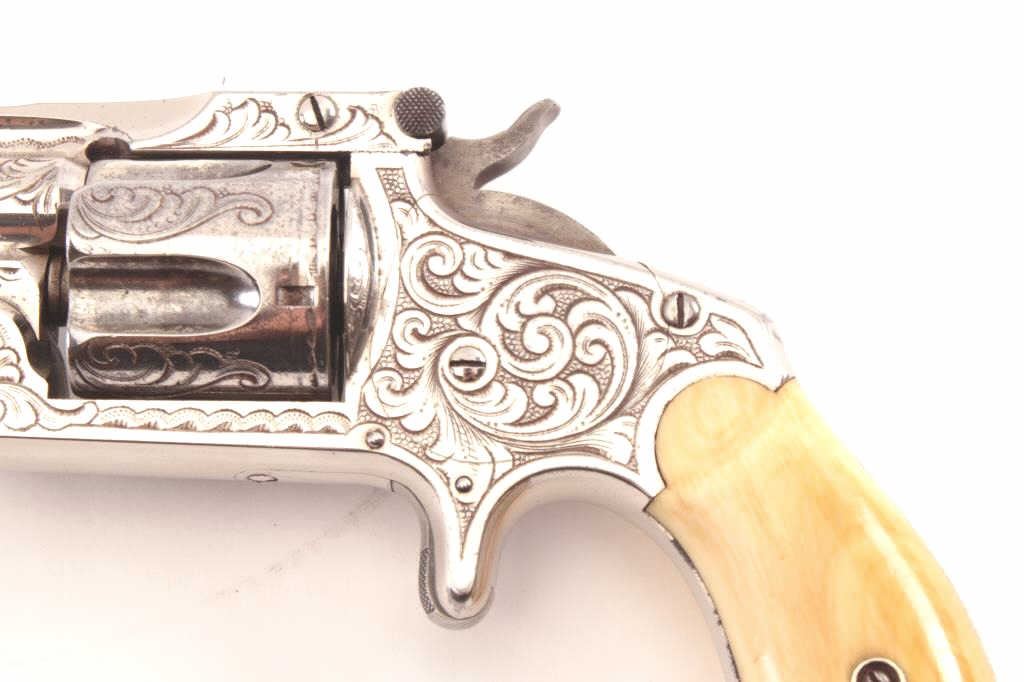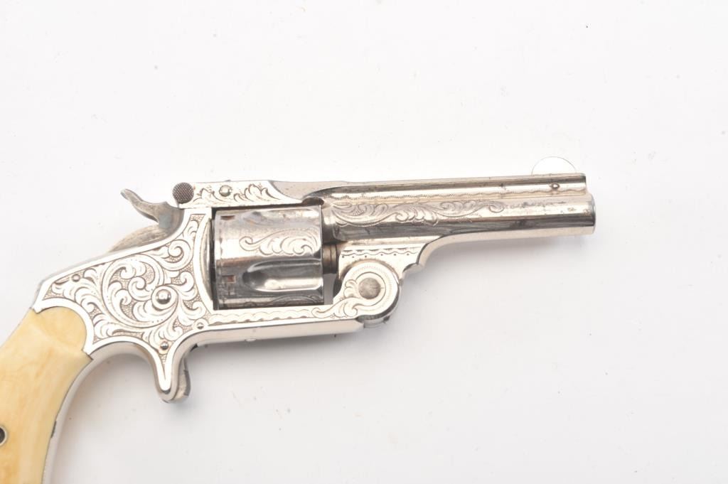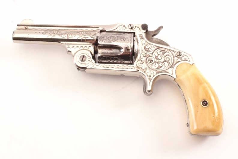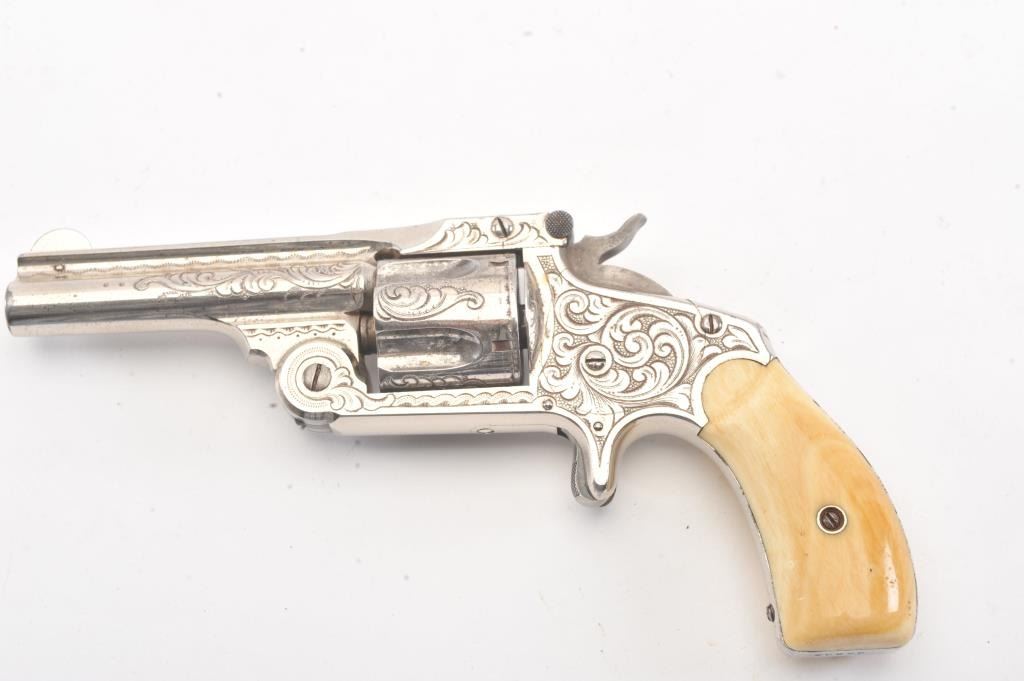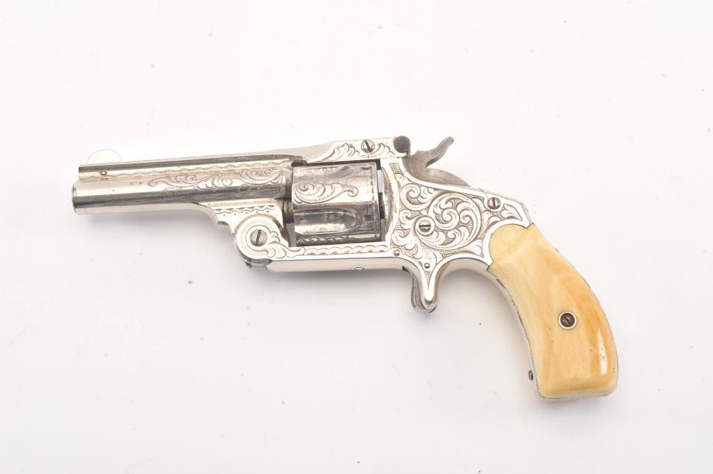 Exceptional New York Engraved Smith & Wesson 1st Model .38 canter fire single action revolver attributed to L.D. Nimschke’s shop, S/N 36605 with standard 3 ¼” barrel, nickel finish, and authentic to the period ivorygrips. This revolver shows tight and well detailed Germanic scrolls with typical L.D.N. ropes and borders. The pistol remains in near fine condition with 95%+ original nickel, sharp address and crisp edges. Someminor aging on the front of the cylinder. The grips are near fine with pleasing yellow patina and slight aging with impeccable fit. The hammer and small parts show generous amounts of original finish. The action istight. A strong 9 on a 1-10 scaler. (Antique) Est.: $1750-3500