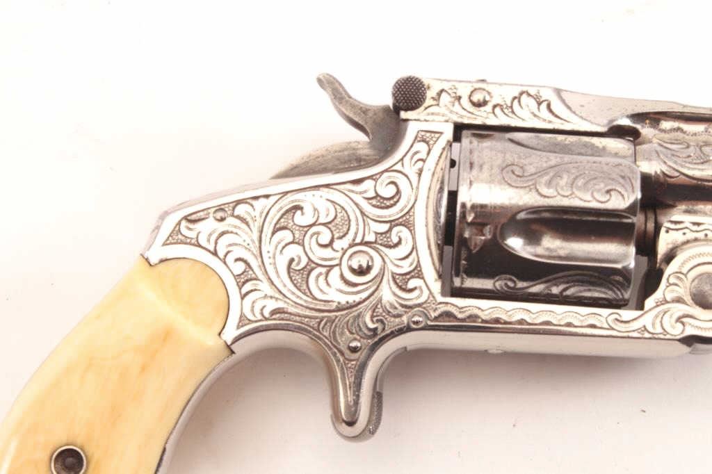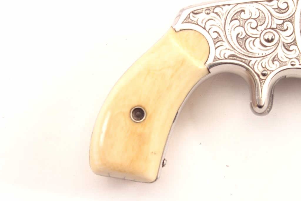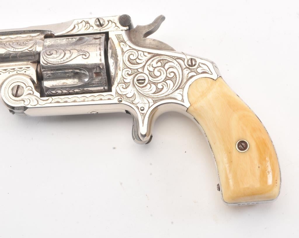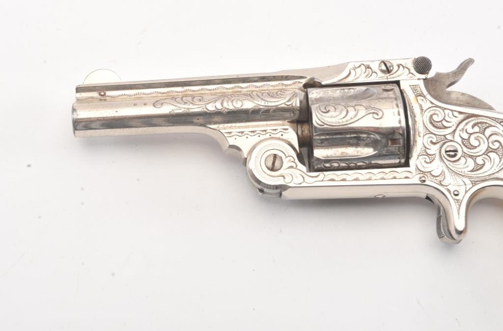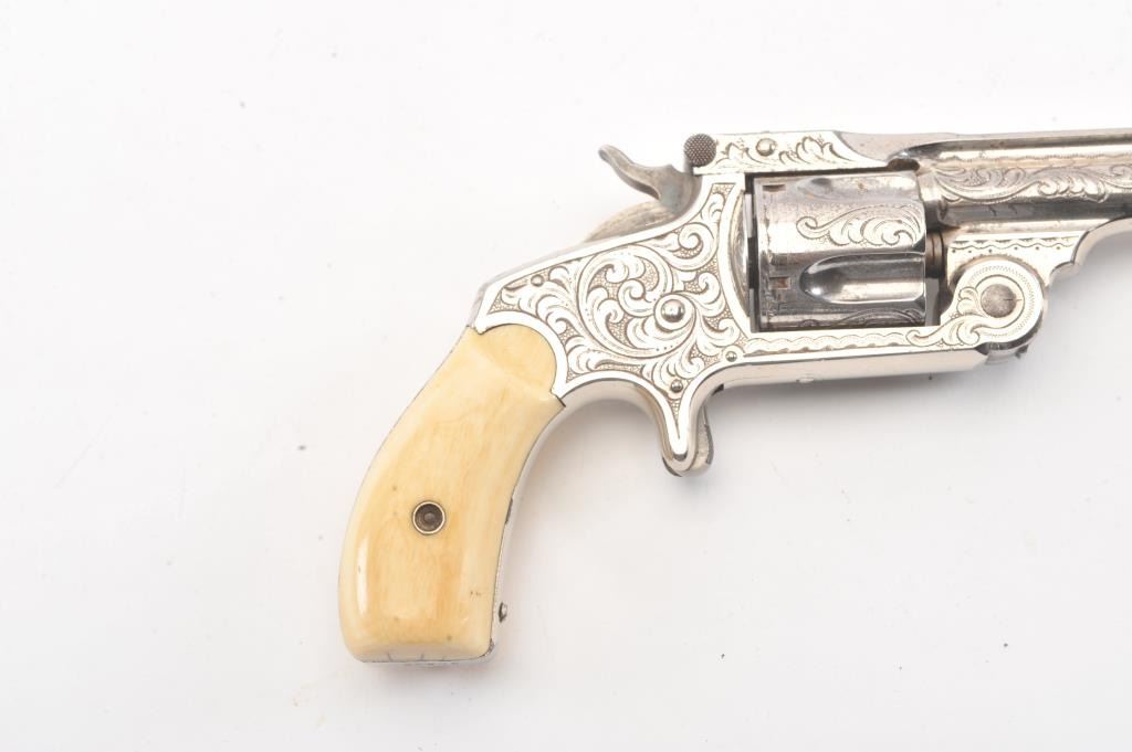 Exceptional New York Engraved Smith & Wesson 1st Model .38 canter fire single action revolver attributed to L.D. Nimschke’s shop, S/N 36605 with standard 3 ¼” barrel, nickel finish, and authentic to the period ivorygrips. This revolver shows tight and well detailed Germanic scrolls with typical L.D.N. ropes and borders. The pistol remains in near fine condition with 95%+ original nickel, sharp address and crisp edges. Someminor aging on the front of the cylinder. The grips are near fine with pleasing yellow patina and slight aging with impeccable fit. The hammer and small parts show generous amounts of original finish. The action istight. A strong 9 on a 1-10 scaler. (Antique) Est.: $1750-3500
