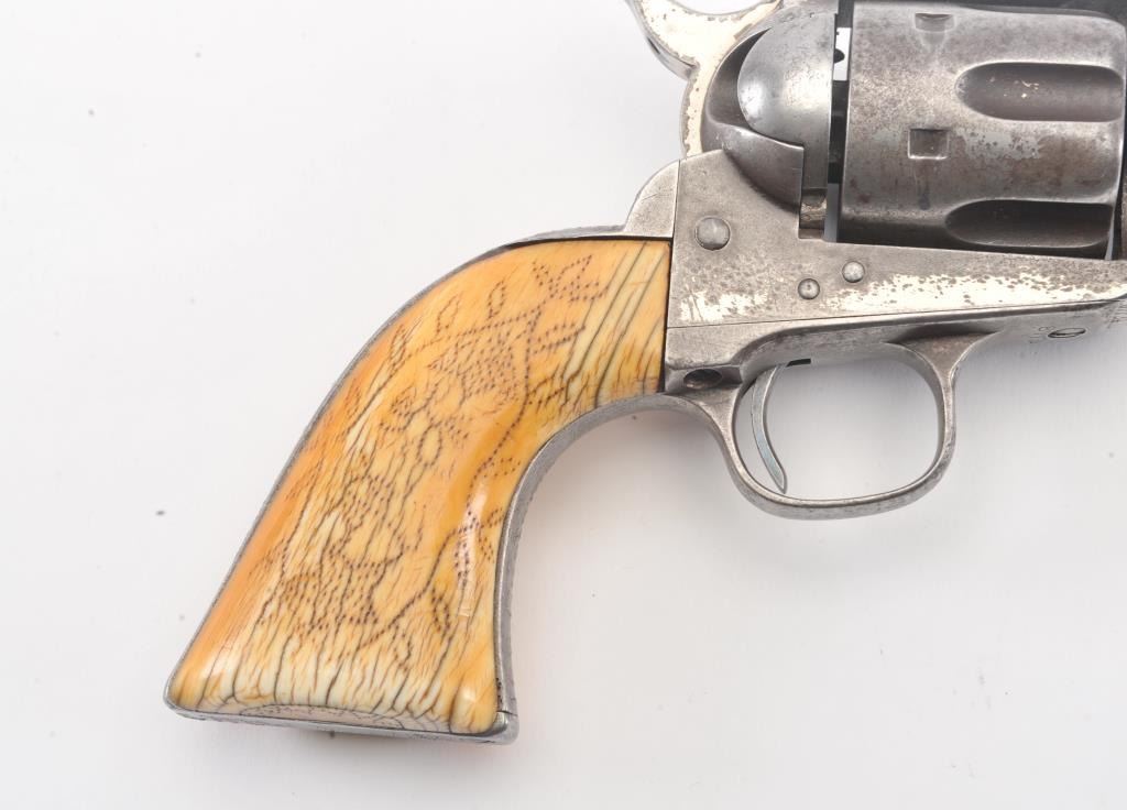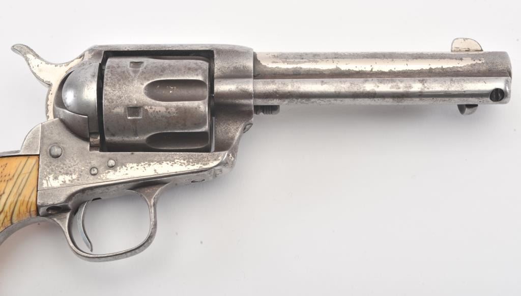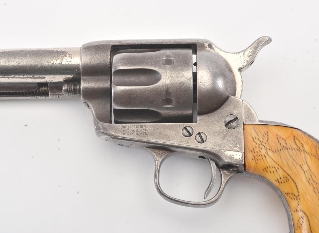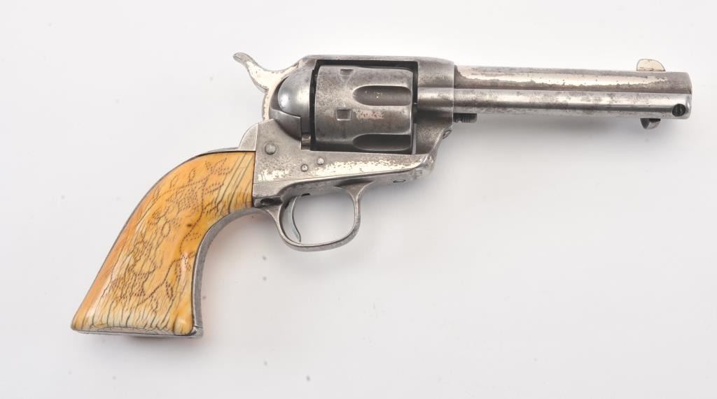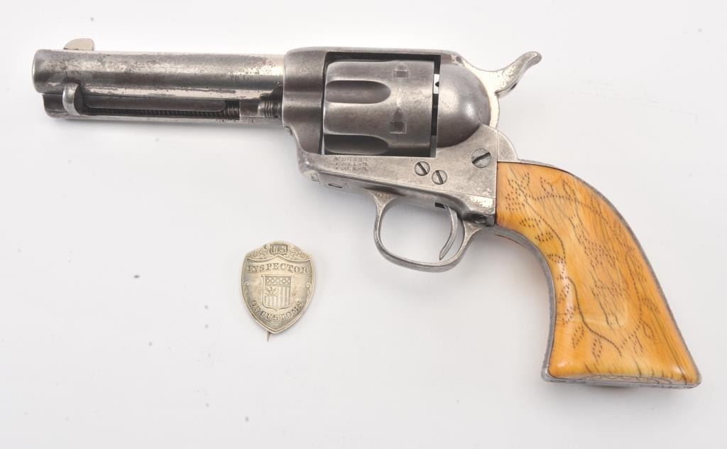 Important Colt SAA revolver, .45 caliber, 4.75” barrel, nickel finish, period decorated ivory grips, S/N 87734 (ca. 1883), with punch dot inscription on straps starting at top of back strap “W. W. Townsend to E. E. Townsend” and on butt “Mttd. Inspctr” with “U.S. Customs” on instrap. The top of the back strap shows “Aug 1895”. Accompanied by an original small “U.S. Inspector of Customs” marked shield badge of the same era. This Colt was recently discovered in an old collection in San Diego, California and upon researching the name E.E. Townsend, another similarly “punch dot” inscribed Colt was found that had been in the Donald Yena Collection, sold at Burley Auction Company as Lot 116 on March 4, 2014. W.W. Townsend was born Jan. 16, 1833, in Madison, Florida. He moved to Texas in 1859 and was instrumental in settling Colorado County. He served as a Captain in Whitefield’s C.S.A. Cavalry where he promoted from Sgt. to Captain after gallant actions and was badly wounded. He was married in 1864 to Maddle Woolsey and moved to Mexico where she died in 1867. After returning to Texas, he re-married Margaret Simmerson and had a son, Everett Ewing Townsend, Born Oct. 20, 1871. E.E. Townsend was a Texas Ranger in the Frontier Battalion, Sheriff, Texas Senator, Park Commissioner, Deputy U.S. Marshal, Customs Inspector and Border Agent. He was known as the “Father of Big Bend Park” for his role in its formation and preservation. This historic Colt displays 15-30% original nickel with the balance gone to a gray patina showing minor pitting and erosion; good markings, good overall; grips aged and undersized with period decorations in florals and geometrics; front sight slightly reduced at top. All matching serial numbers. The included small silver badge reading “U.S. Inspector of Customs” also shows an engraved shield and eagle with some wear and old repairs to the pin and catch on reverse; approximate size 1-1/2” x 1-1/8”. (Antique). Est.: $7,500-$15,000.