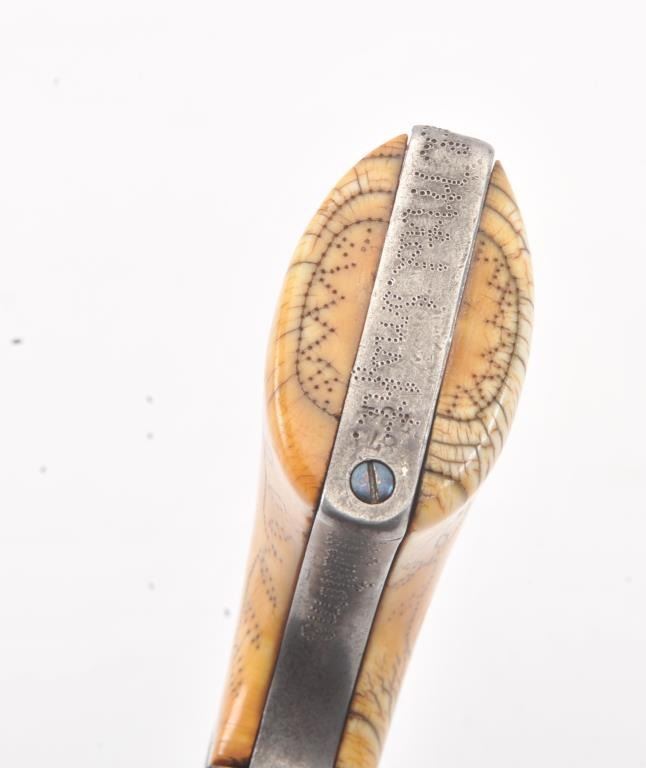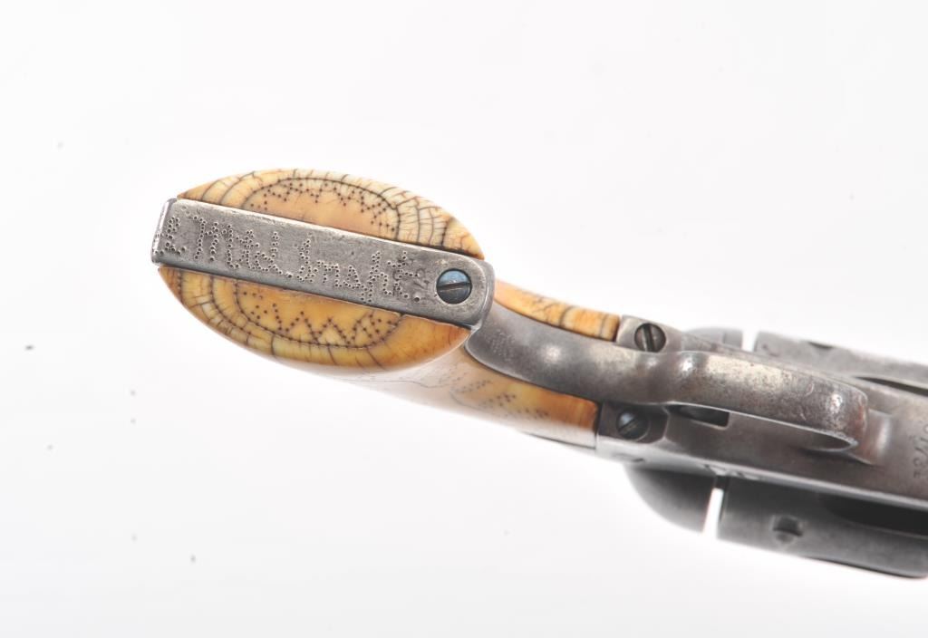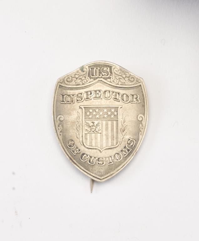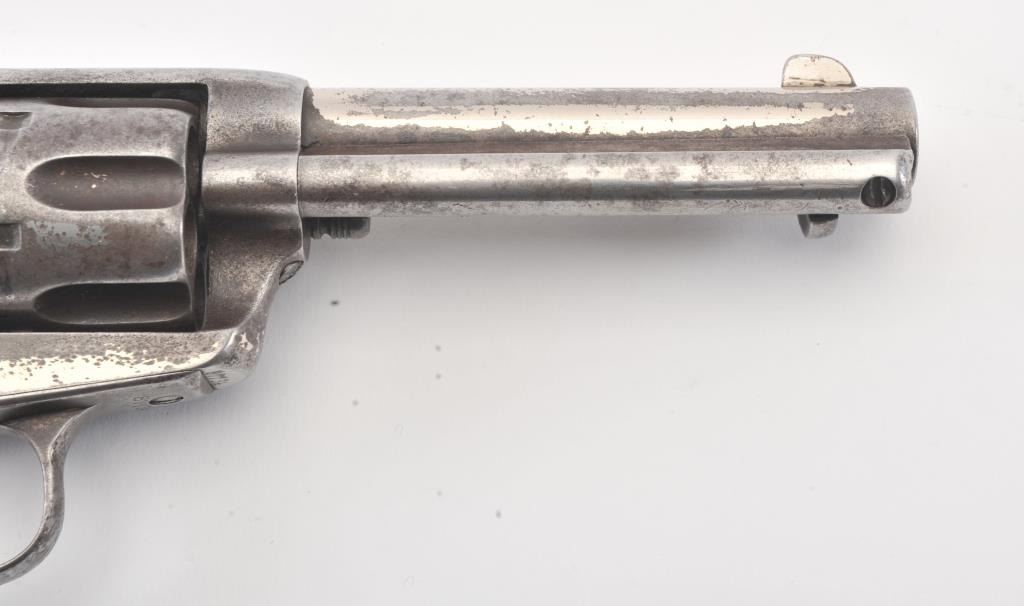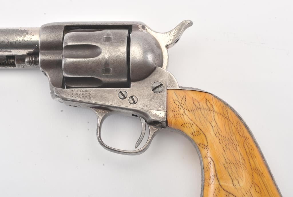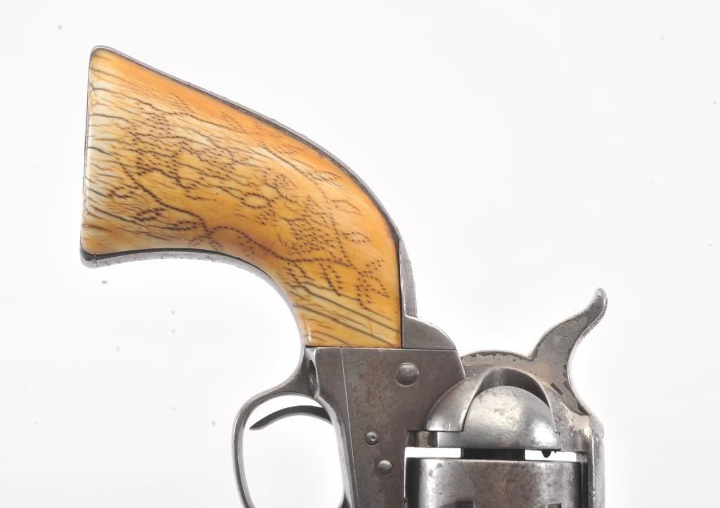 Important Colt SAA revolver, .45 caliber, 4.75” barrel, nickel finish, period decorated ivory grips, S/N 87734 (ca. 1883), with punch dot inscription on straps starting at top of back strap “W. W. Townsend to E. E. Townsend” and on butt “Mttd. Inspctr” with “U.S. Customs” on instrap. The top of the back strap shows “Aug 1895”. Accompanied by an original small “U.S. Inspector of Customs” marked shield badge of the same era. This Colt was recently discovered in an old collection in San Diego, California and upon researching the name E.E. Townsend, another similarly “punch dot” inscribed Colt was found that had been in the Donald Yena Collection, sold at Burley Auction Company as Lot 116 on March 4, 2014. W.W. Townsend was born Jan. 16, 1833, in Madison, Florida. He moved to Texas in 1859 and was instrumental in settling Colorado County. He served as a Captain in Whitefield’s C.S.A. Cavalry where he promoted from Sgt. to Captain after gallant actions and was badly wounded. He was married in 1864 to Maddle Woolsey and moved to Mexico where she died in 1867. After returning to Texas, he re-married Margaret Simmerson and had a son, Everett Ewing Townsend, Born Oct. 20, 1871. E.E. Townsend was a Texas Ranger in the Frontier Battalion, Sheriff, Texas Senator, Park Commissioner, Deputy U.S. Marshal, Customs Inspector and Border Agent. He was known as the “Father of Big Bend Park” for his role in its formation and preservation. This historic Colt displays 15-30% original nickel with the balance gone to a gray patina showing minor pitting and erosion; good markings, good overall; grips aged and undersized with period decorations in florals and geometrics; front sight slightly reduced at top. All matching serial numbers. The included small silver badge reading “U.S. Inspector of Customs” also shows an engraved shield and eagle with some wear and old repairs to the pin and catch on reverse; approximate size 1-1/2” x 1-1/8”. (Antique). Est.: $7,500-$15,000.