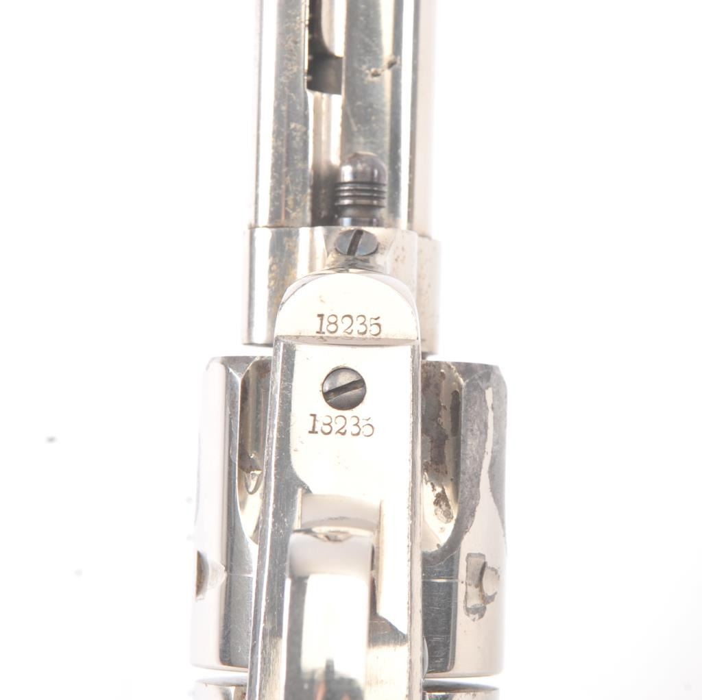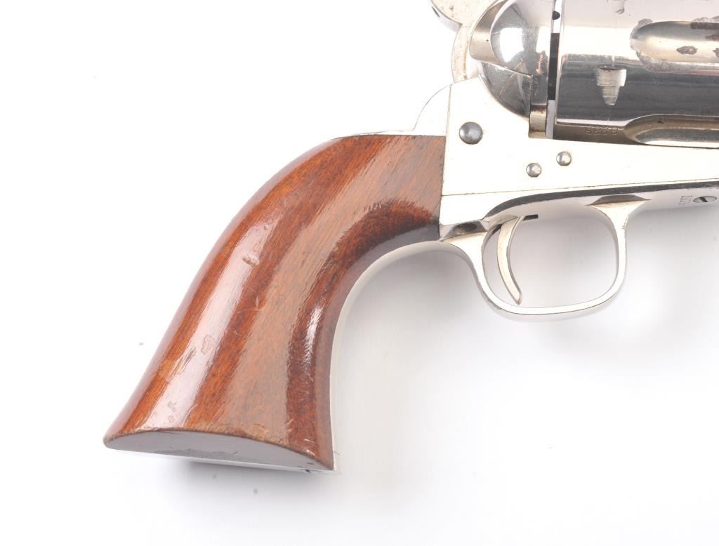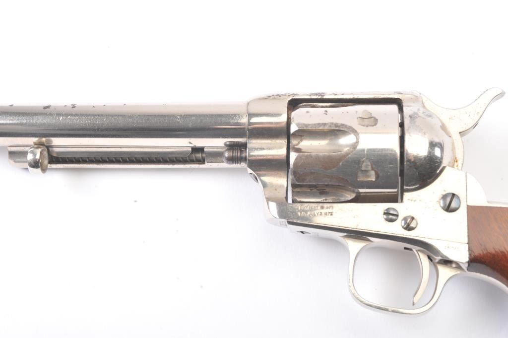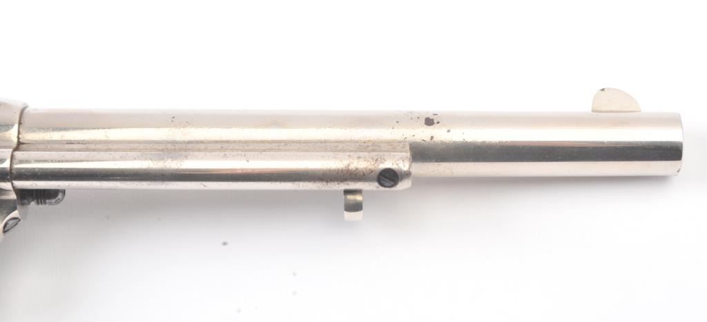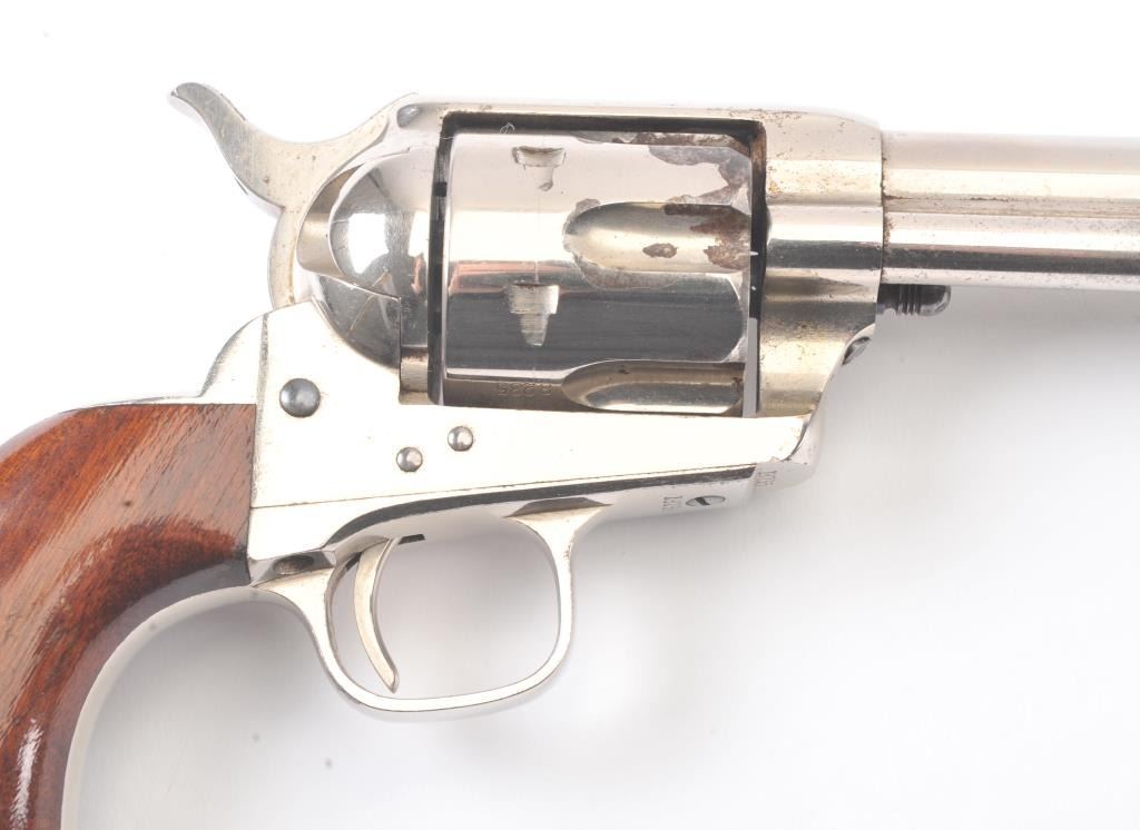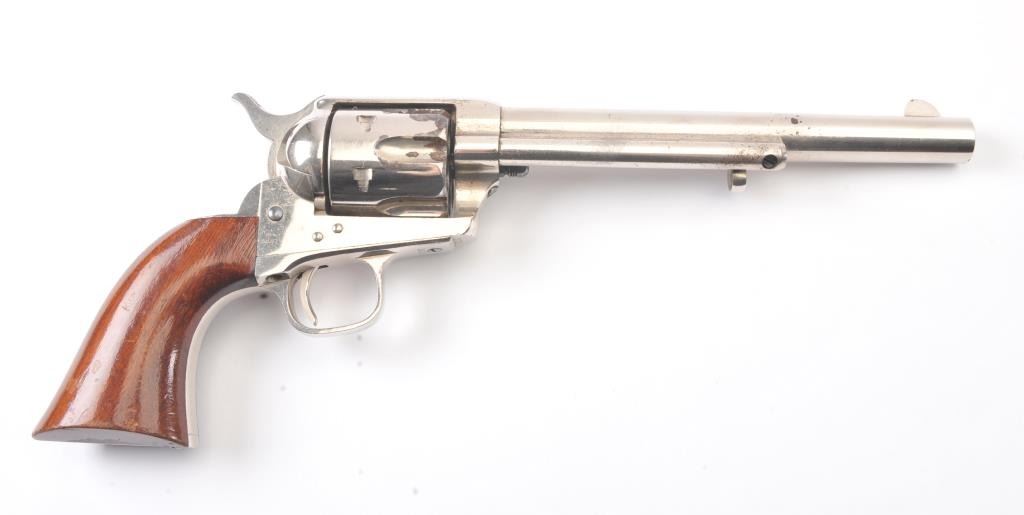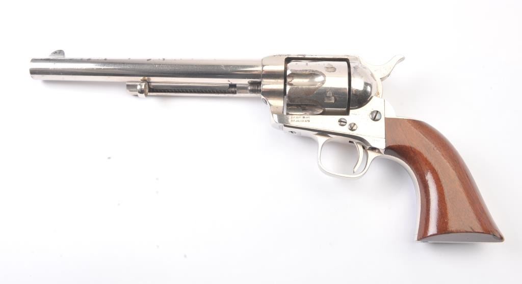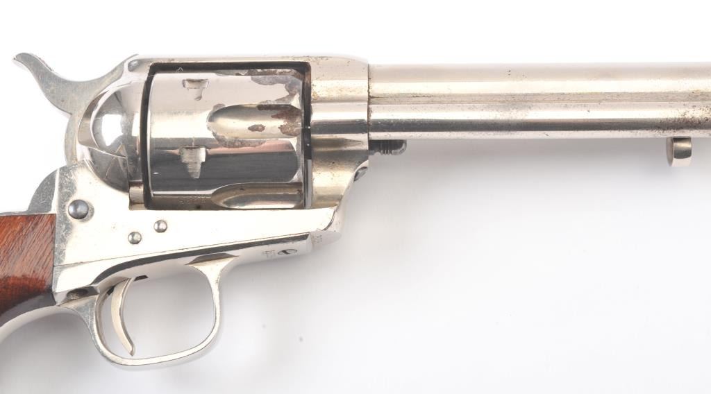 Colt SAA revolver, .45 Colt caliber, 7.5” barrel, nickel finish, wood grips, S/N 18,235 (made in 1875). This immaculate and early Single Action shows italic address and 2-line patent dates. The revolver shows 90-95% original to the period nickel finish. There is flaking and peeling mostly on the cylinder and some minor pitting where the finish has lifted. The nickel is soft and natural with no polishing. The grips are fine to excellent with 95-98%of original varnish and just minimal handling and very slight losses at edges of butt. The screws and small parts show considerable original bright blue; early cylinder pin with hole, correct hammer, ejector and other small parts with all matching numbers and correct ejector rod housing; bright bore and shows little to almost no use. The front sight is its original full height. We do not have a factory letter at point of cataloging and these early nickel Colts almost always letter as blue as Colt Firearms sent them to Ames to be nickled outside the factory in this era and it has been the subject of an article in the Rampant Colt Magazine and is a well-known fact to sophisticated Colt collectors. This Colt was recently discovered in an old San Diego Collection and is fresh to the market. A strong 9 + on a 1-10 scale and very difficult to improve upon in the 1875 early frontier date. (Antique). Est.: $8,000-$16,000.