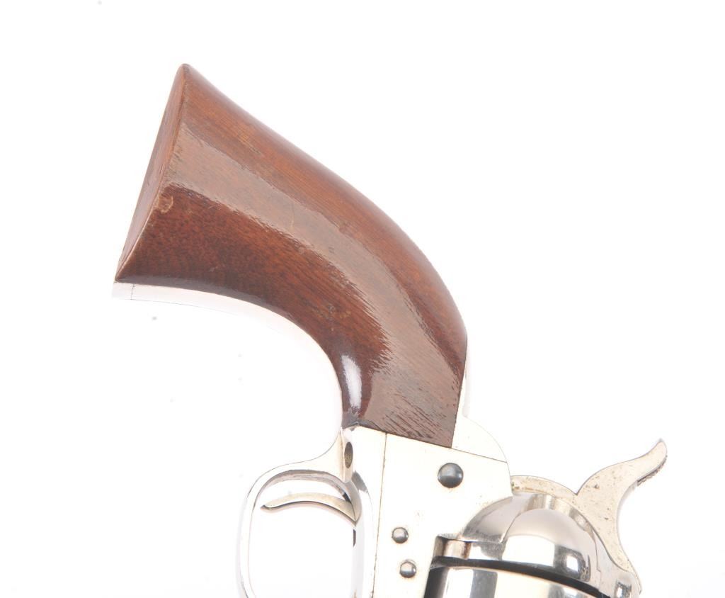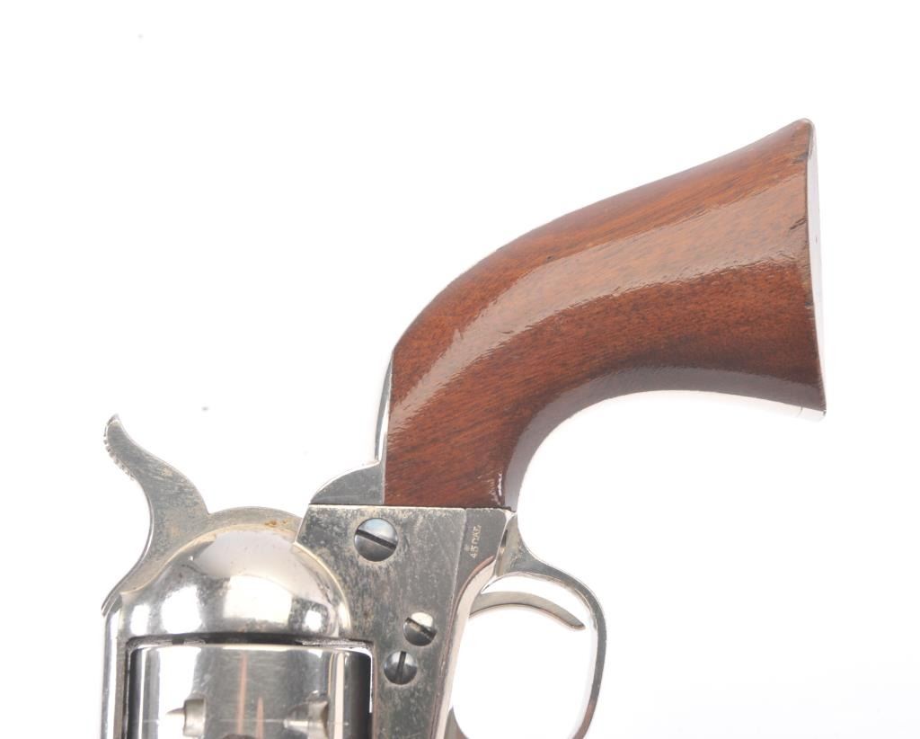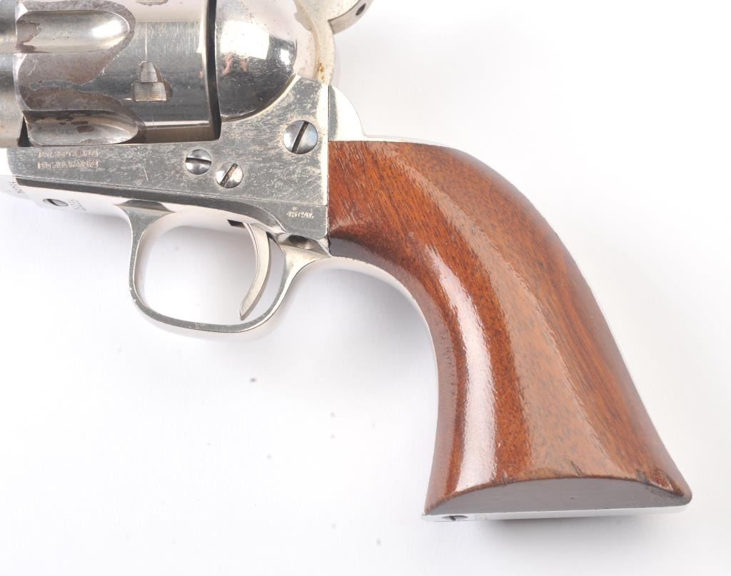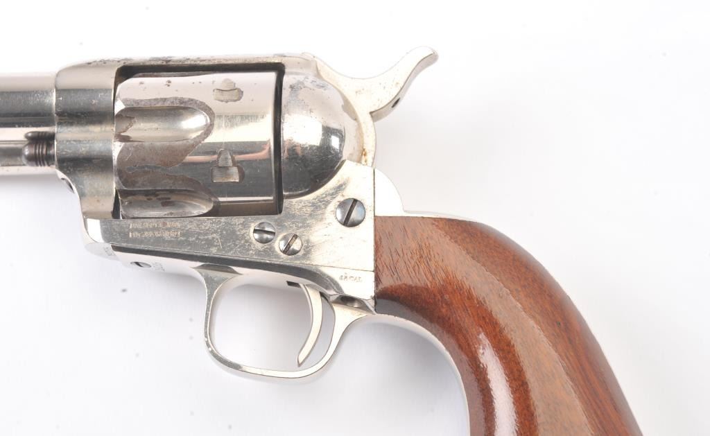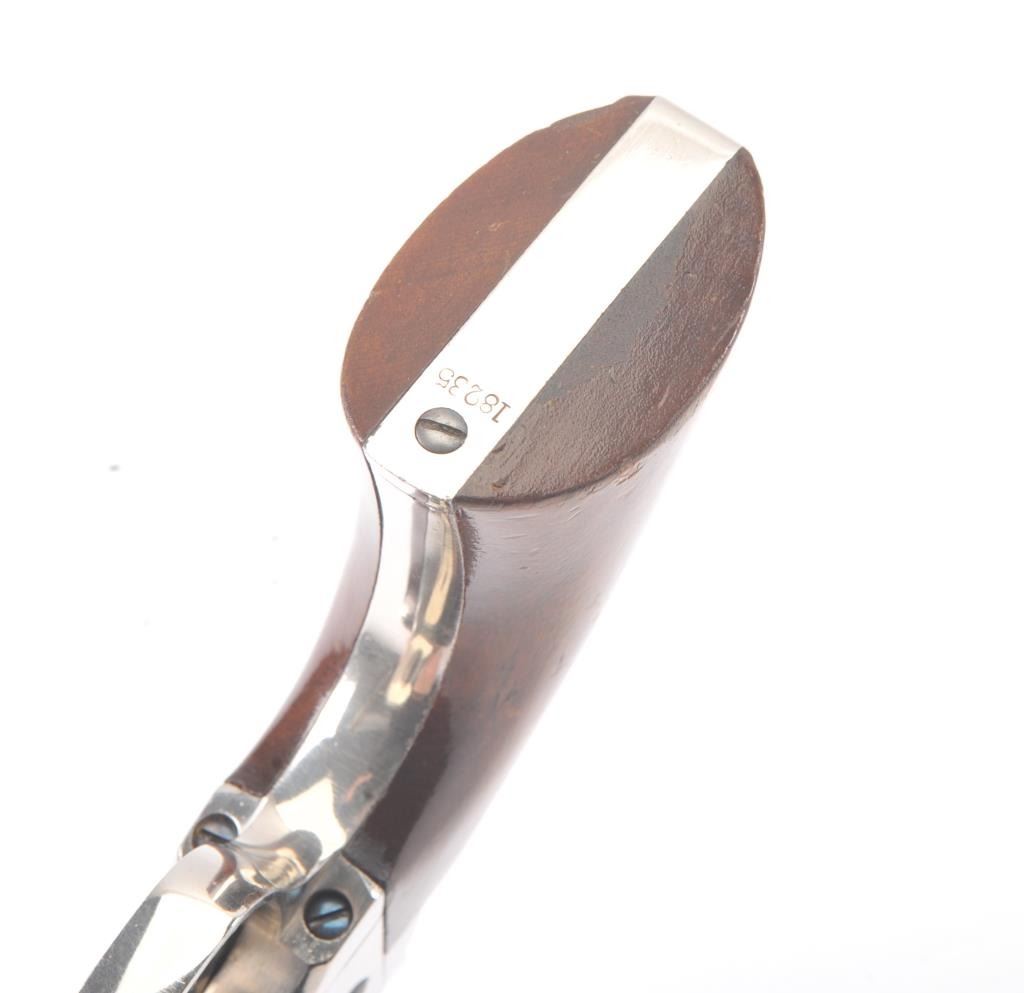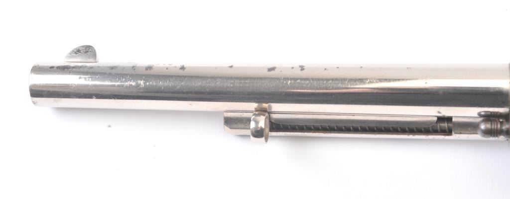 Colt SAA revolver, .45 Colt caliber, 7.5” barrel, nickel finish, wood grips, S/N 18,235 (made in 1875). This immaculate and early Single Action shows italic address and 2-line patent dates. The revolver shows 90-95% original to the period nickel finish. There is flaking and peeling mostly on the cylinder and some minor pitting where the finish has lifted. The nickel is soft and natural with no polishing. The grips are fine to excellent with 95-98%of original varnish and just minimal handling and very slight losses at edges of butt. The screws and small parts show considerable original bright blue; early cylinder pin with hole, correct hammer, ejector and other small parts with all matching numbers and correct ejector rod housing; bright bore and shows little to almost no use. The front sight is its original full height. We do not have a factory letter at point of cataloging and these early nickel Colts almost always letter as blue as Colt Firearms sent them to Ames to be nickled outside the factory in this era and it has been the subject of an article in the Rampant Colt Magazine and is a well-known fact to sophisticated Colt collectors. This Colt was recently discovered in an old San Diego Collection and is fresh to the market. A strong 9 + on a 1-10 scale and very difficult to improve upon in the 1875 early frontier date. (Antique). Est.: $8,000-$16,000.