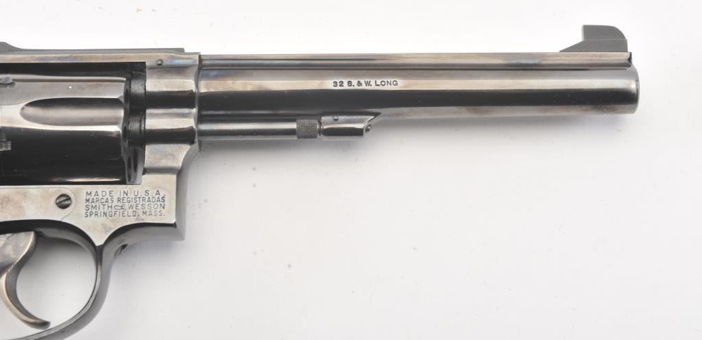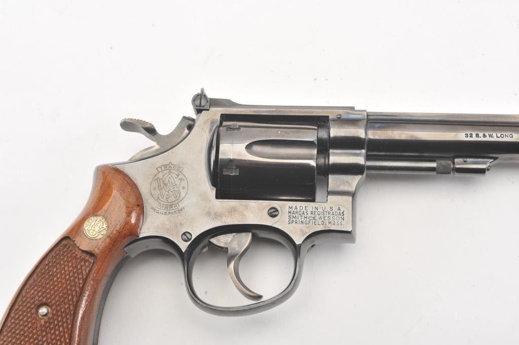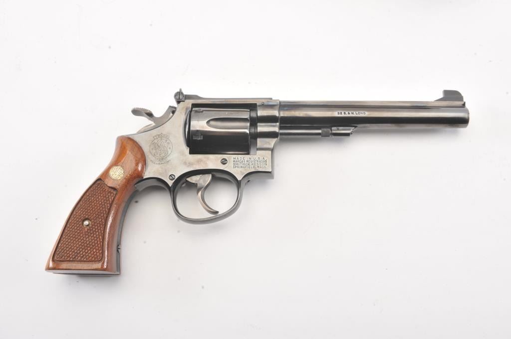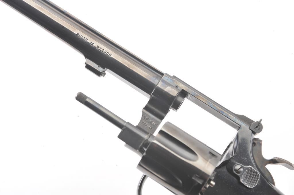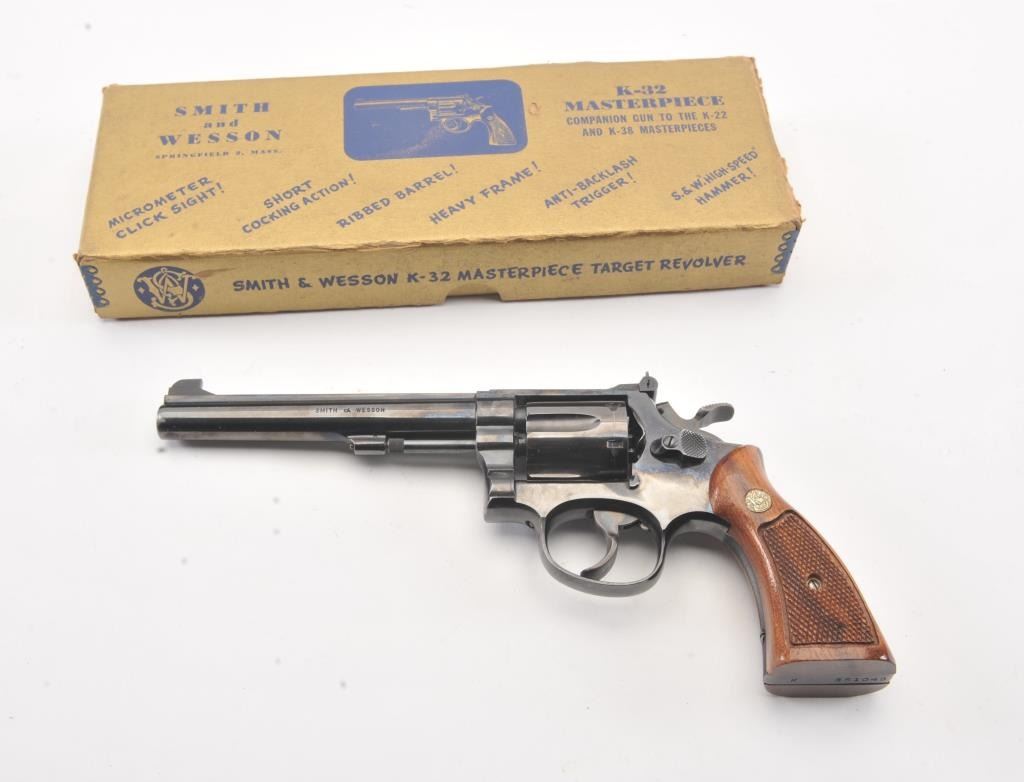 Extremely rare Smith & Wesson Model 16 (K-32), #K351048, .32 S&W Long cal., 6" barrel, blued finish, target hammer, target trigger, adjustable sights, checkered logo square butt grips, with gold and blue twopiece S&W box. The revolver is in near excellent condition overall, showing just slight muzzle wear, 97-98% original blue, with strong case colors on the trigger and hammer. The bore is excellent, action iscrisp, there is a moderate drag line on the cylinder. The grips are near excellent, but slightly later than the gun. The two piece S&W gold and blue box is in very good plus condition. Only 3,630 Model 16's wereproduced between 1947 and 1974, and this is an outstanding example. (C&R/PPT) Est. $700-1400