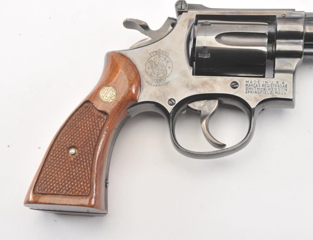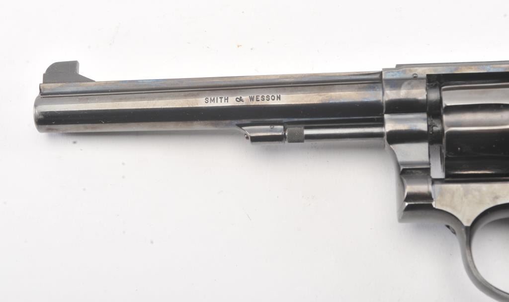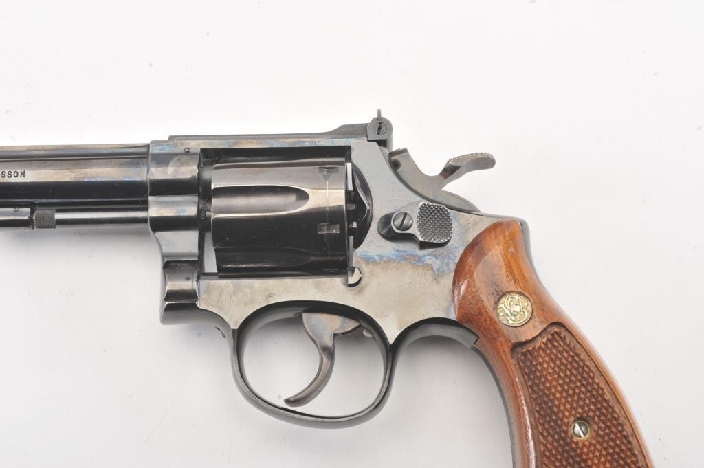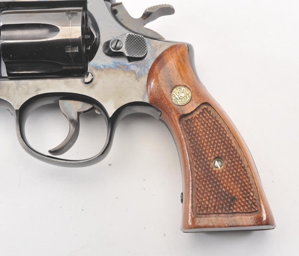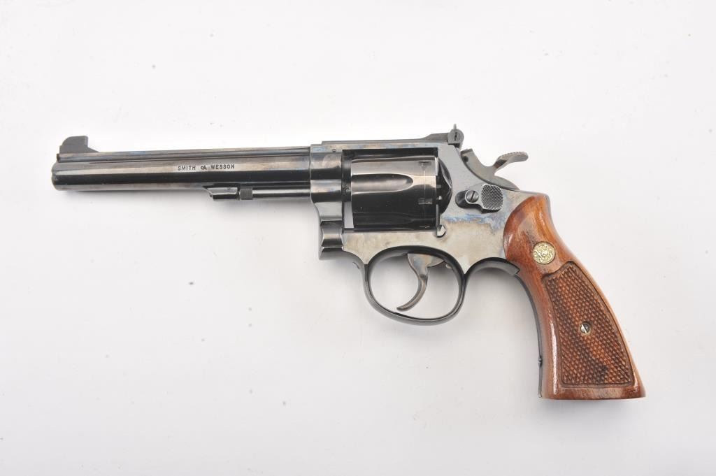 Extremely rare Smith & Wesson Model 16 (K-32), #K351048, .32 S&W Long cal., 6" barrel, blued finish, target hammer, target trigger, adjustable sights, checkered logo square butt grips, with gold and blue twopiece S&W box. The revolver is in near excellent condition overall, showing just slight muzzle wear, 97-98% original blue, with strong case colors on the trigger and hammer. The bore is excellent, action iscrisp, there is a moderate drag line on the cylinder. The grips are near excellent, but slightly later than the gun. The two piece S&W gold and blue box is in very good plus condition. Only 3,630 Model 16's wereproduced between 1947 and 1974, and this is an outstanding example. (C&R/PPT) Est. $700-1400