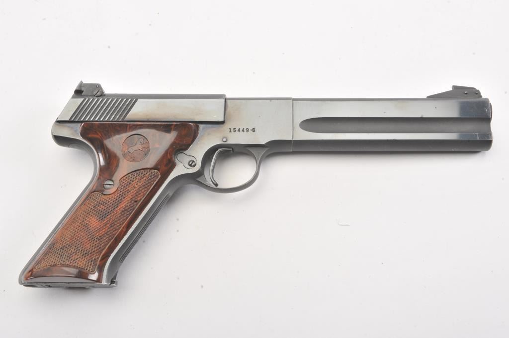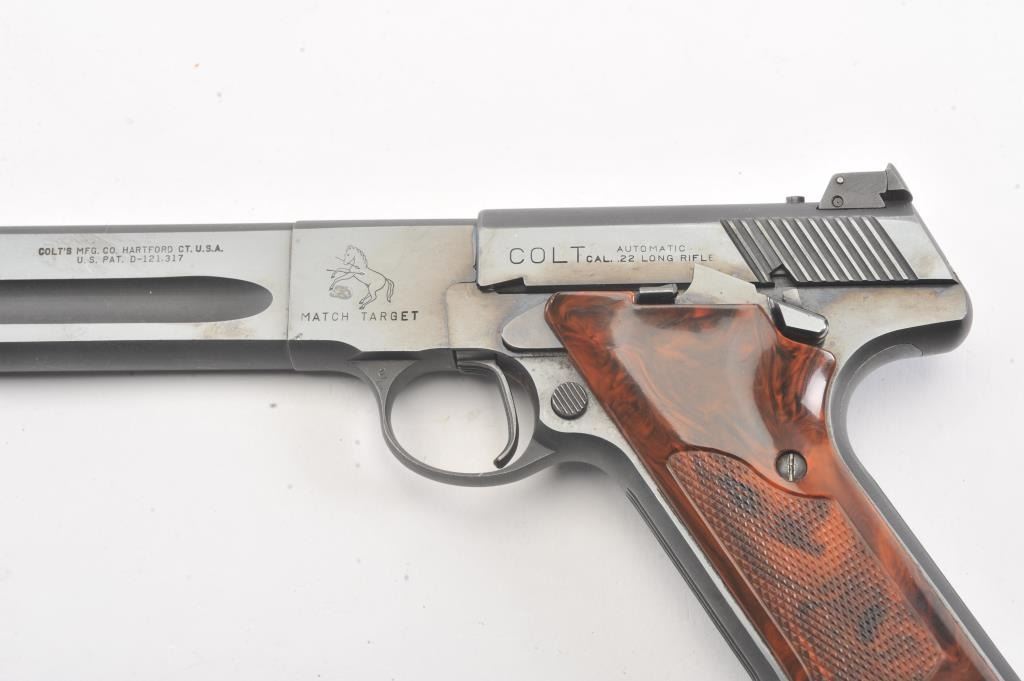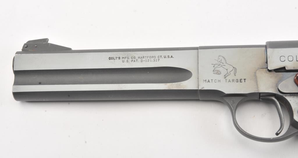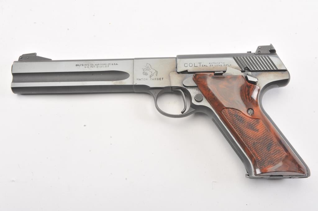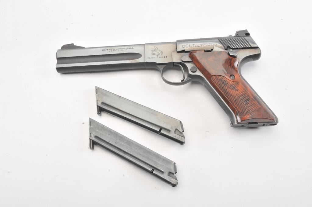 Colt Woodsman Match Target Model semi-automatic pistol, .22 Long Rifle caliber, Serial #15449-S. The pistol is in fine overall condition with a 6” barrel with a ramped blade front and adjustable rearsights. The pistol retains approximately 90%-95% of the blue finish with high point edge wear and light scratches. The checkered plastic grips are in very good condition with sharp checkering. The bore is good, the action is crisp and the markings are sharp. The lot includes three correct, Colt marked magazines. Est.: $600-$1,200. (C+R/PPT).