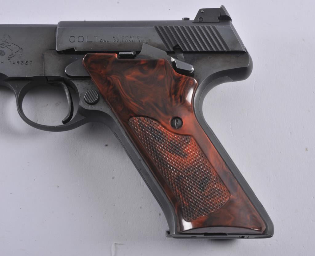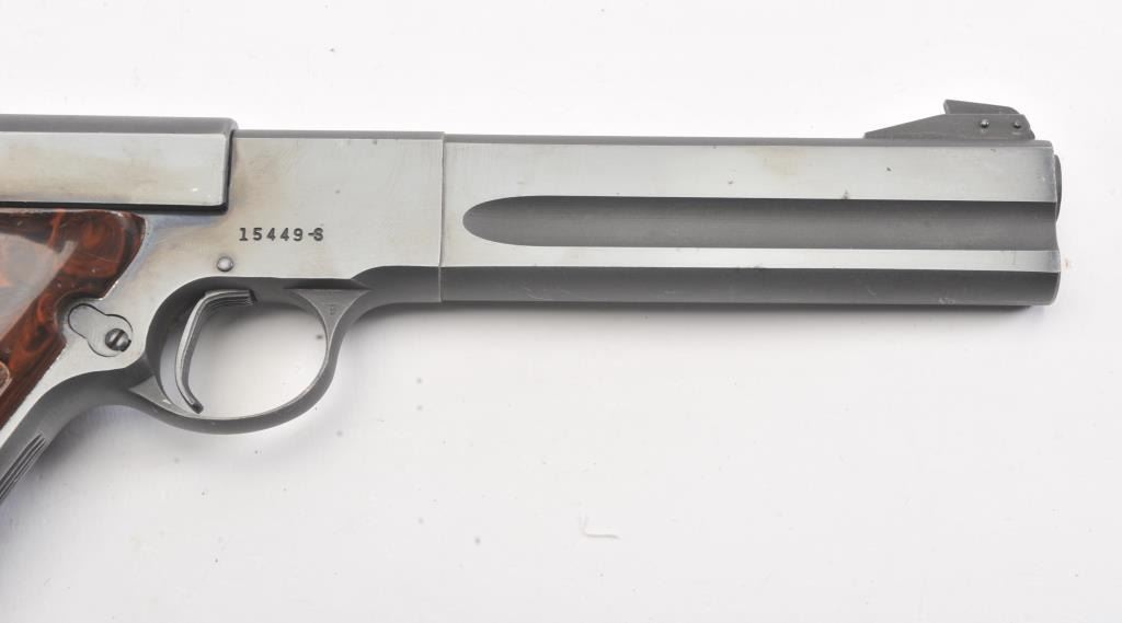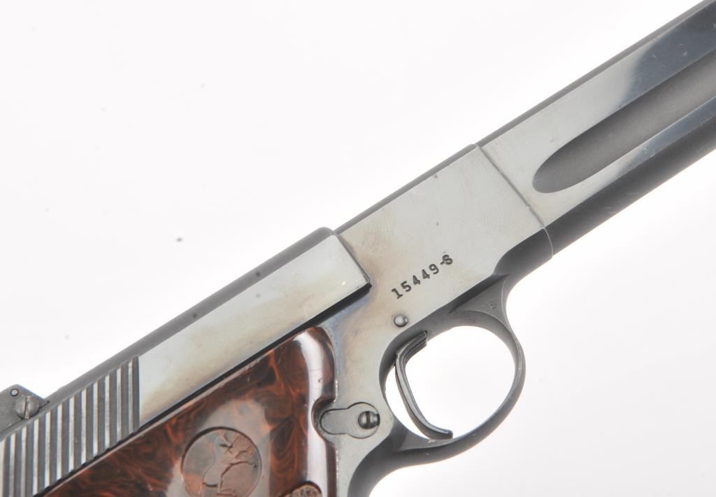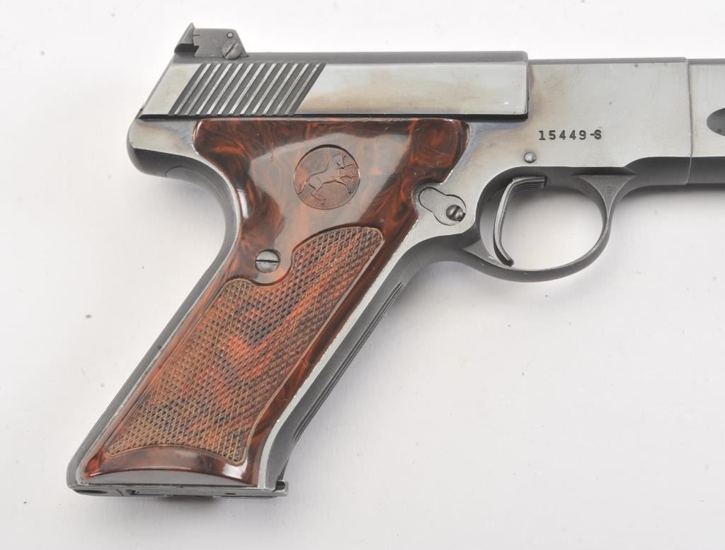 Colt Woodsman Match Target Model semi-automatic pistol, .22 Long Rifle caliber, Serial #15449-S. The pistol is in fine overall condition with a 6” barrel with a ramped blade front and adjustable rearsights. The pistol retains approximately 90%-95% of the blue finish with high point edge wear and light scratches. The checkered plastic grips are in very good condition with sharp checkering. The bore is good, the action is crisp and the markings are sharp. The lot includes three correct, Colt marked magazines. Est.: $600-$1,200. (C+R/PPT).