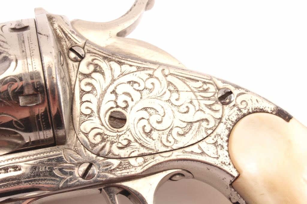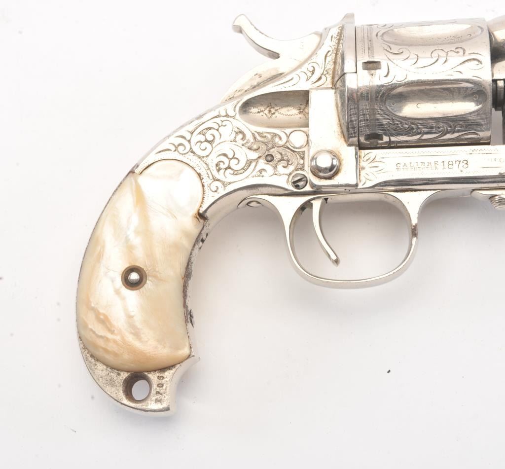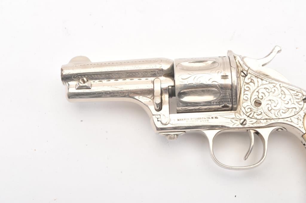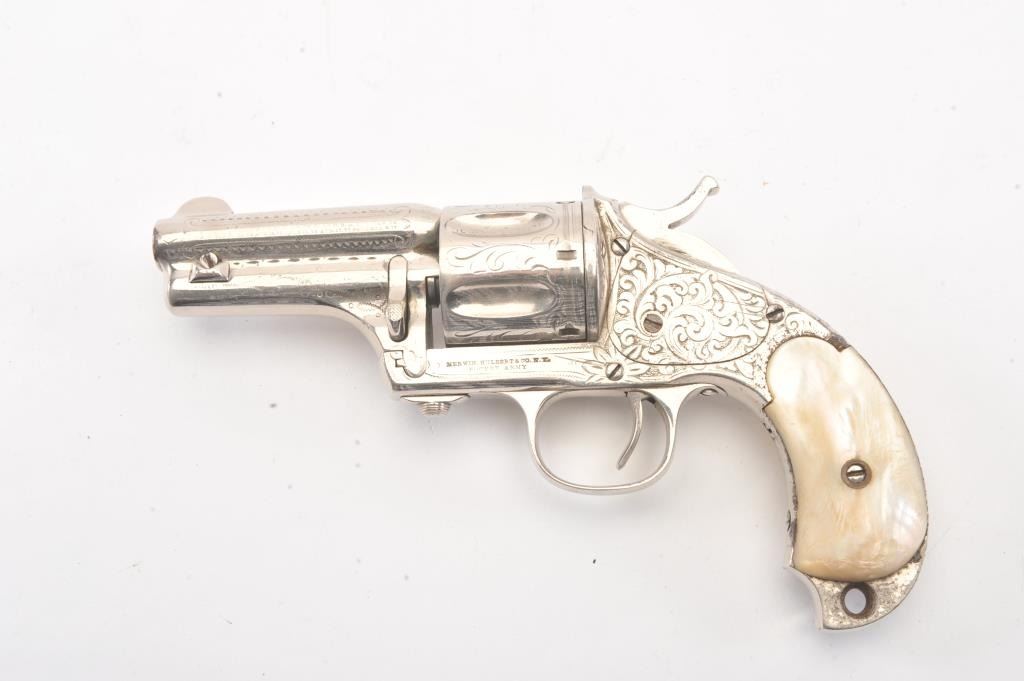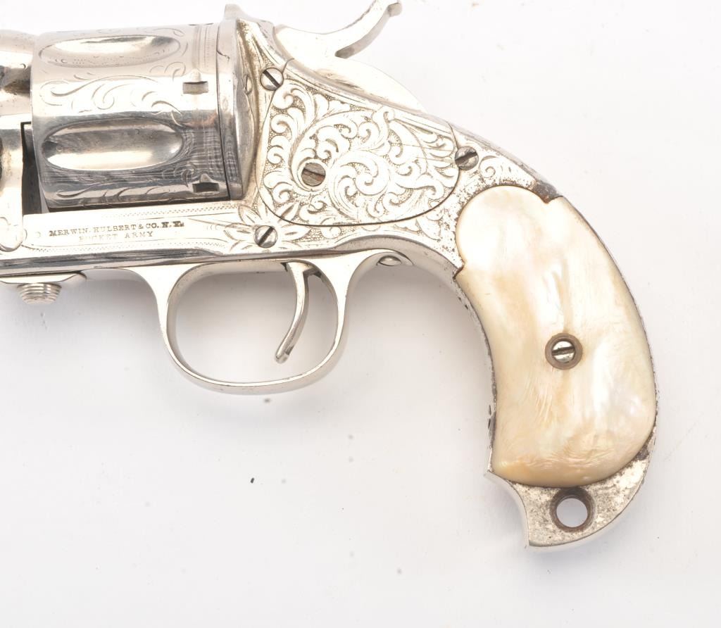 Merwin & Hulbert “Pocket Army” .44-40 caliber period N.Y. scroll style engraved and re-nickeled plated with pearl grips, S/N 1706. The frame markings are good and the finish is old with 95% remaining with somesmall areas of rust and erosion where nickel has flaked and metal was exposed. The areas of loss are small and mostly confined to the backstrap. The original grips are very good plus. The action is cocking but not lockingup. The bore is fair and shows wear. The barrel locks up tight on the frame. Finer original engraving than normally found. Western frontier era. Antique Est.: $2000-4000