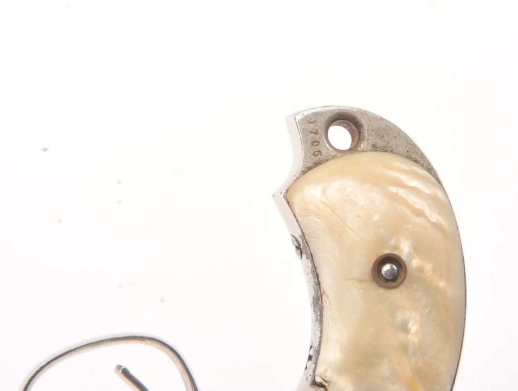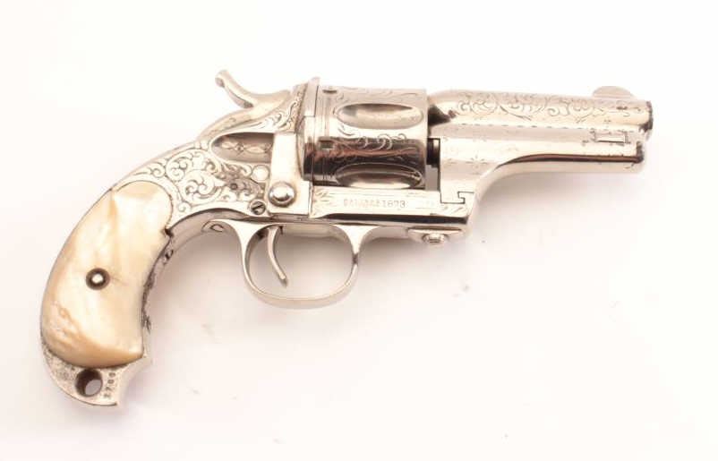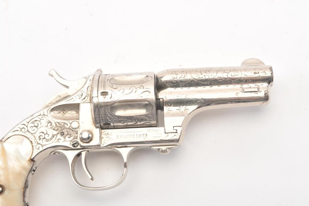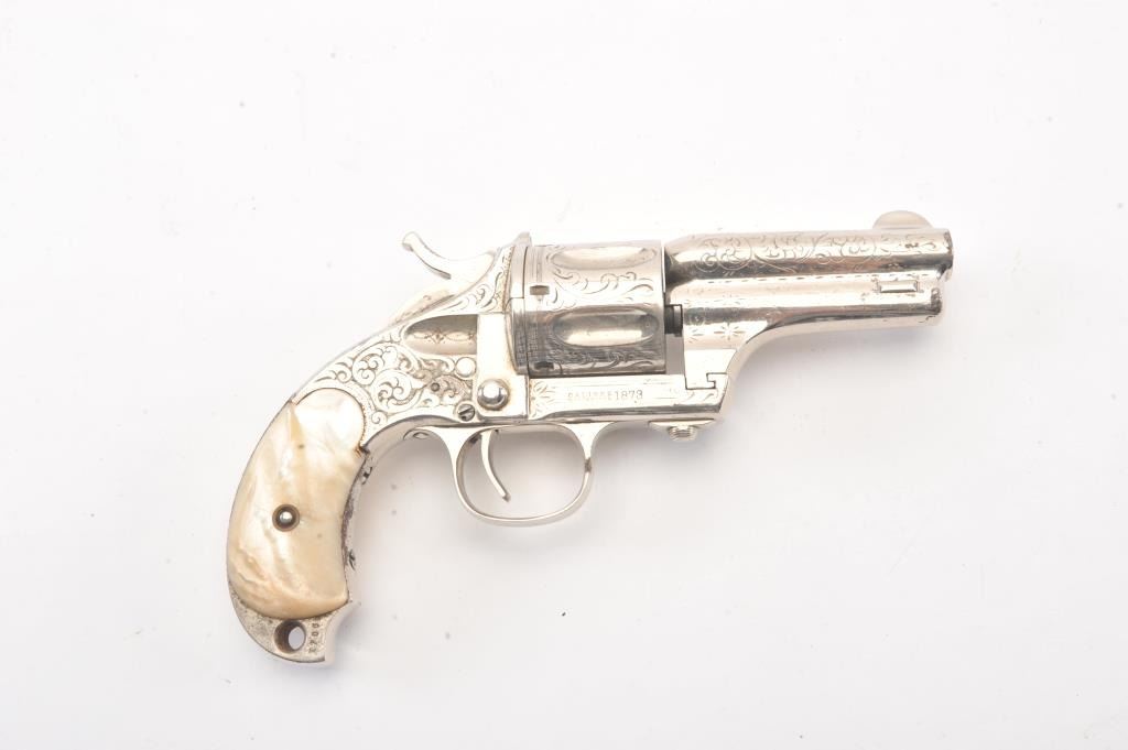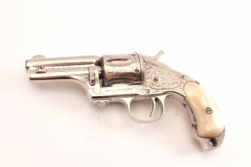 Merwin & Hulbert “Pocket Army” .44-40 caliber period N.Y. scroll style engraved and re-nickeled plated with pearl grips, S/N 1706. The frame markings are good and the finish is old with 95% remaining with somesmall areas of rust and erosion where nickel has flaked and metal was exposed. The areas of loss are small and mostly confined to the backstrap. The original grips are very good plus. The action is cocking but not lockingup. The bore is fair and shows wear. The barrel locks up tight on the frame. Finer original engraving than normally found. Western frontier era. Antique Est.: $2000-4000
