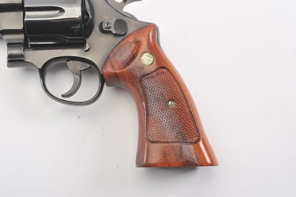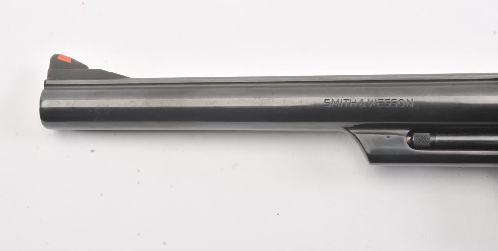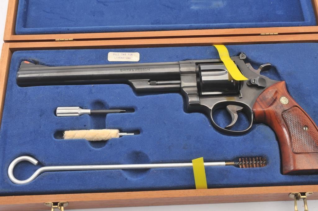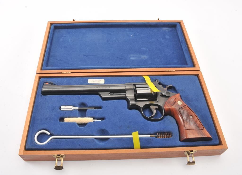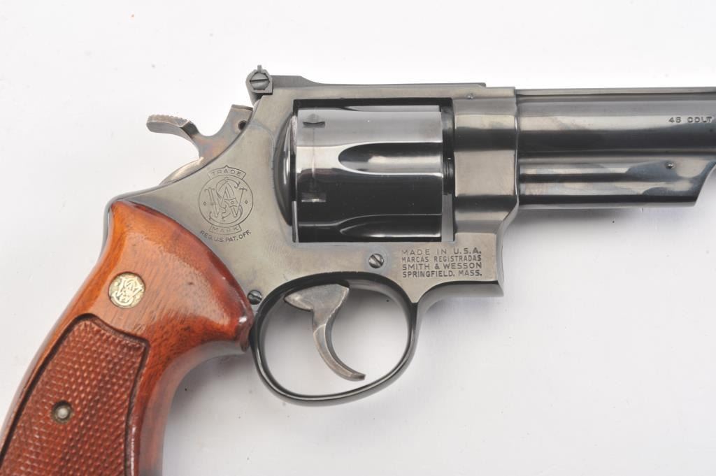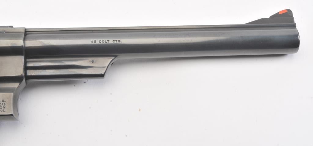Cased Smith & Wesson Model 25-5 double action revolver, .45 caliber, Serial #M660200. The pistol is in excellent overall condition with an 8 3/8” pinned barrel with an orange ramped blade front and adjustable rearsights. The pistol retains approximately 90%-95% of the original finish with light handling marks. The hammer and trigger are both beautifully case hardened. The smooth wood medallion grips are in excellentcondition with sharp checkering. The bore is good, the action is crisp and the markings are sharp. The lot includes a factory wooden case with blue velvet interior, screwdriver and cleaning equipment. Est.:$800-$1,600. (Modern/PPT).