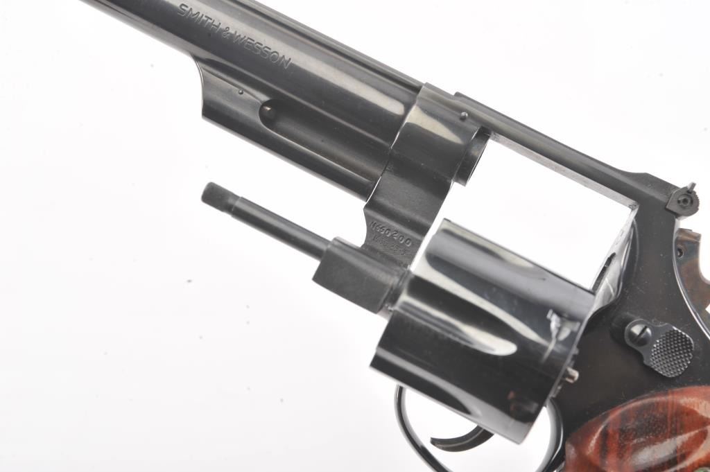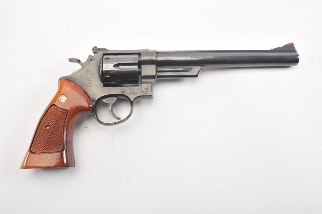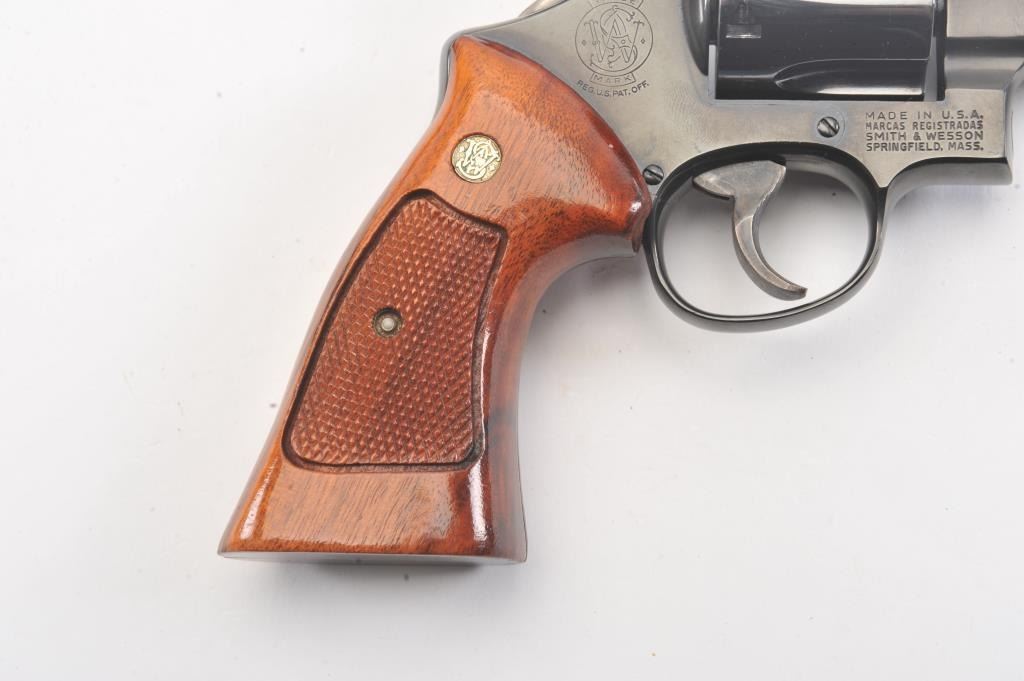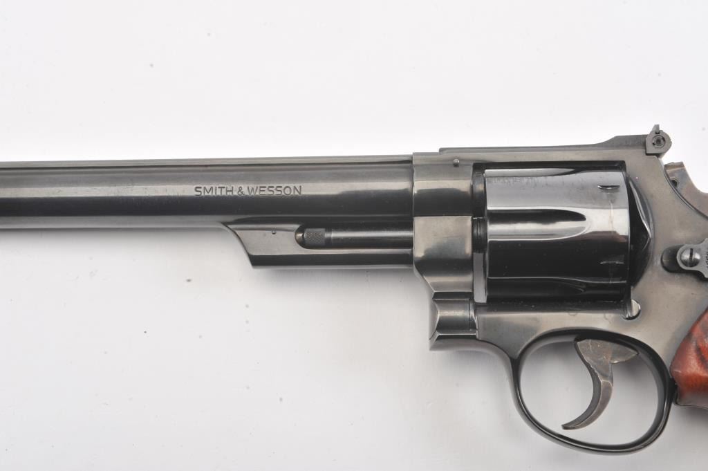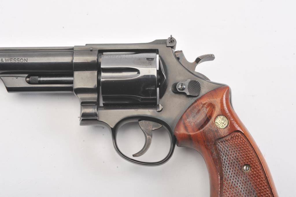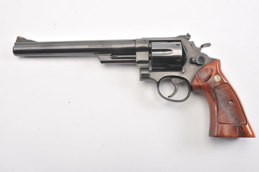 Cased Smith & Wesson Model 25-5 double action revolver, .45 caliber, Serial #M660200. The pistol is in excellent overall condition with an 8 3/8” pinned barrel with an orange ramped blade front and adjustable rearsights. The pistol retains approximately 90%-95% of the original finish with light handling marks. The hammer and trigger are both beautifully case hardened. The smooth wood medallion grips are in excellentcondition with sharp checkering. The bore is good, the action is crisp and the markings are sharp. The lot includes a factory wooden case with blue velvet interior, screwdriver and cleaning equipment. Est.:$800-$1,600. (Modern/PPT).
