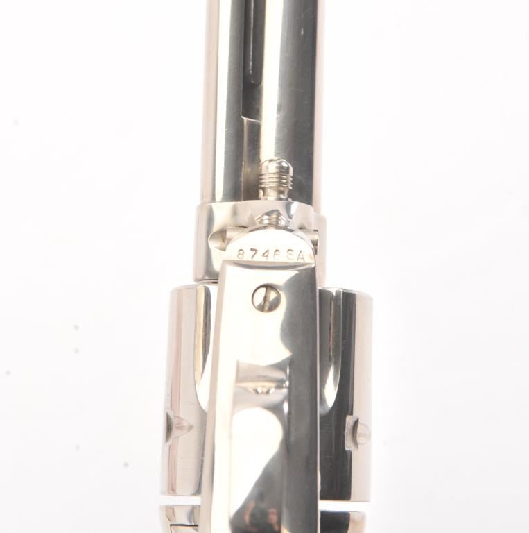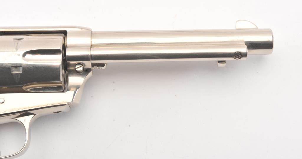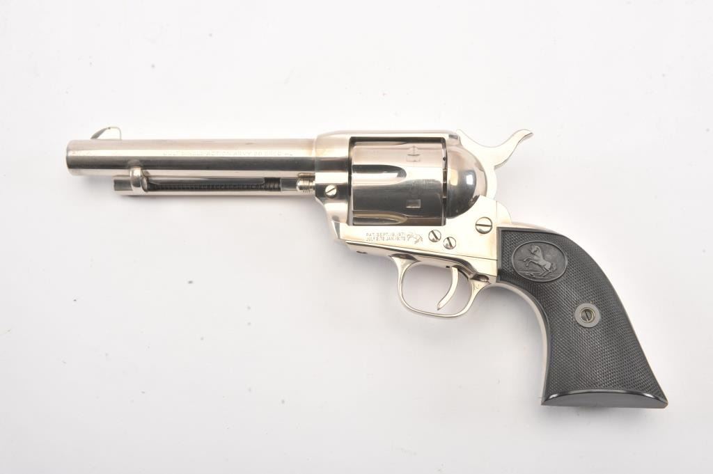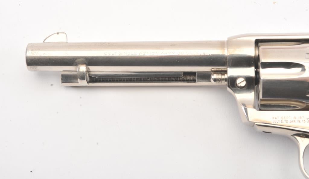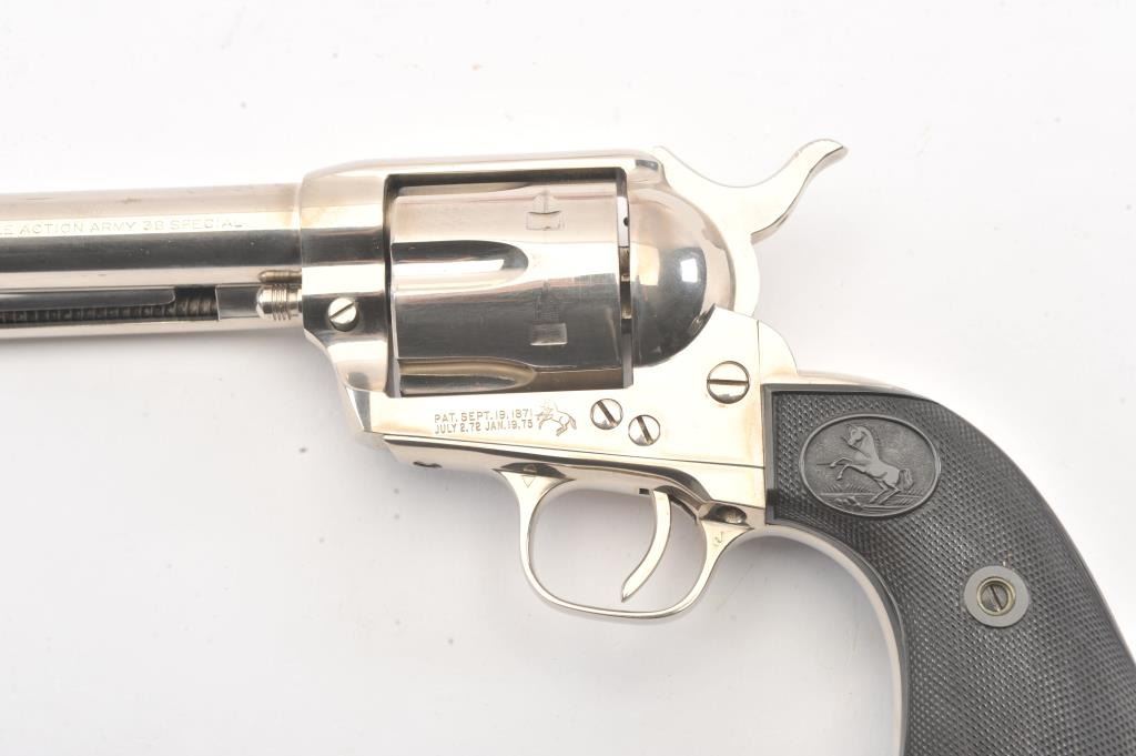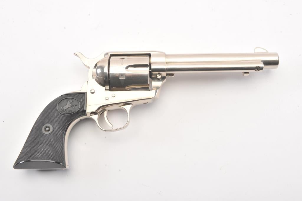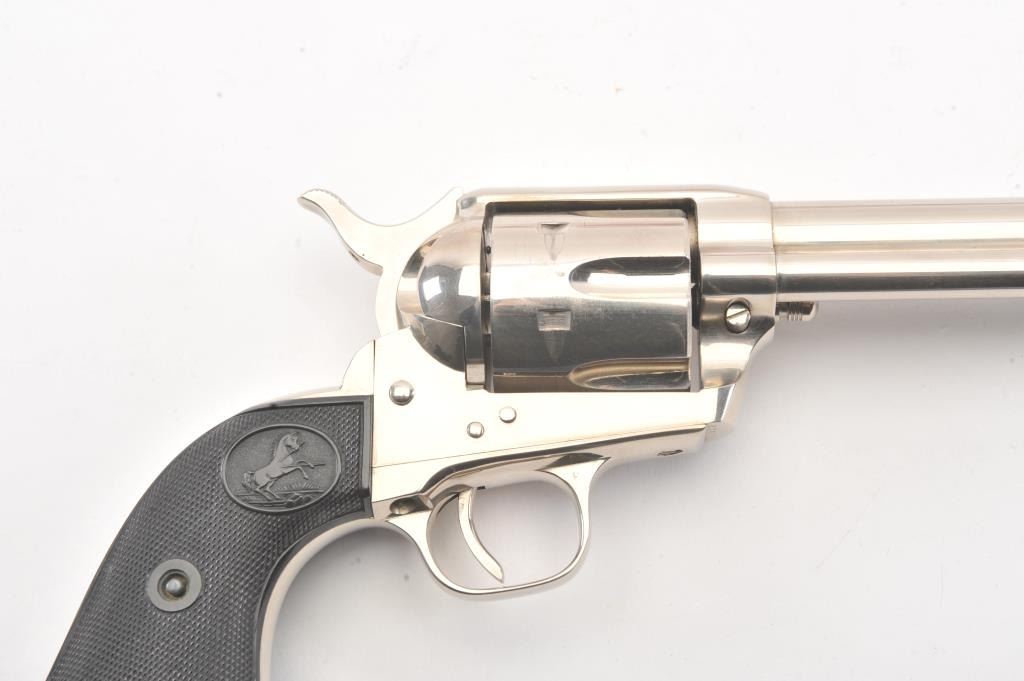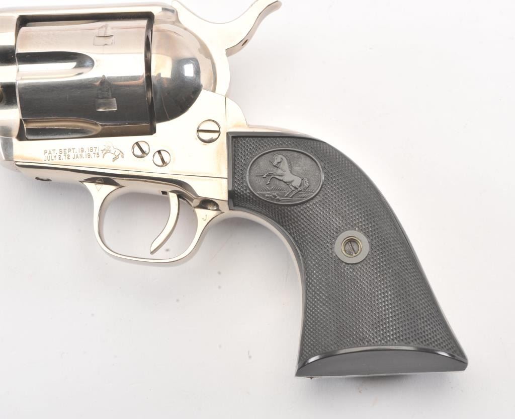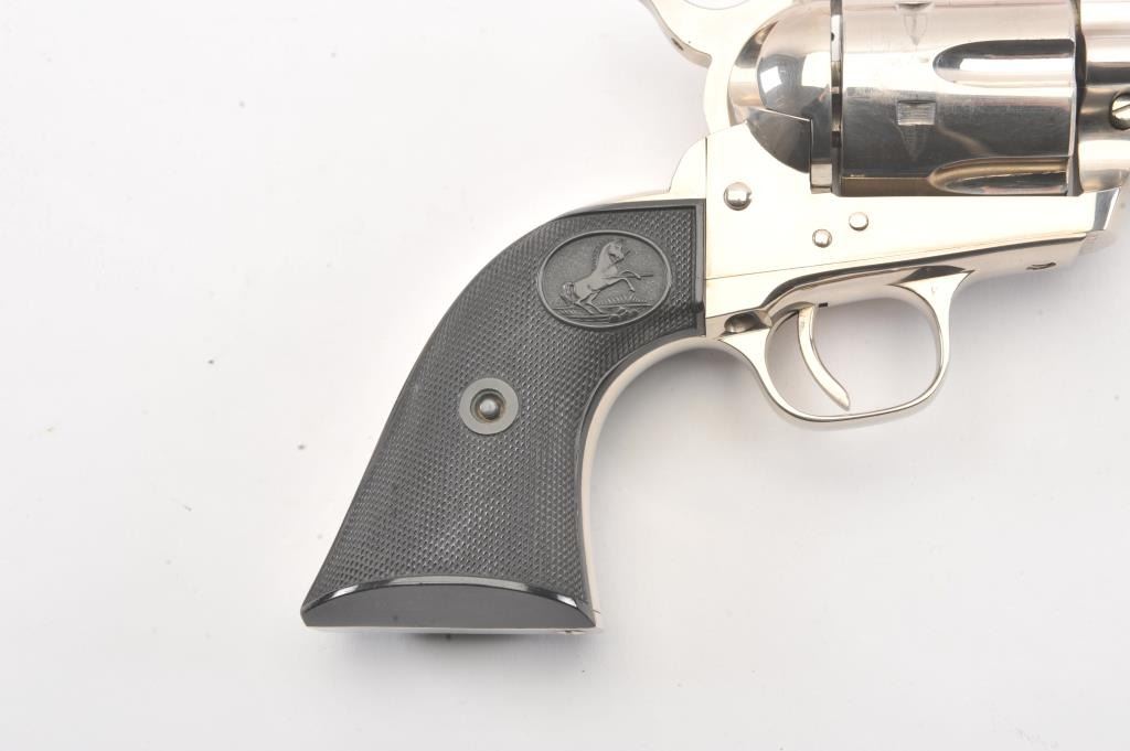 Colt SAA 2nd Generation revolver, .38 Special caliber, Serial #8746SA. The pistol is in fine to nearly excellent overall condition with a 5 ½ā€¯barrel. The pistol retains nearly all of the original factory nickel finishwith light handling marks. The checkered plastic grips are in excellent condition with sharp checkering, showing little use. The bore is good, the action is crisp and the markings are sharp on this sharp factorynickel 2nd Gen. Est.: $1,250-$2,500. (Modern).