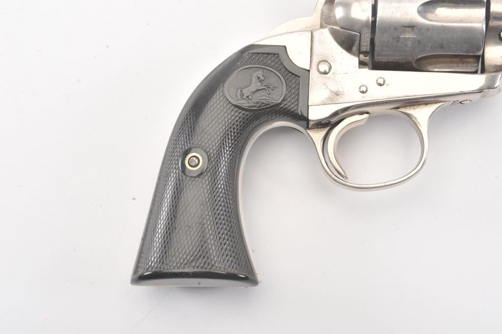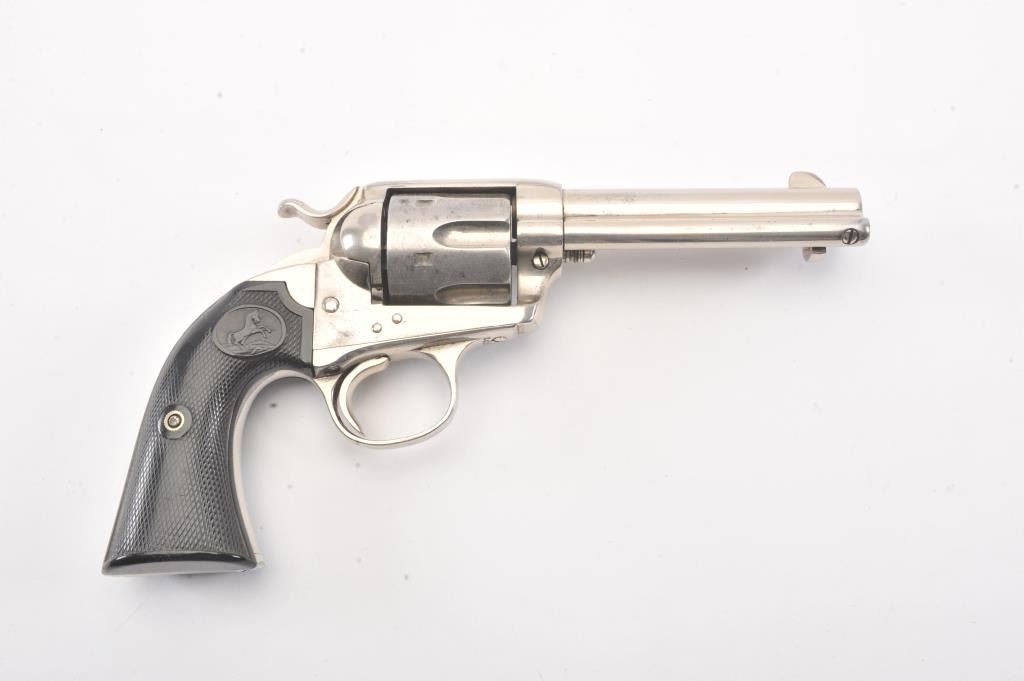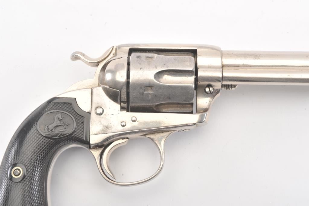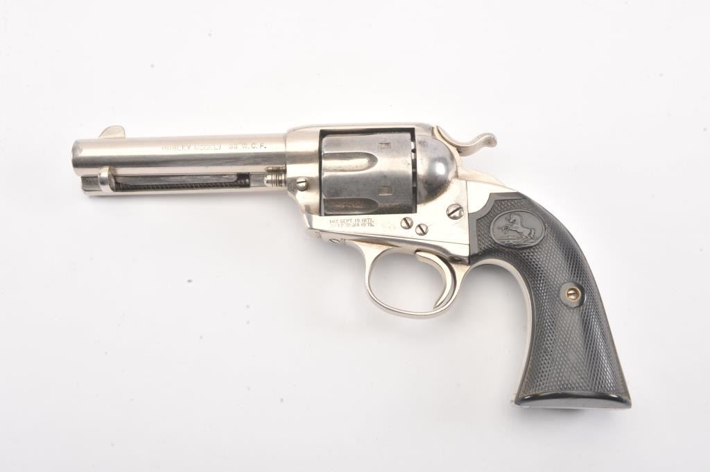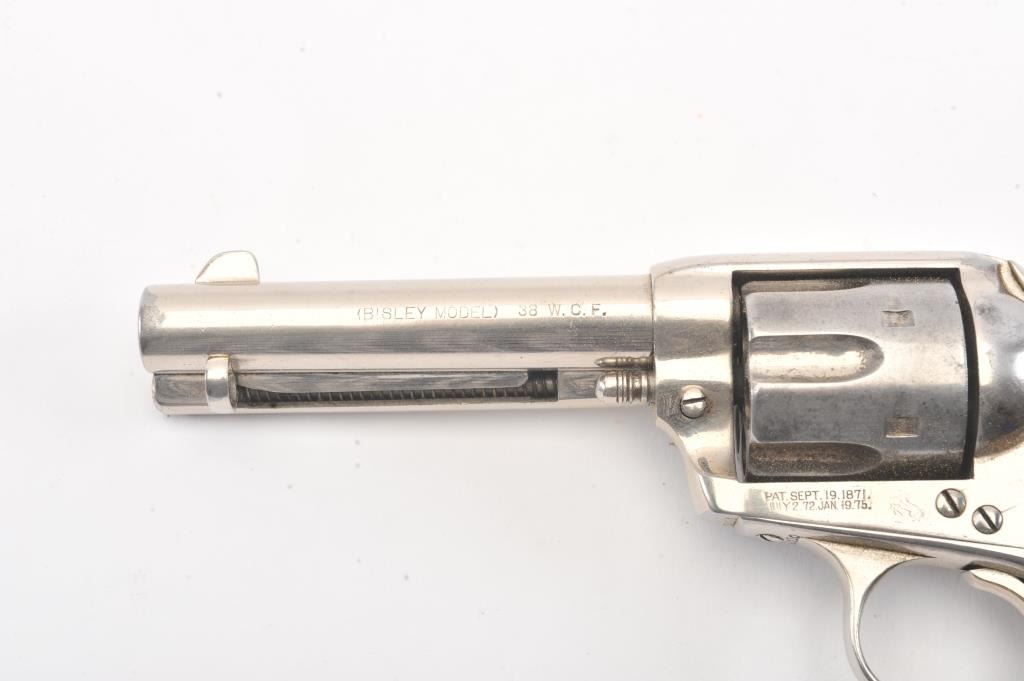 Colt Bisley Model Single Action revolver, .38 WCF caliber, #242210, 4-3/4” barrel, old re-nickeled finish, checkered hard rubebr grips. This gun is in overall good condition showing an older re-finish with holster wearand scattered pin prick pitting; good + bore, good action, correct “Bisley Model” marking on left side of barrel; checkered grips are overall good but are slightly oversized for this gun. An early Bisley that should be factory lettered. Factory letter found for this gun Est.: $800-1600.