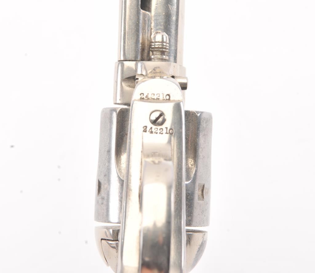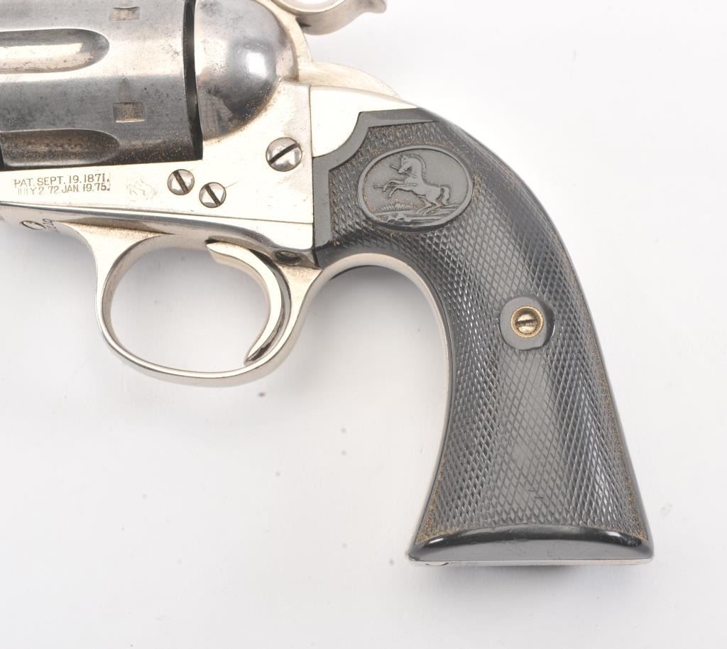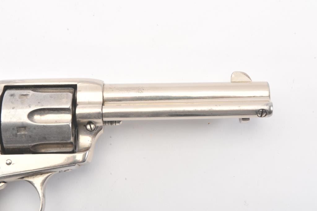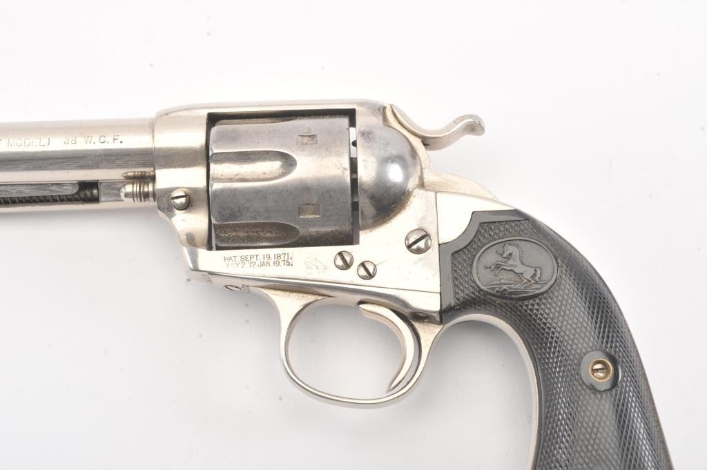 Colt Bisley Model Single Action revolver, .38 WCF caliber, #242210, 4-3/4” barrel, old re-nickeled finish, checkered hard rubebr grips. This gun is in overall good condition showing an older re-finish with holster wearand scattered pin prick pitting; good + bore, good action, correct “Bisley Model” marking on left side of barrel; checkered grips are overall good but are slightly oversized for this gun. An early Bisley that should be factory lettered. Factory letter found for this gun Est.: $800-1600.