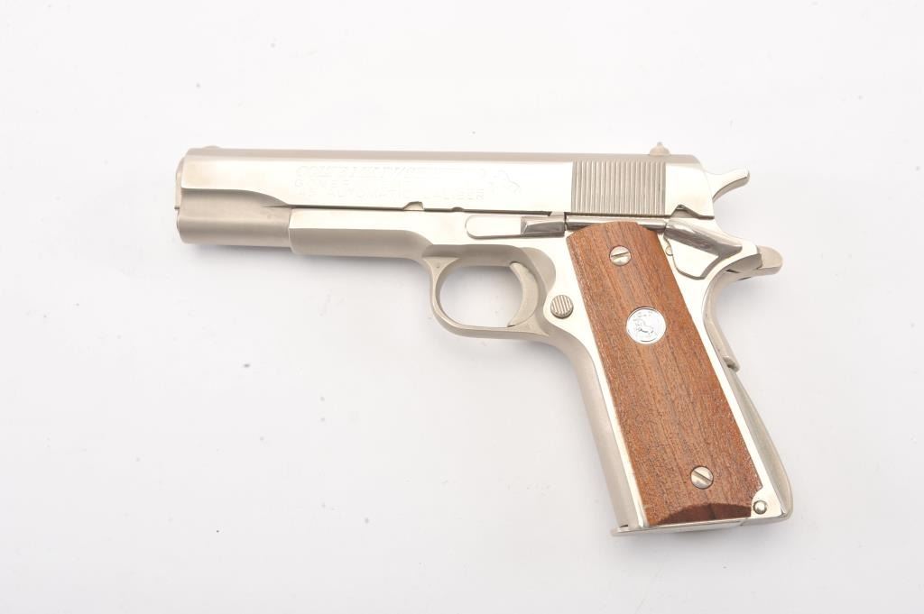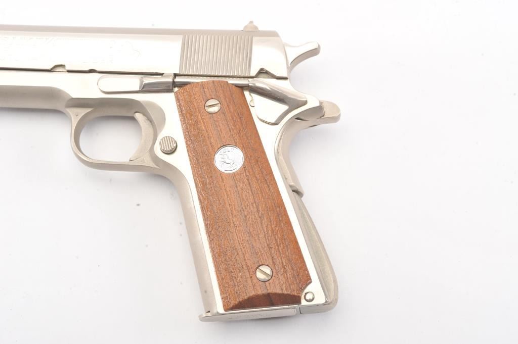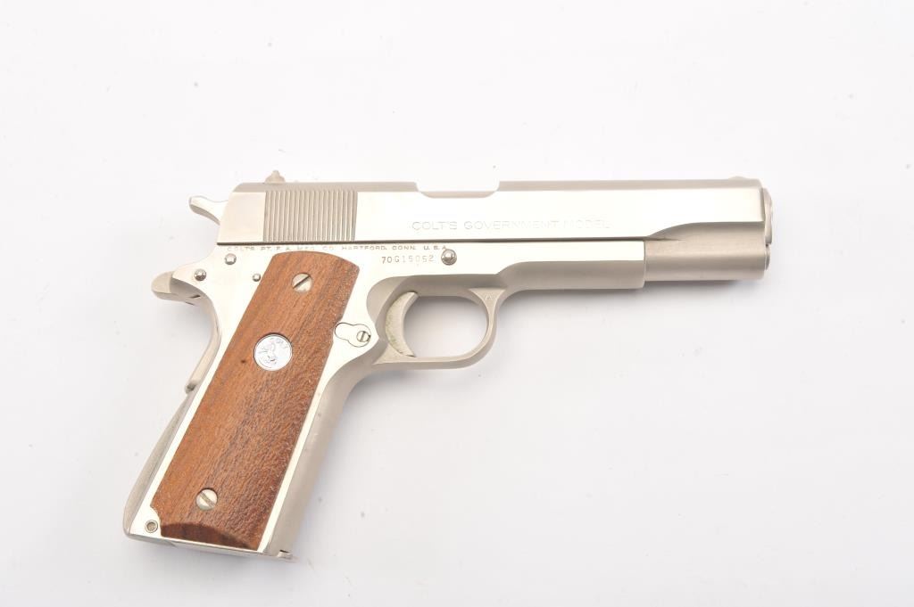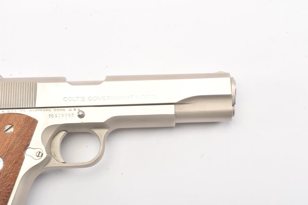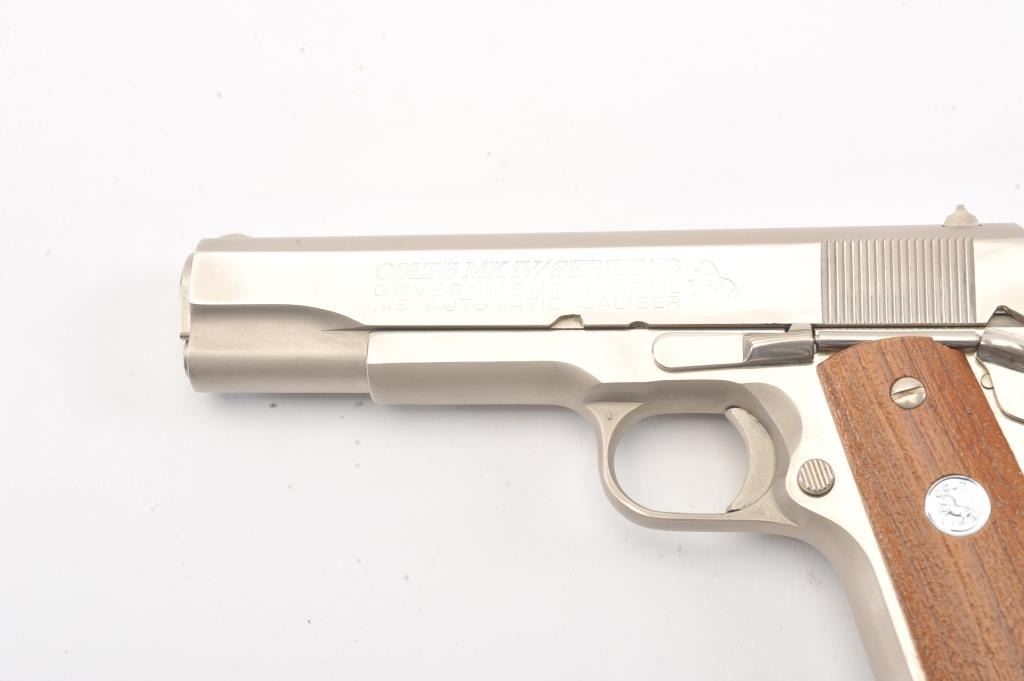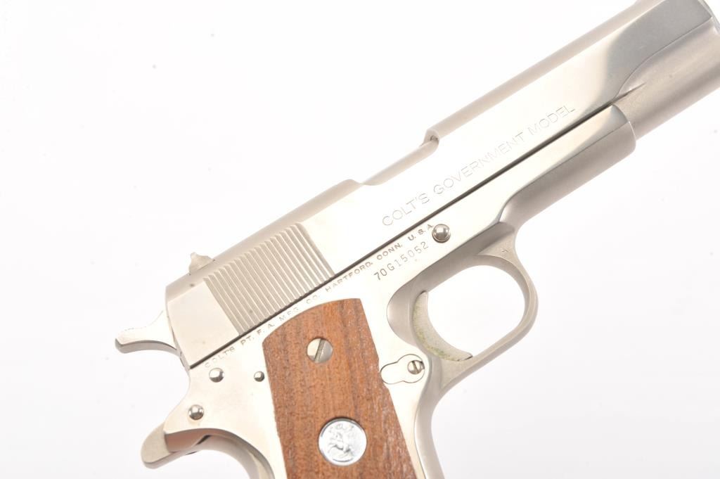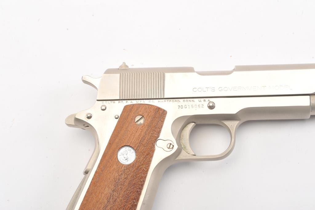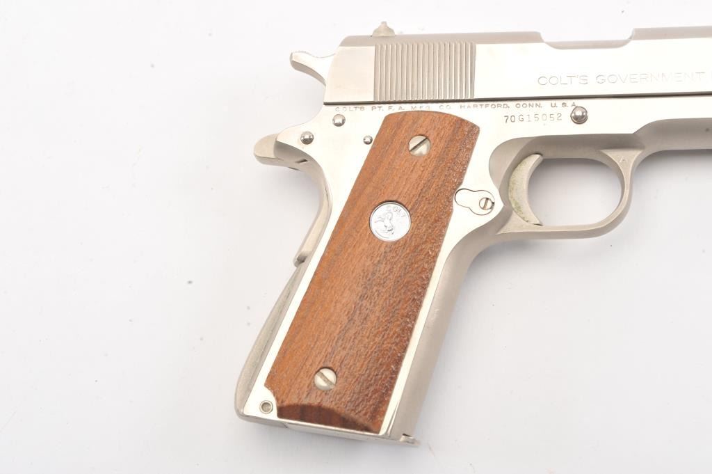 Colt Mark IV/Series 70 Government Model semi-auto pistol, #70G15052, .45 cal., 5” barrel, nickel finish, smooth wood medallion grips. Pistol is in overall fine condition showing limited use with approx. 99%+original finish, which is toning and in need of cleaning. Fine bore, action, markings and grips. A very desirable Series 70 Colt. One correct mag included. (Modern/PPT). Est.:$700-$1,400.